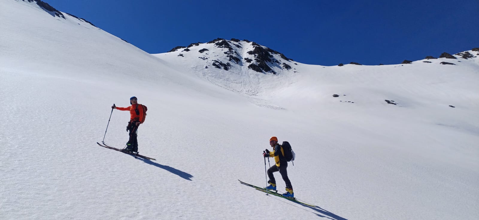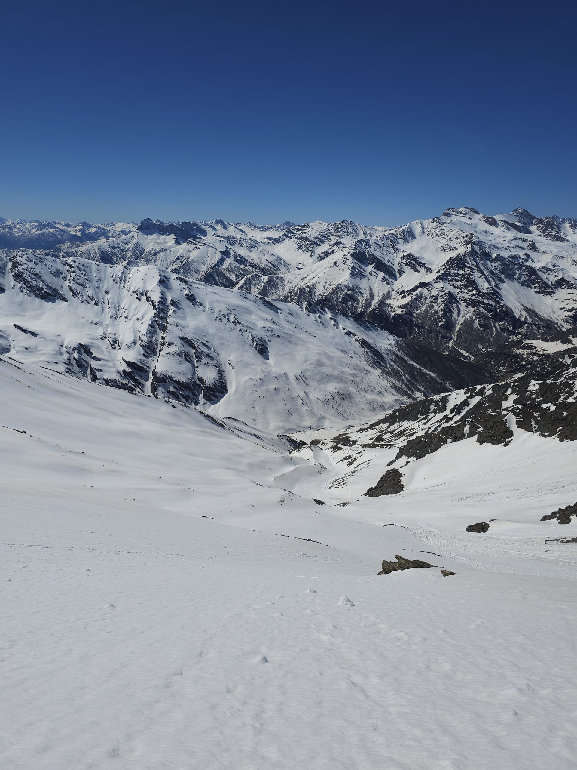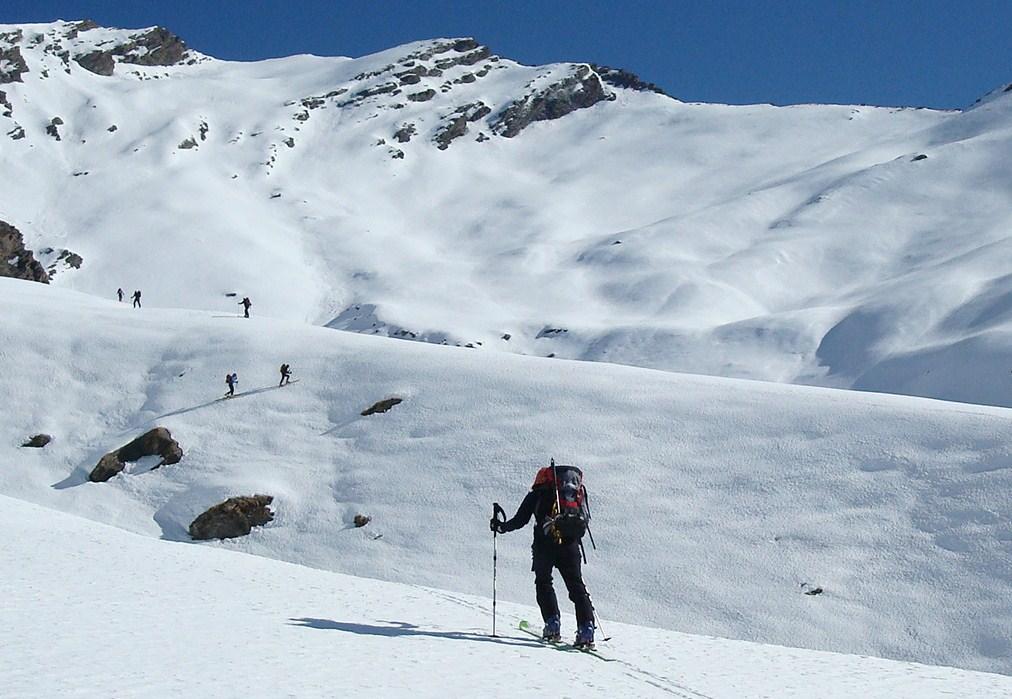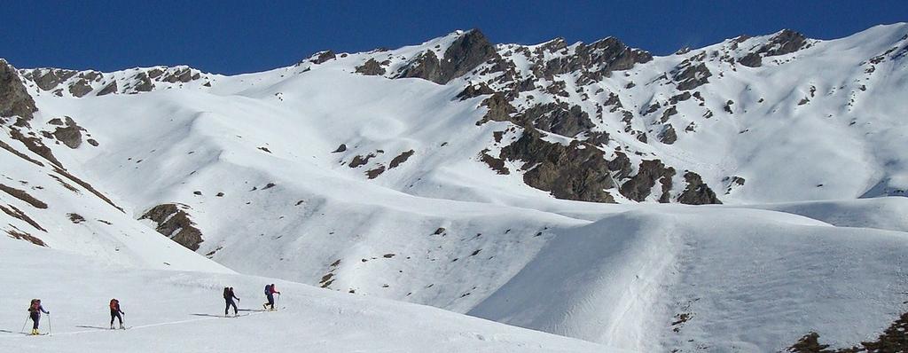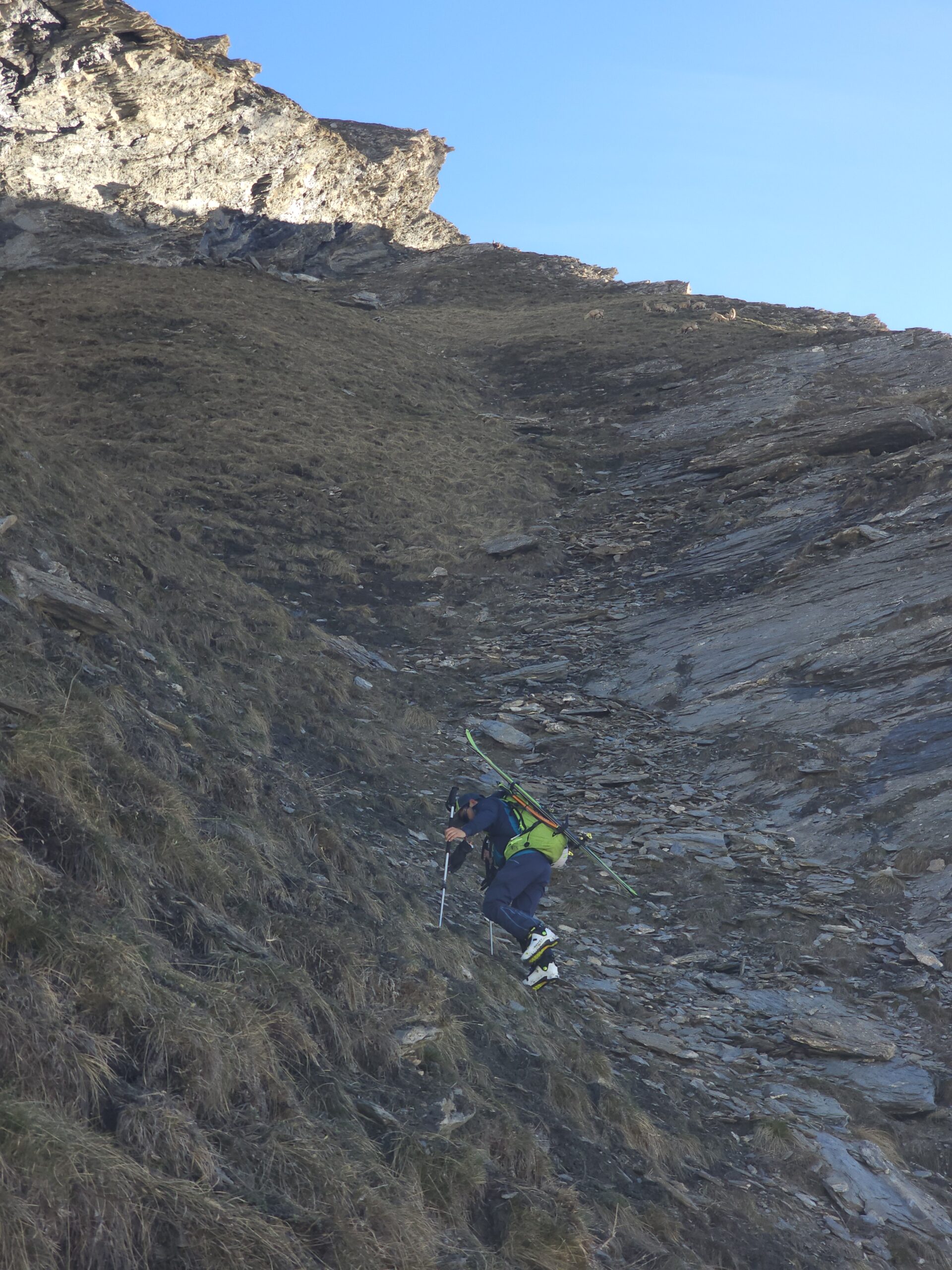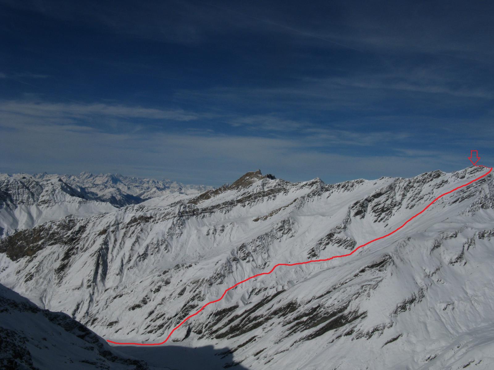 Si svolta a SX del secondo gruppo di case presente nel pianoro risalendo un erto canale (circa 200 mt) alla fine del quale ci si sposta a DX attraversando alcuni avvallamenti per raggiungere il fondo del vallone del Pis che si risale su pendii molto sostenuti nel suo fondo o sulla dorsale di DX. Raggiunta l’insellatura tra lo spallone EST e la cima si lasciano gli sci e per breve e aerea crestina si sale in vetta.