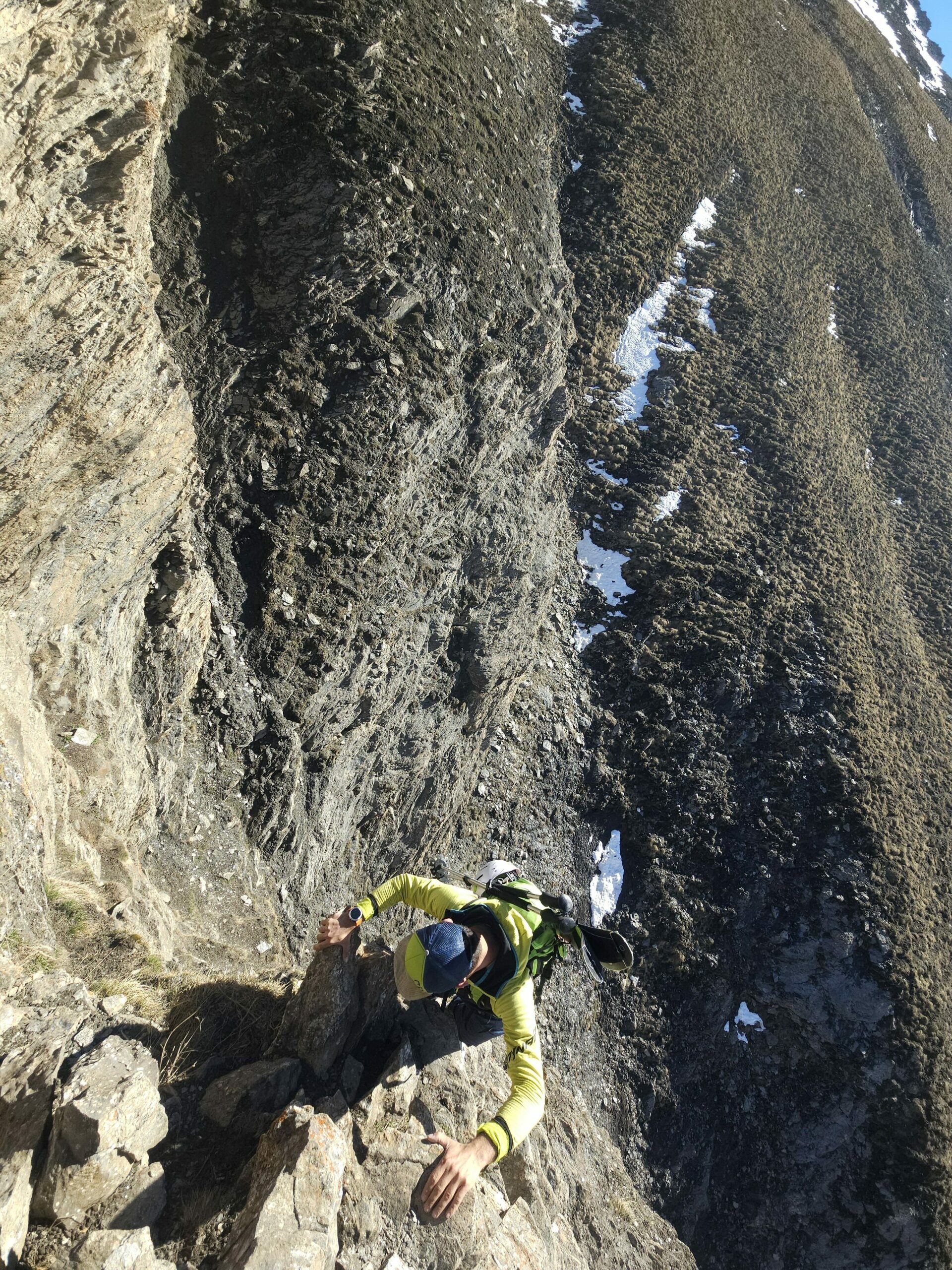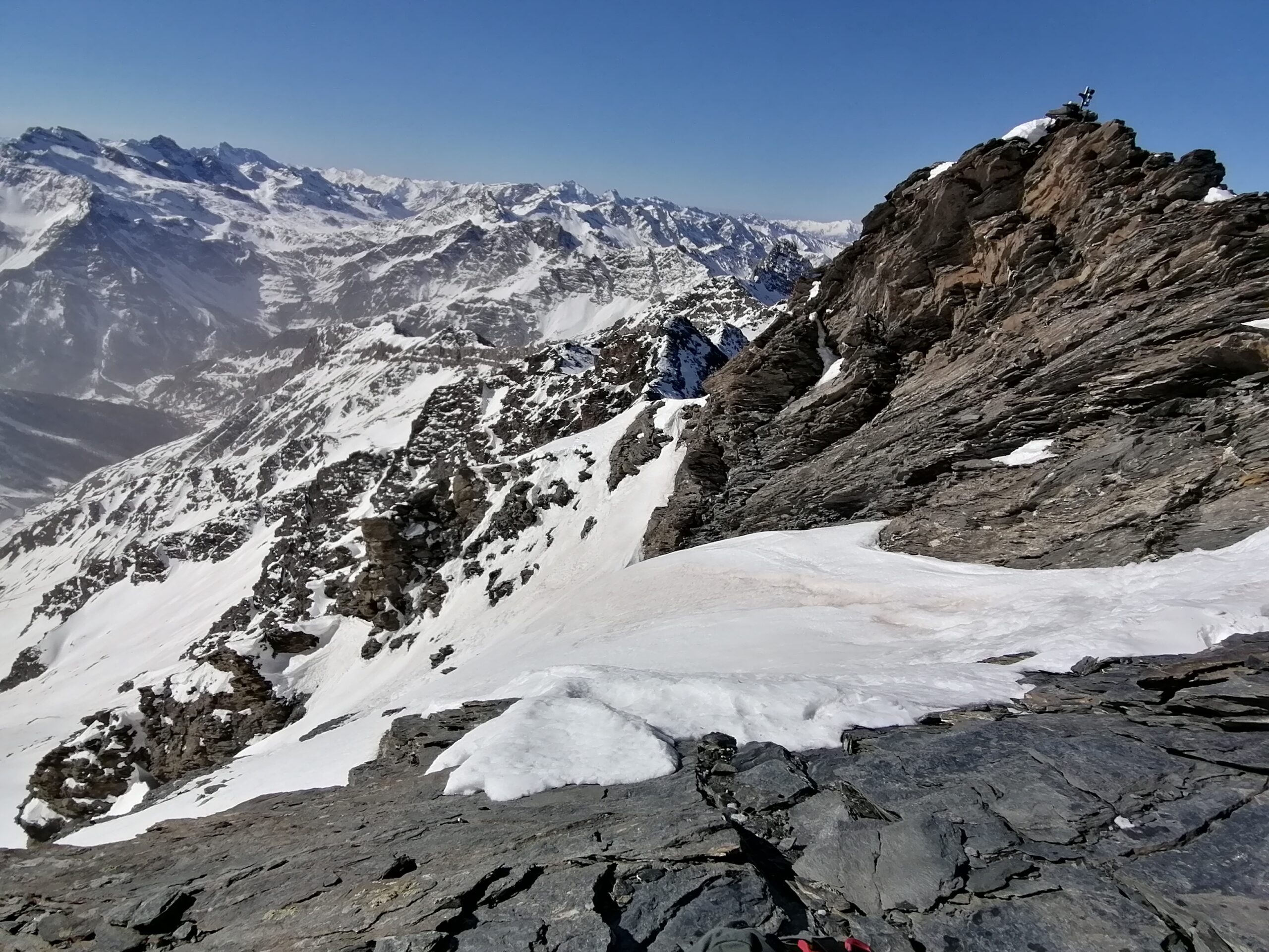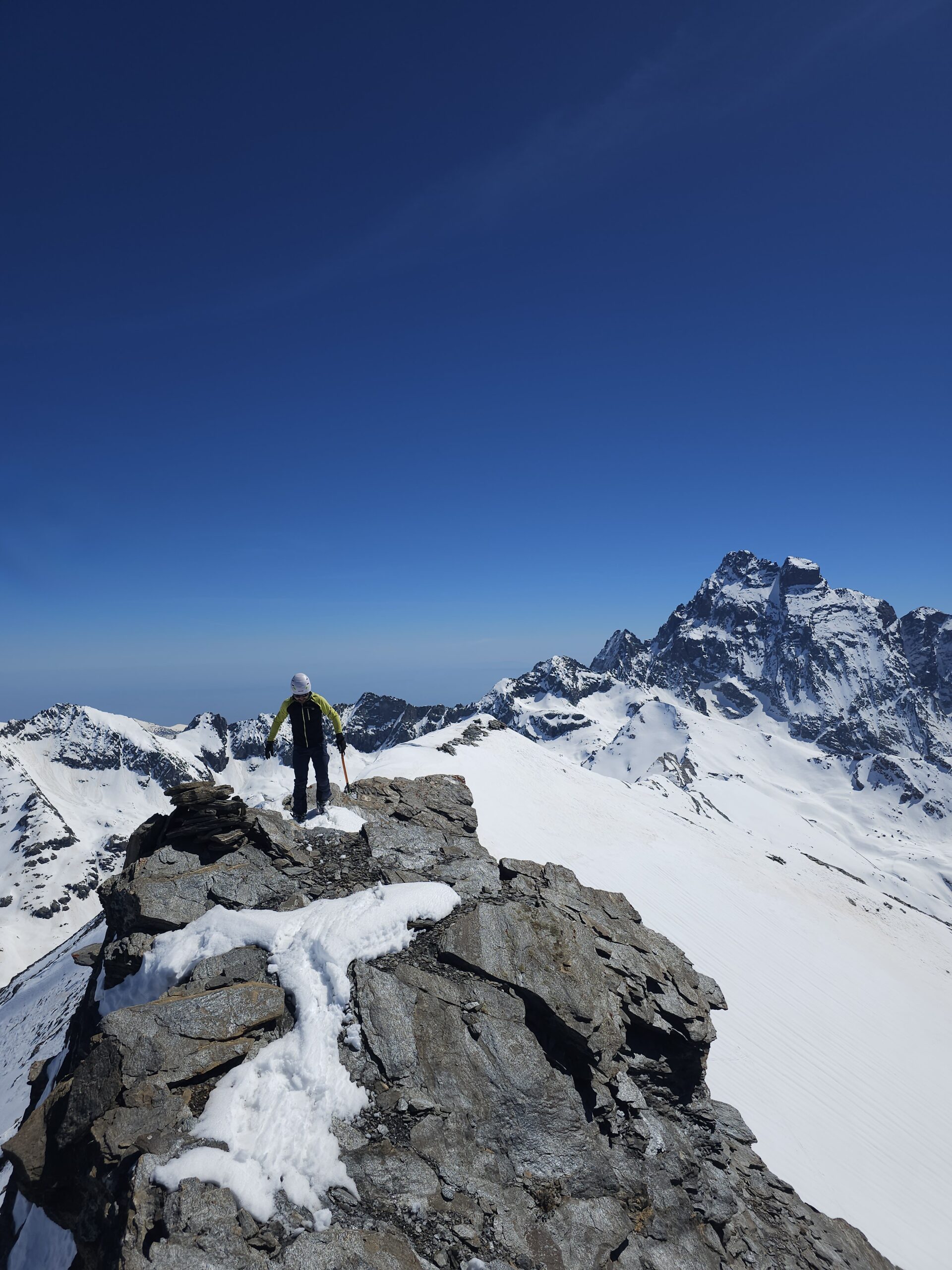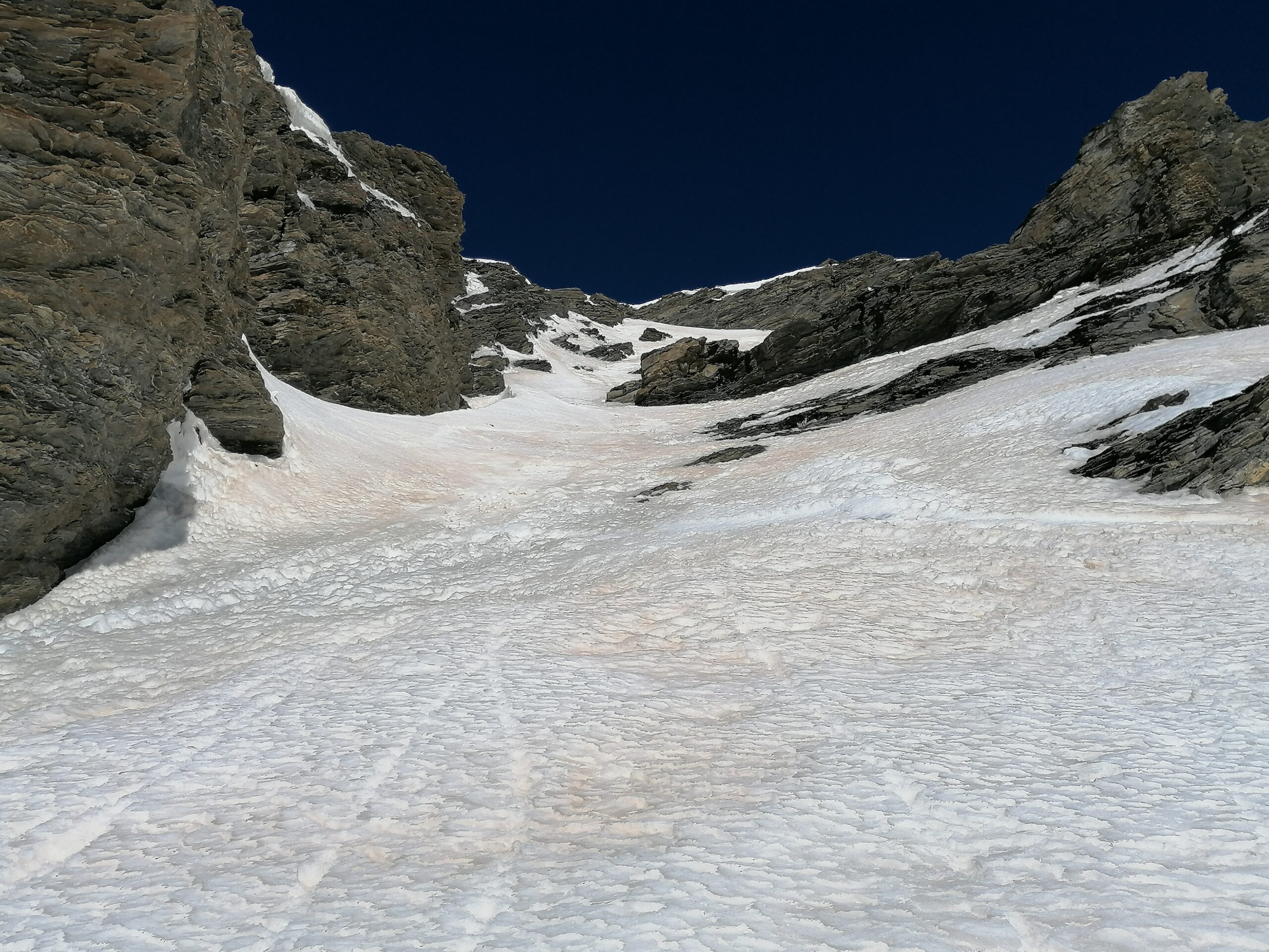 Si svolta a SX del secondo gruppo di case presente nel pianoro risalendo un erto canale (circa 200 mt) alla fine del quale ci si sposta a DX attraversando alcuni avvallamenti per raggiungere il fondo del vallone del Pis che si risale su pendii molto sostenuti nel suo fondo o sulla dorsale di DX. Raggiunta l’insellatura tra lo spallone EST e la cima si lasciano gli sci e per breve e aerea crestina si sale in vetta.