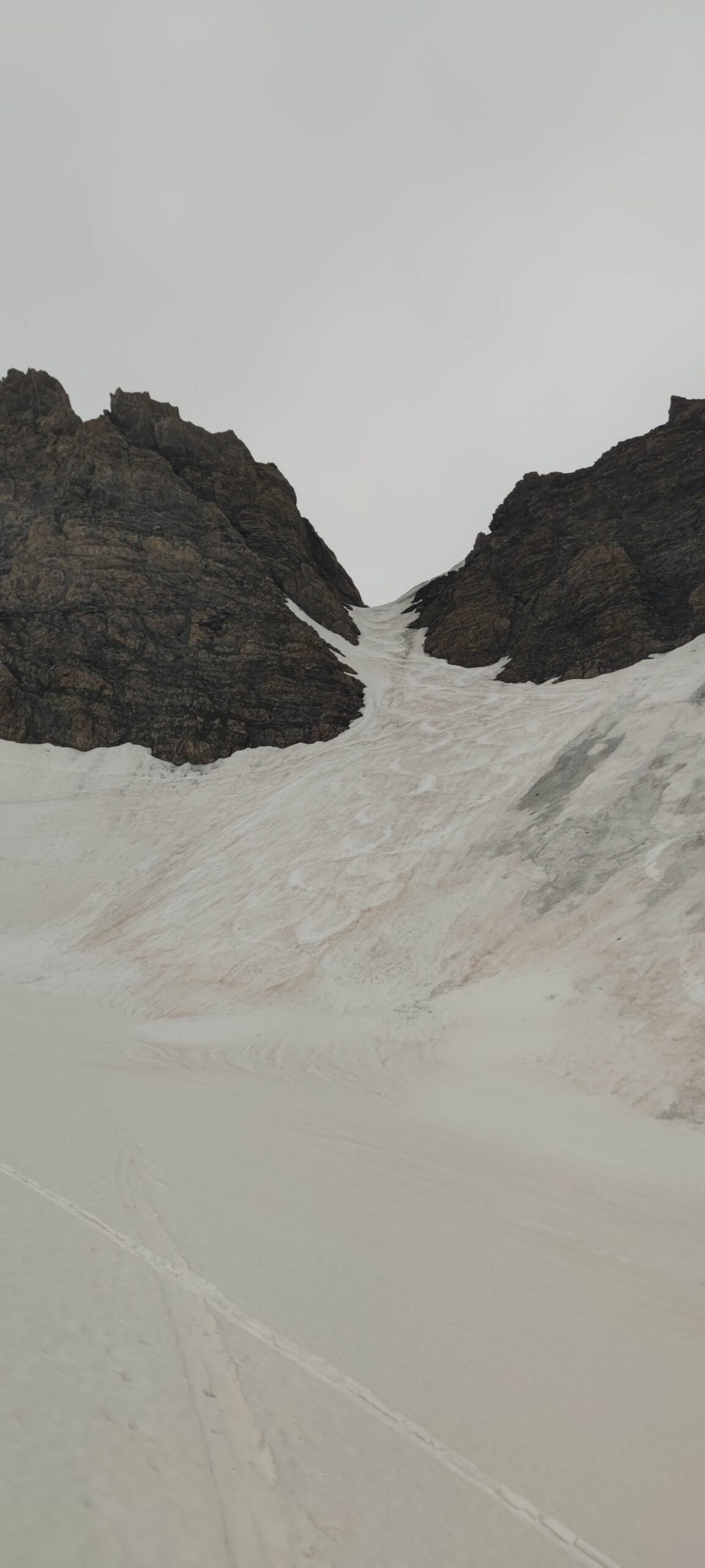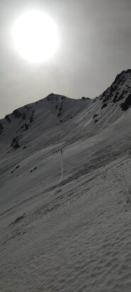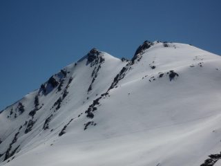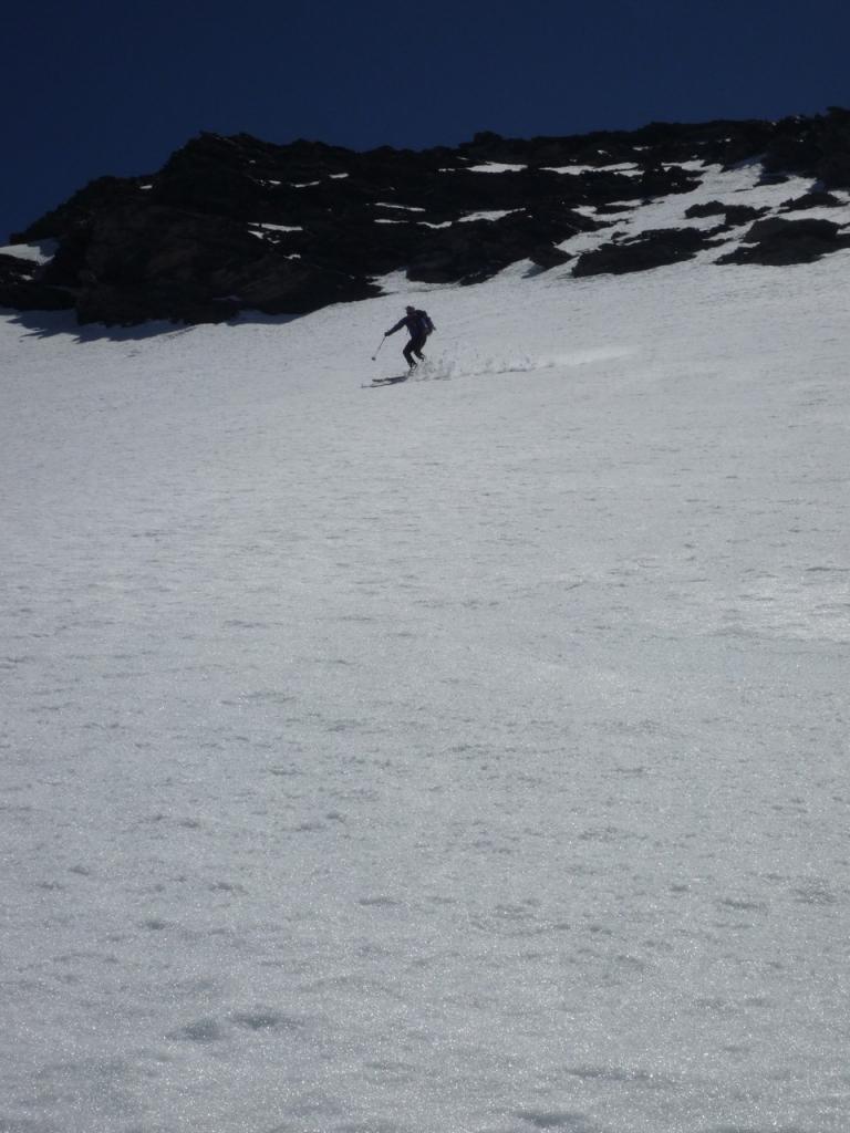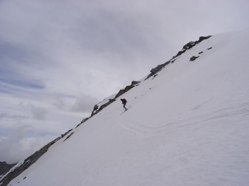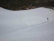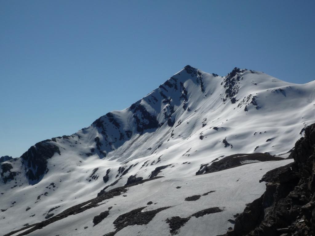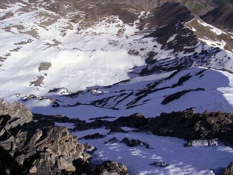 Disceso il canalino dalla Breche scendere ancora in direzione Est sino a quota 2685 m.ca. Rimontare ora la bella conca, l’unica che facilmente vi condurrà alla base della ombrosa parete NW.