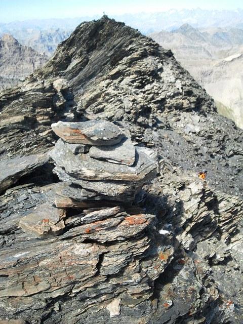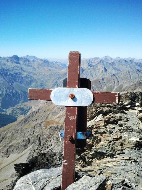 Caldo fortissimo anche sopra i 3000, oggi non c’era scampo. In breve sulla Sella, passati sul Pic Brusalana, da lì per cresta alternativamente lato italiano e francese, sempre in mezzo alle losette sfasciumose (non una bella roccia), fino alla croce. In Cima non un filo d’aria, pranzo e panorama dal Viso al Rosa. Decidiamo per l’anello: superiamo la vetta con ometto, ci buttiamo giù in mezzo a schifosi sfasciumi, poi scollettiamo a sx nel vallone di Soustra, dove scendendo ritroviamo il sentiero. Un grazie alla coppia di Pinerolo che ha evitato che ci facessimo 5km e 500m disl su asfalto per recuperare la macchina al laghetto.