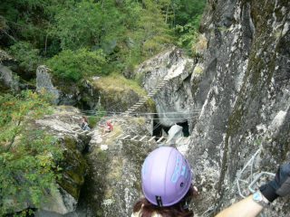 E’ stata terminata la ferrata. Al momento funzionante e molto frequentata.La prima parte già descritta facile per bambini e adulti principianti.La seconda e terza parte più atletica.Ambiente splendido,il torrente scorre in una stretta gola di roccia compatta modellata e levigata dall’acqua. Nella seconda parte un traverso ,un ponte delle scimmie e un’altro aereo traverso un po’ tira braccia che arriva ad un masso incastrato. La terza parte si sviluppa in un ambiente più ampio ,prima un traverso e poi si risale un muro con due passaggi strapiombanti. Si ritorna su un sentiero ben segnato in 20 min. Tempo di percorrenza totale A/R: 2 h e 1/2 -3h