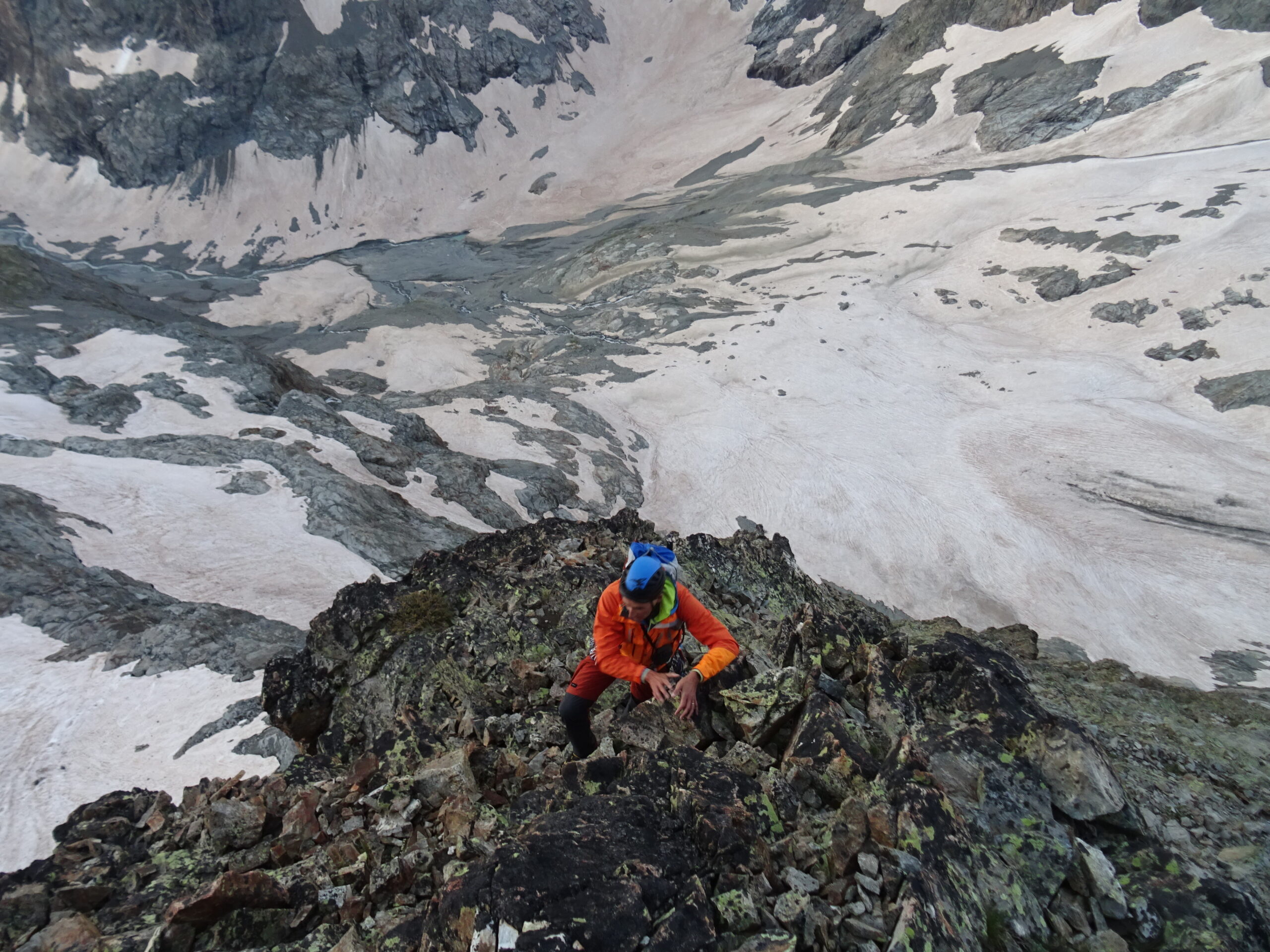 Discesa: ritornare al dosso nevoso a 3649 quindi ridiscendere lo sperone (un cordone per una doppia sopra il nevaio in uno dei tratti più impegnativi non evitabili). Oppure scendere a dx (faccia a valle – sud-ovest). Un canalino permette di raggiungere il ramo sx del ghiacciaio dell’Ailefroide (1-2 doppie su cordoni in loco in caso di ghiaccio o terminali aperte). Seguire ora il ripido ghiacciaio (40°), aggirando i crepacci fino a fondo dove compiendo un semicerchio verso sx (est) si riprende il percorso dell’andata sopra la morena iniziale.