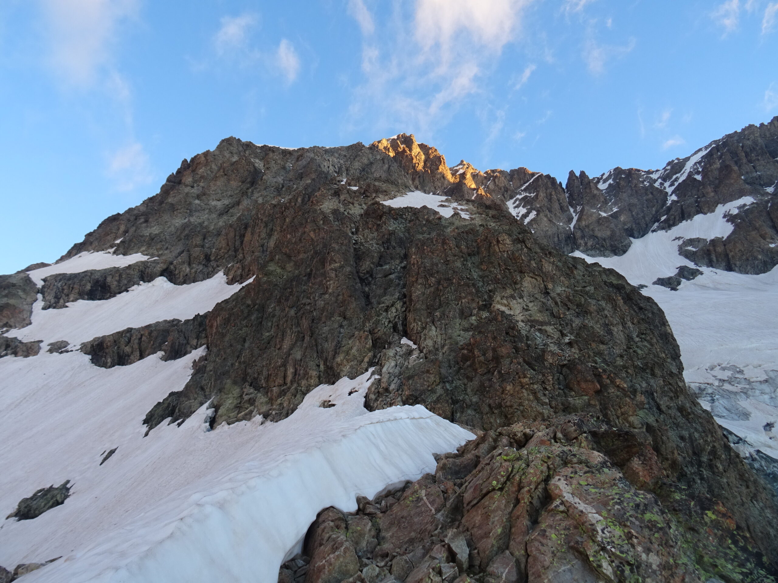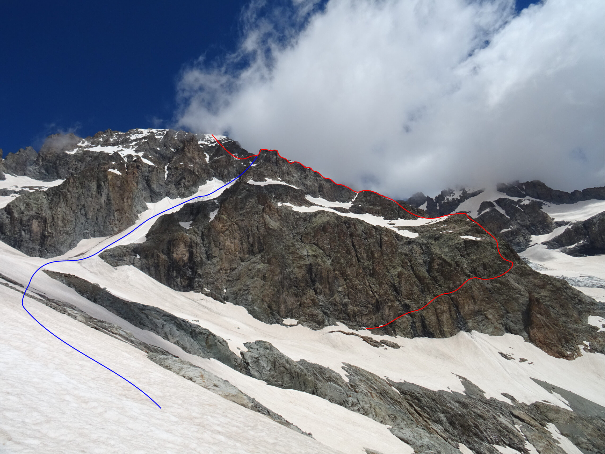 2° giorno: dal rifugio scendere nella piana verso ovest quindi costeggiare il torrente (tracce, nevai). Giunti sotto la verticale della cima salire verso nord, superando la morena prima, quindi pendii detritici o nevosi. Tenersi verso dx in direzione della muraglia rocciosa che sostiene lo sperone sud-est dal’Ailefroide occidentale. A q. 3100 m circa, a metà muraglia, individuare una cengia che taglia la parete verso dx. Imboccarla e seguirla fino al suo termina sul largo filo dello sperone. La cengia è larga e comoda e non presenta difficoltà alpinistiche, se non l’attraversamento di canalini con cascatelle che possono essere verglassati al mattino. Raggiunto lo sperone, inizialmente molto largo, lo si segue senza percorso obbligato (radi ometti). Superato un nevaio la cresta diventa più ripida e affilata, e ci si tiene leggermente lato est, nei tratti più impegnativi. Difficoltà II costante, tratti II+, passi di III. A 3649 m si mette piede su un dosso nevoso alla base del salto finale. Lo si attraversa e si imbocca un canale a sx del filo (40° in neve) che si risale fino ad un colletto a monte di un gendarmino. Si traversa ora verso sx in un altro canale più ampio che si rimonta lungamente (45 costanti tratti a 50° in neve) fino ad uscire su ripidi pendii finali (40°). A stagione inoltrata si segue la stessa via o si possono risalire gli speroni a fianco dei canali (ometti).