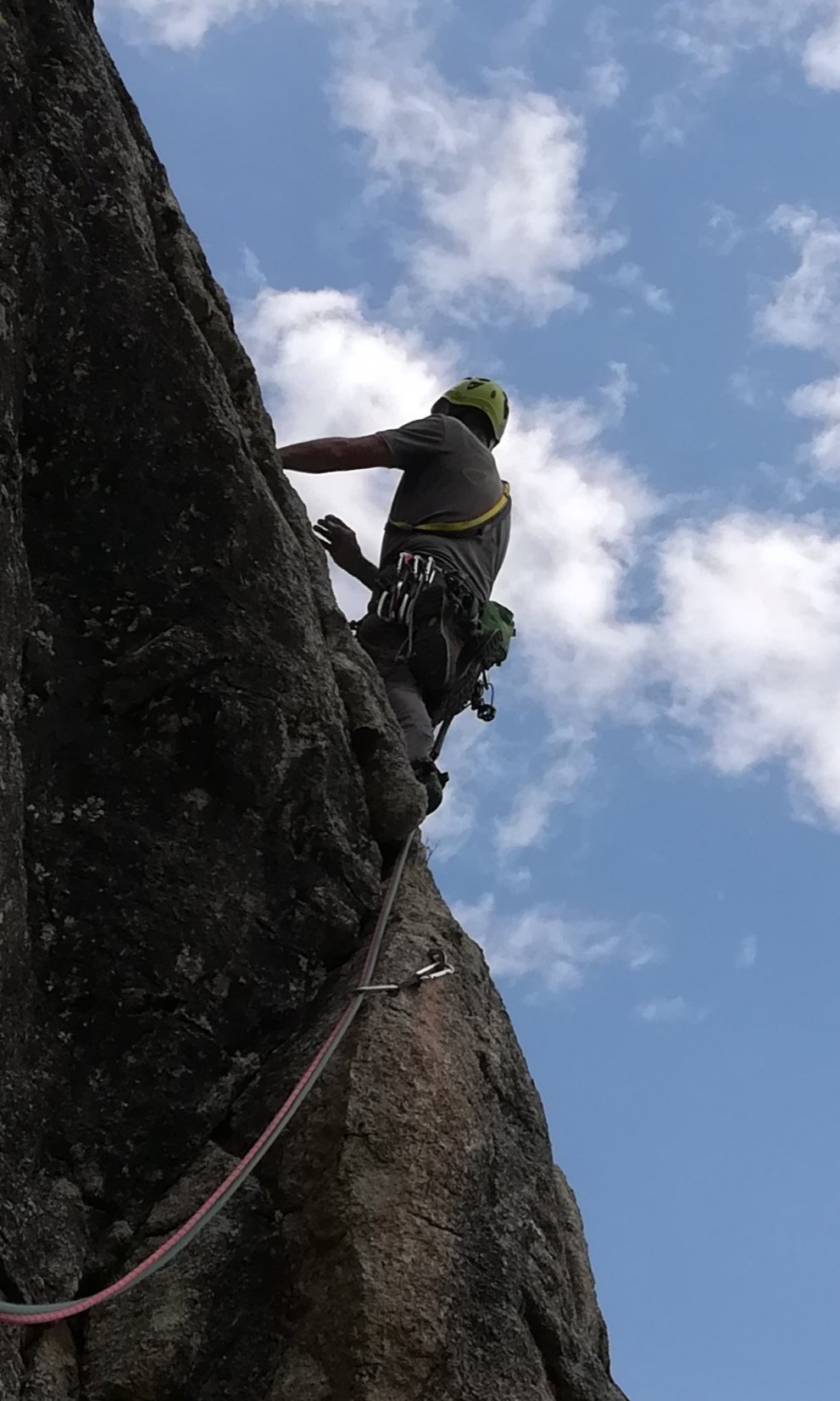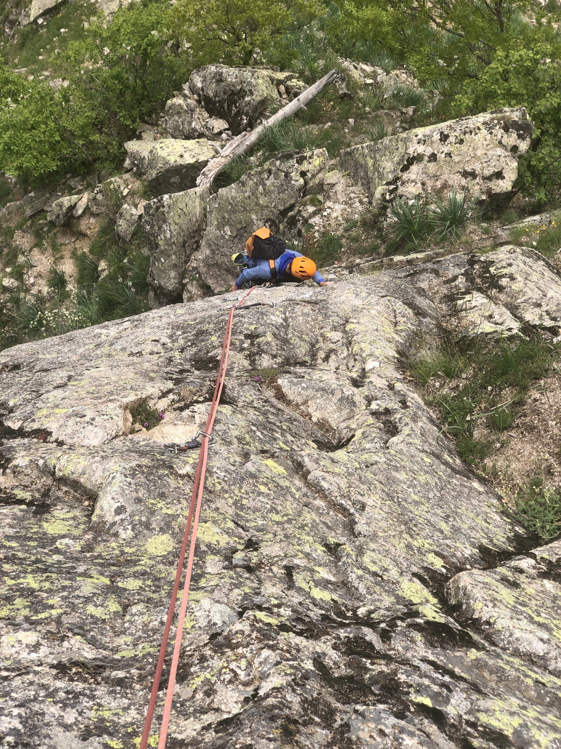 L1: 5b – placca che sale inizialmente in verticale, ma piega in un deciso traverso a destra nella parte finale. Attenzione, la sosta che appare piu’ ovvia sulla linea verticale del nostro tiro appartiene alla via Little Palavar che parte a destra, ma incrocia la nostra via nella parte finale di questo primo tiro. Inoltre, seguendo la nostra via che piega a destra, si incontra una prima sosta (da evitare) che appartiene a una variante (6a+) di Little Palavar. La nostra sosta è invece ancora piu’ a destra nel proseguo del traverso.