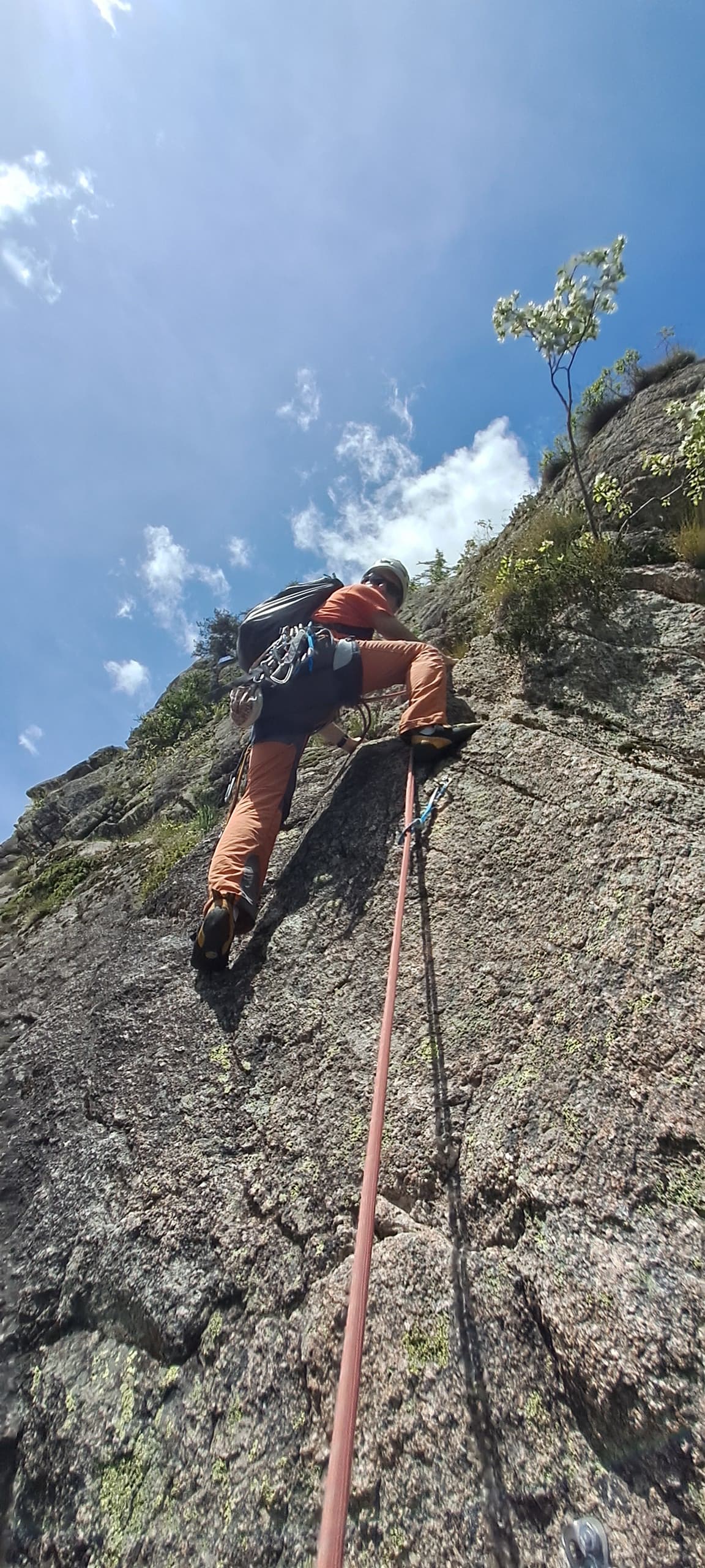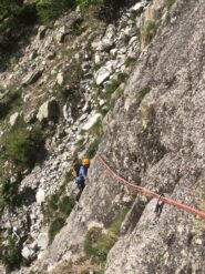 L5: 5b, corto 6a – si raggiunge una cengia, poi placca verticale che poggia verso sinistra