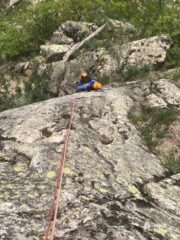 Noi ci siamo divertiti molto, oggi piuttosto caldo in parete, ma quasi nessuno a scalare. Scesi in doppia come da schema di Cambon, senza problemi.