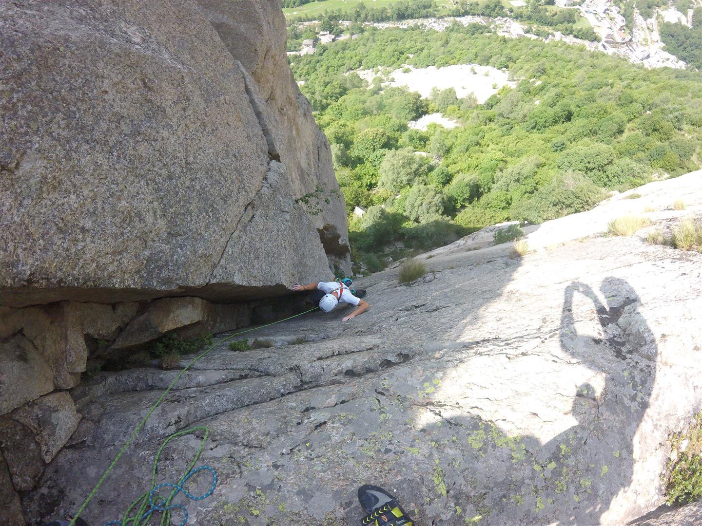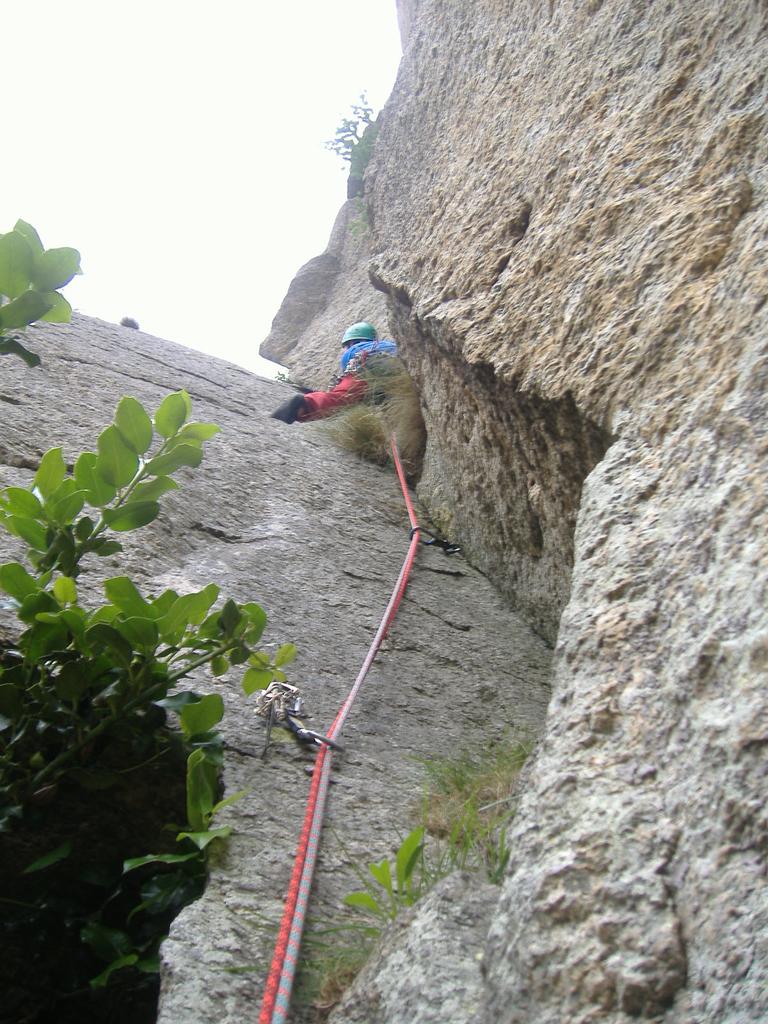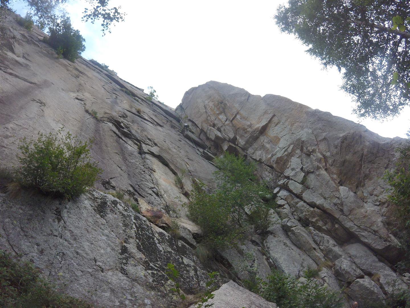 - L2 : Lungo diedro un po’ fisico e tortuoso (3 ch sparsi). La sosta è in 15 m sotto la cima, 10 m oltre il ginepro ben visibile da terra, accanto ad un alberello. Possibile sosta intermedia su ch e spuntone. (40m, 5c)