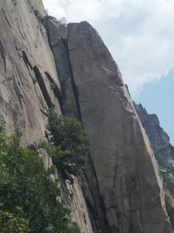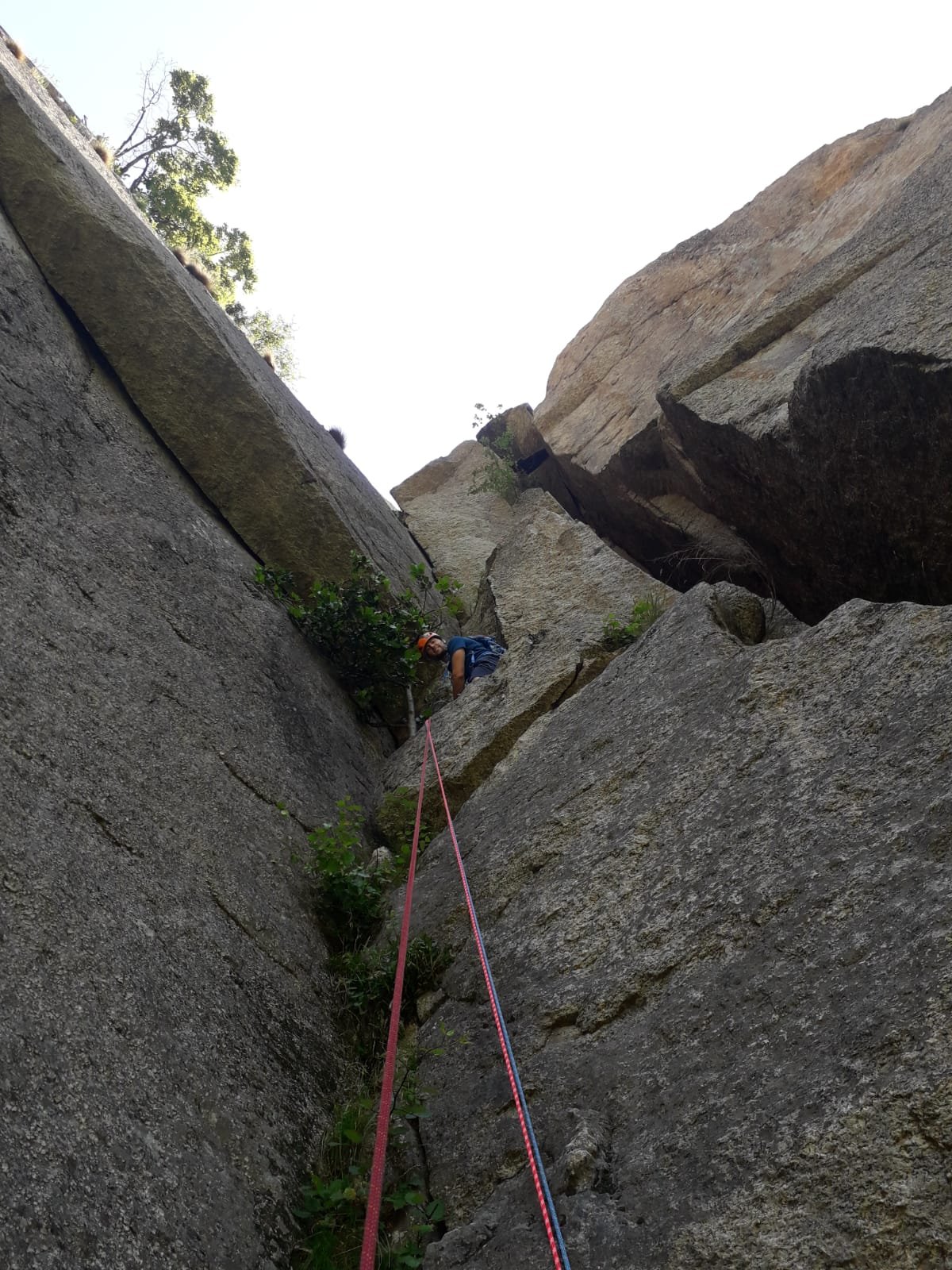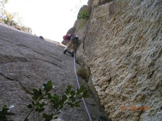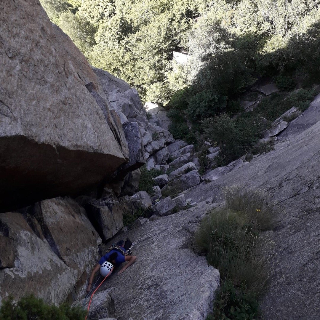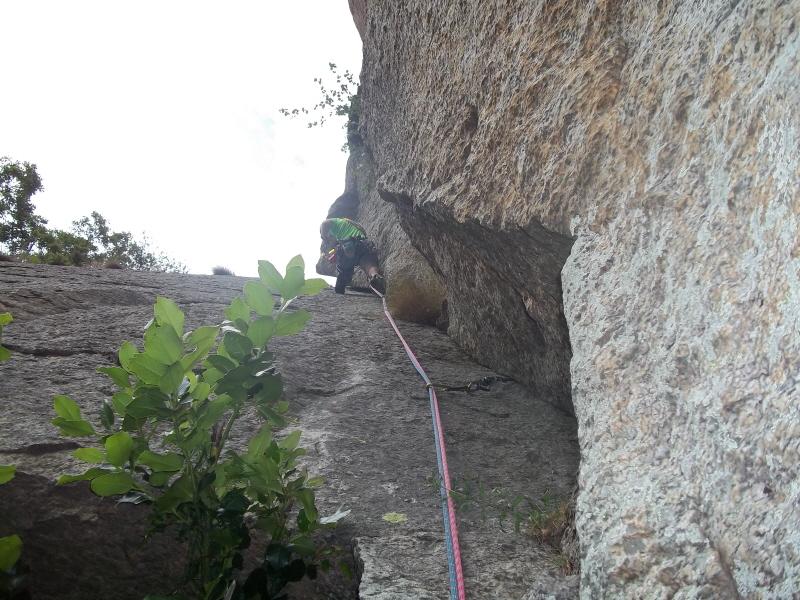 - L2 : Lungo diedro un po’ fisico e tortuoso (3 ch sparsi). La sosta è in 15 m sotto la cima, 10 m oltre il ginepro ben visibile da terra, accanto ad un alberello. Possibile sosta intermedia su ch e spuntone. (40m, 5c)