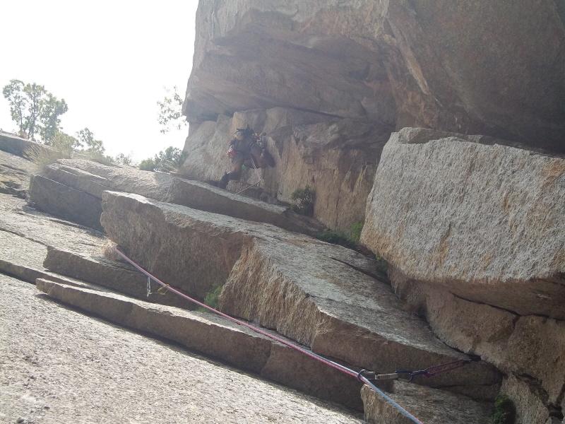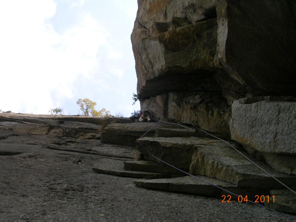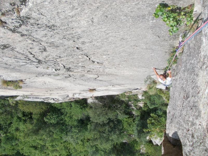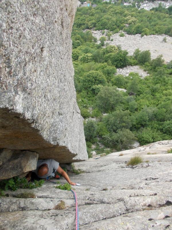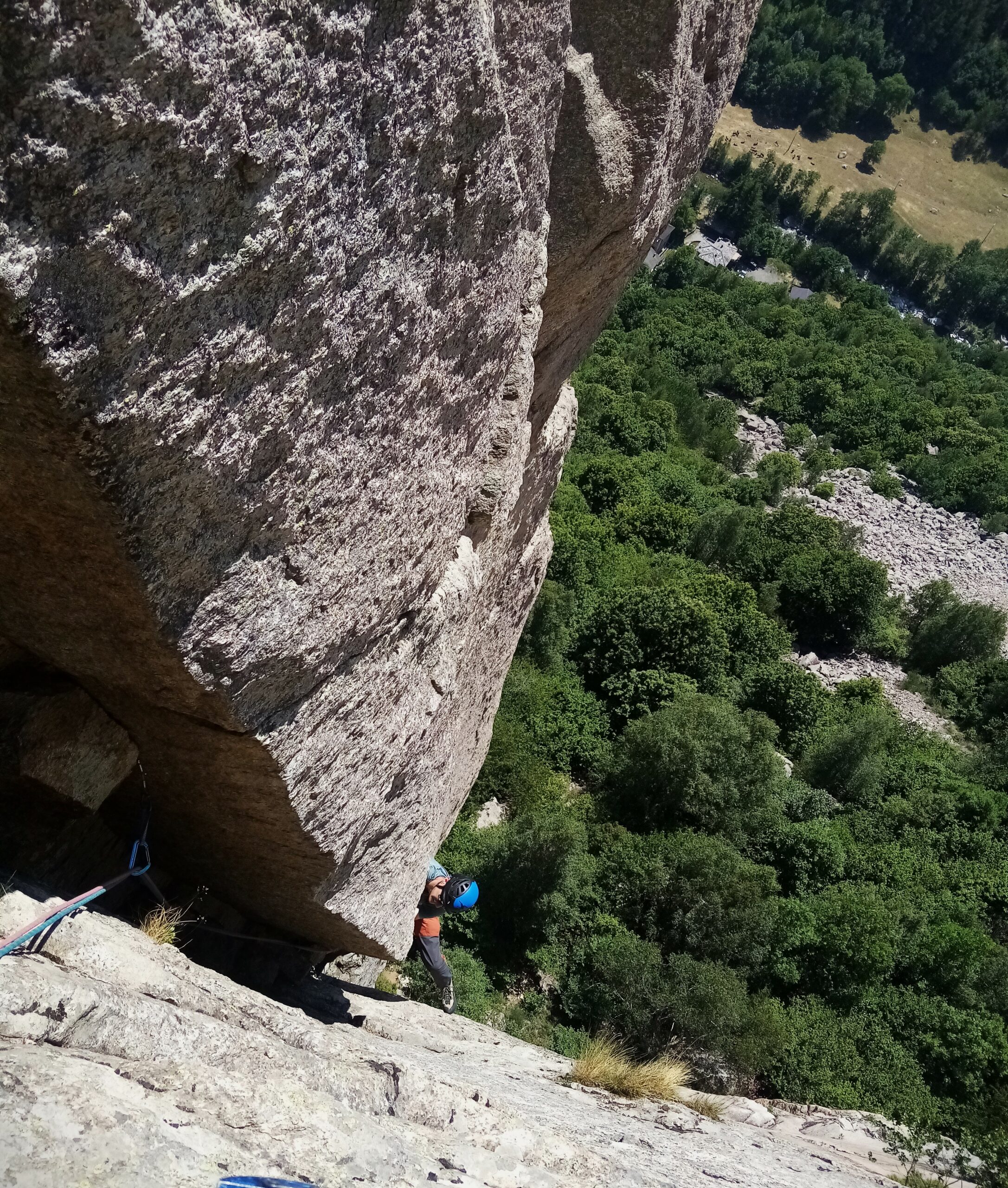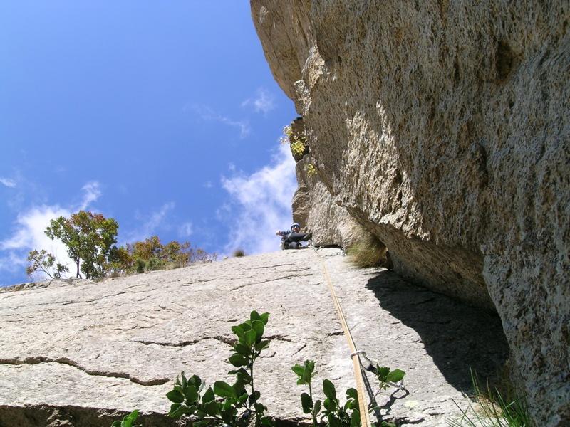 - L4 : cengia verso destra (faccia a monte), poi raggiungere una cornice e verso sx una fessura ad arco chiusa da un ginepro. Poi risalti placcosi (1ch) fino alla sosta su albero con cordoni e anello di calata (55m, 6a). Dalla cornice si può anche saltare la fessura, spesso sporca, e ribaltarsi subito a dx (sosta intermedia su albero), per poi tornare a sx sull’originale.