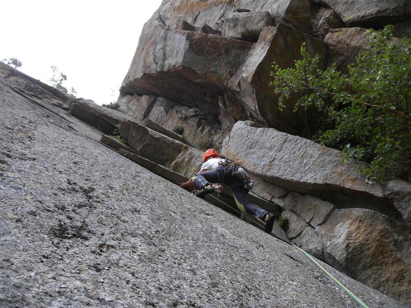 - L1 : Per rocce rotte e diedrino fino a sosta Raumer (10m, 3+)
