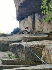 Fessure un po’ sporche ma facilmente proteggibili. Alcune lame suonano vuote ma non ci è rimasto nulla in mano. In via ci sono 4 chiodi (uno decisamente piegato e poco invitante) ,2 cordini ed un friend incastrato (utilizzabile),soste a spit.