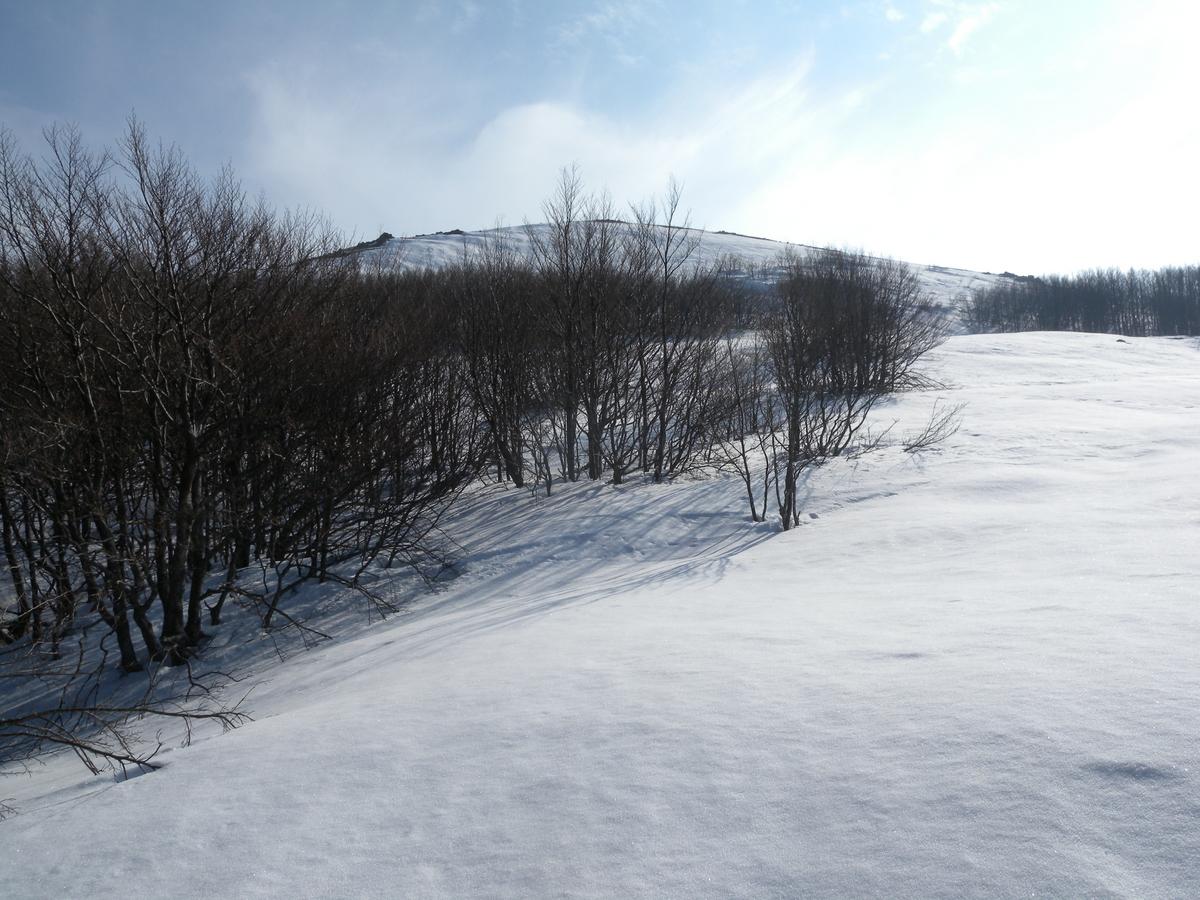 Seguire lo sterrato verso il Giacopiane. Prima di raggiungere l’evidente rio che scende tra l’Aiona e il Poggio delle Lame, cioè dove i pendii volgono a O con copertura nevosa più abbondante e continua, addentrarsi nella boschina (mai eccessivamente fitta). Senza avvicinarsi troppo al rio, individuare e seguire un canaletto/colatoio che costeggia a sx delle conformazioni rocciose. Qualche breve tratto ripido, forse problematico con neve sfondosa. Si sbuca su un terrazzamento (q.1550) con vista sul Poggio delle Lame.