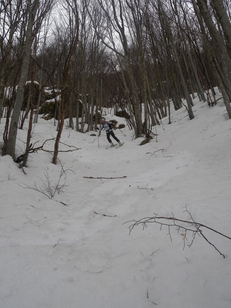 Non escludo che ci possano essere tragitti migliori (forse tenendosi vicini al rio si accede facilmente alla radura dove transita l’AV, forse), questo ha la garanzia di una migliore copertura nevosa e anche in discesa si percorre tranquillamente sci ai piedi, grazie alla boschina fitta ma non invadente.