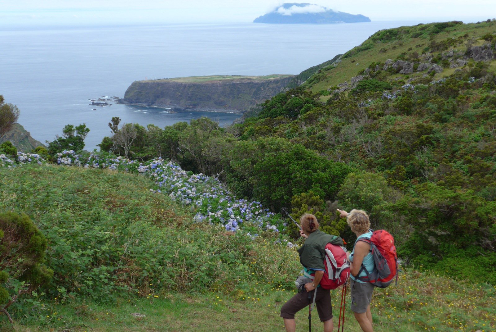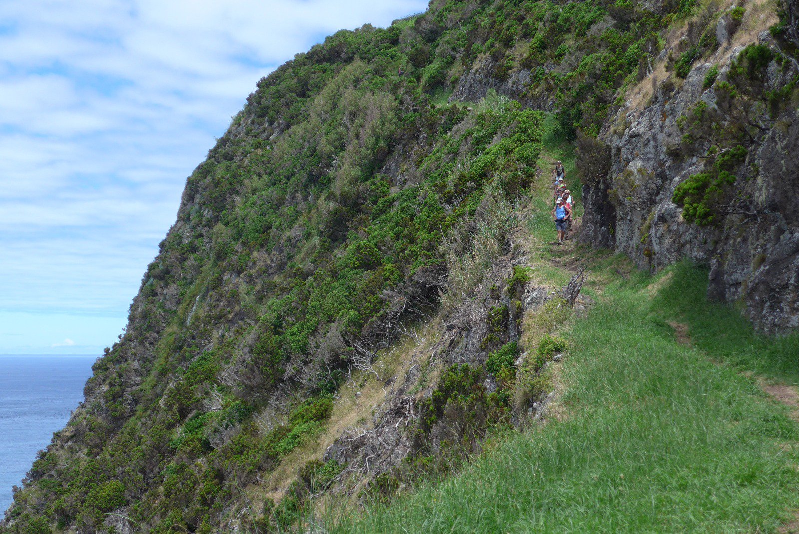 Si sale nei pascoli contornati da enormi ortensie, fino a raggiungere un altopiano. Da qui il sentiero con molti saliscendi percorre la costa molto in alto.