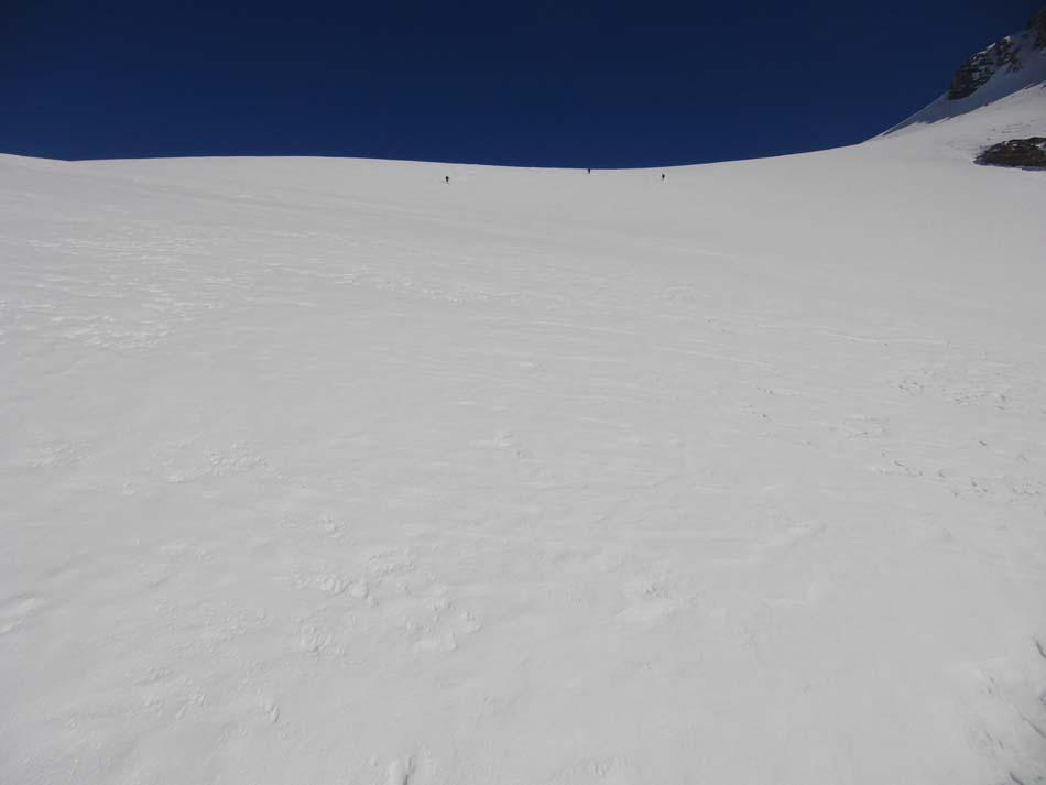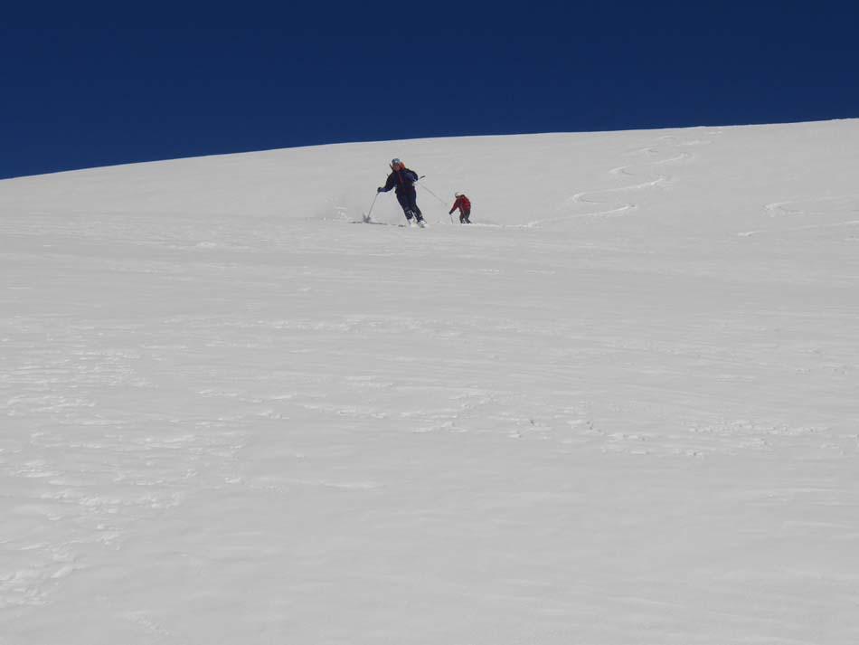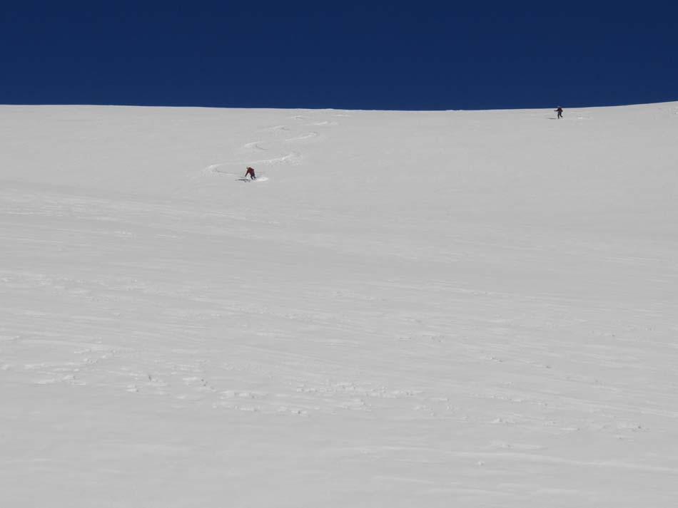 PERFETTA! Condizioni strepitose: farina sul ghiacciaio e moquette su fondo duro di neve vecchia che non sfonda su tutto il resto del percorso fino alla pista di fondo. Ma luuunga; per mie non buone condi oggi non ho raggiunto la vetta lasciando tutto il compito ai miei più giovani e forti compagni di avventura. Sono tracciati tutti gli itinerari.