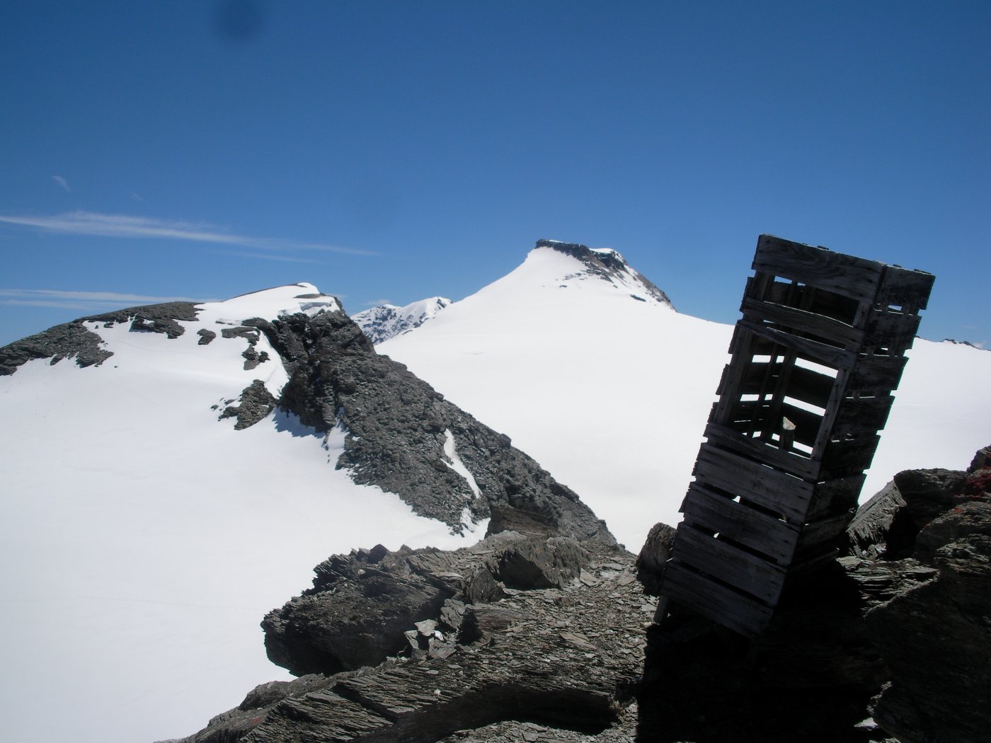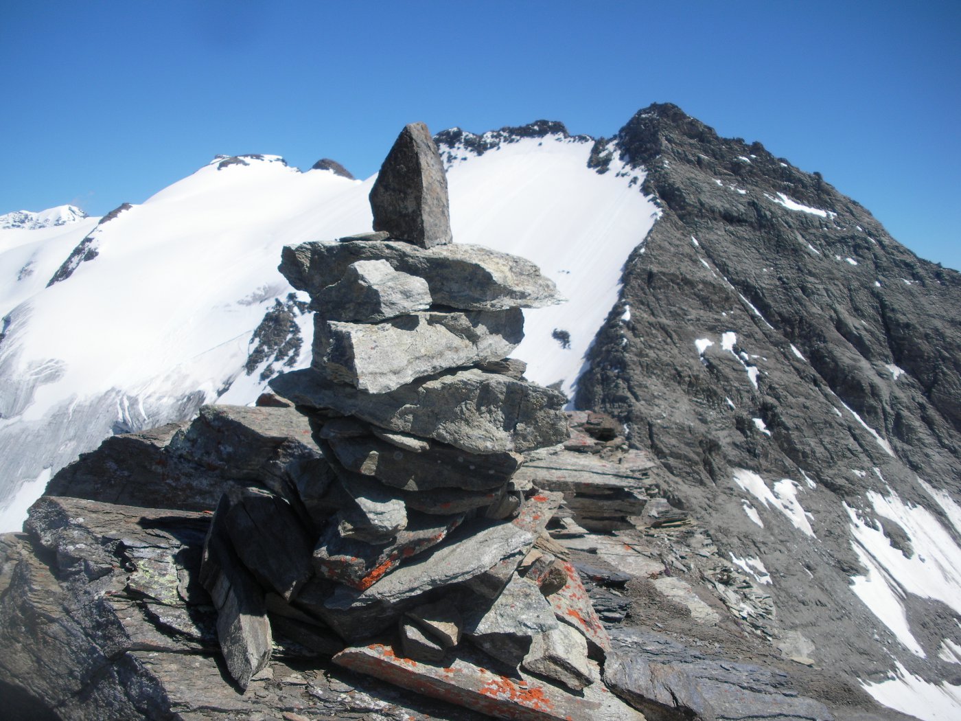 E’ ormai la regola, quella di tendere a esagerare nei contenuti, ogni volta che si parte per rastrellare piu’ mete possibili in un cammino d’avventura tra i monti (s’intende montagne), con conseguente raddoppio o quasi dei dislivelli (dagli originali 1800 e poco piu’ sono arrivato a racimolarne ben 2500, con tutti i prevedibili inevitabili sali scendi su e giu’ da una cima all’altra, e il raddoppio di strada concepita in modo tale da far risultare il giro (senza quasi) ad anello di gran soddisfazione e certamente alla portata di pochi. Al posto di scendere al des Esevettes, luogo a me ormai stra noto, gli ho preferito l’altra soluzione. Una bella infornata di cime che una ad una, vedevo salendo dal ghiacciaio del Vallonet ridotto ormai a poco piu’ che un nevaio. A partire dalla prima che e’ stata l’Albaron, e anche la piu’ alta nonche’ la piu’ famosa e conosciuta della zona, sulla via del ritorno ho ripassato una ad una prima il Dome du Gran Fond, gia’ di per se da sola, una valida meta scialpinistica di tarda primavera, seguono poi in successione le due Pointes du Grand Fond est e ovest, rocciose di creste affilate non difficili cmq esposte e composte da roccia mediocre (e quanto mai), che richiedono tuttavia di fare molta attenzione, tanto piu’ non avendo corda ne niente di niente al seguito. Scendere al col de la Fourche dalla pointe ouest, la cresta ad un certo punto ripida insicura per via della roccia decisamente instabile, mi ha costretto a uscire e a scendere un ripidissimo scivolo di neve con gli unici mezzi sempre validi e insostituibili che sono picca e ramponi. Guai non averli sempre appresso su questi terreni. Un ultima e neanche poi cosi tanto straziante impennata, e tocco il vertice anche della quinta e ultima cima del pacchetto di oggi..la Pointe d’Andagne (anch’essa presa da sola, una piacevole ed appagante meta escursionistica da Bonneval) la prossima sara’ ancora peggio?..Tempo voglia capacita’ e mezzi ci sono..l’importante e’ evitare di coinvolgere altri in imprese “tout court” come questa..il rischio potrebbe essere quello di sentirsi accusato di masochismo per troppi eccessi o estremismi per dirla con altre parole. Giornata spaziale caldo giusto anche in quota. Rigelo che ha tenuto bene praticamente per l’intero lungo giorno di questa camminata-arrampicata dalla durata complessiva di 11 ore e mezza che poi sarebbero 14 se si calcola la sosta di 2 ore e mezza in vetta all’Albaron. Corde e golfari a mo di presa per mani e appoggio per i piedi aiutano a superare il breve tratto verticale di roccette nell’ultimo tratto della salita da nord con uscita diretta in vetta.