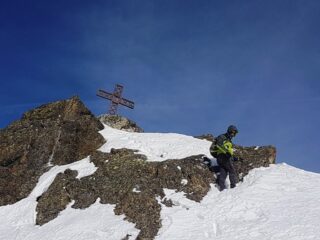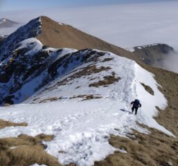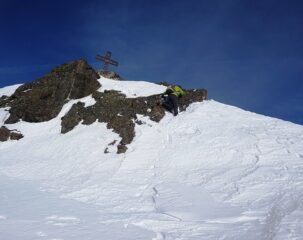 Gita da non sottovalutare in questa stagione e con queste condizioni, come già detto da altri che l’hanno fatta in inverno. Prima parte nel bosco con poca neve ma scivolosa al ritorno. Poi neve non portante nella parte centrale, ci siamo alternati a battere traccia, questo il tratto più faticoso. Neve marmorea nella parte alta, a tratti ventata ma comunque più agevole anche se alcuni tratti un po’ delicati. Necessari i ramponi da circa metà gita e utile la picca negli ultimi cento metri sotto la cima. Vento fortissimo in vetta che ci ha costretti ad un’immediata discesa, appena il tempo di fare un paio foto. 5 ore per salire e la metà per scendere. Impegnativa almeno quanto una Zumstein in estivo sul Rosa. 5 partecipanti, 3 in vetta, 2 fermatisi appena sotto lo scivolo finale. Solo noi su questa montagna.