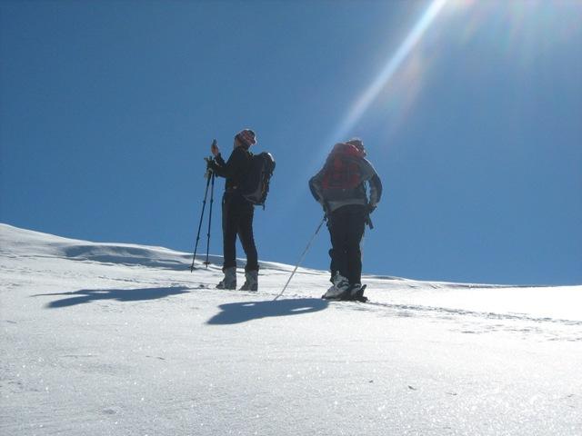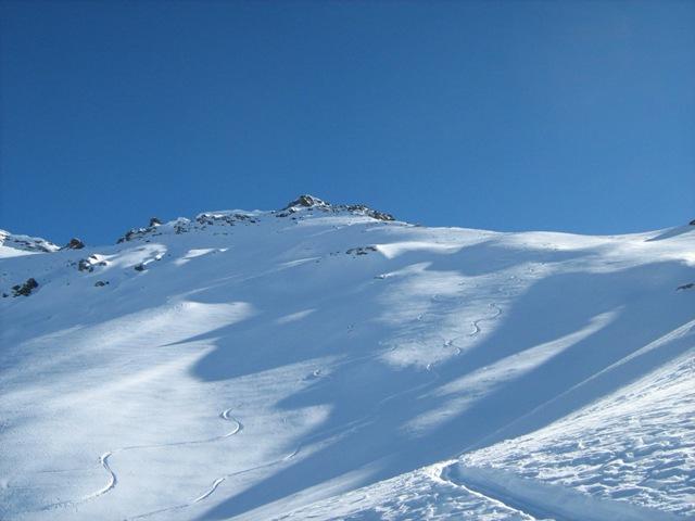 Gran gitone che ci ha consentito di sfruttare al meglio un giorno di ferie. Partenza alle 8.30 da Soucheres Basses con temperatura piuttosto fresca. La salita non presenta nessun problema e, anzi, si sale molto velocemente nonostante il dislivello sia notevole. Lo spostamento è praticamente nullo e quindi il percorso risulta molto diretto e in più la traccia di salita è praticamente perfetta…complimenti a chi l’ha fatta nei giorni scorsi!!! Al momento non servono i rampant. Si arriva con gli sci a quota 3.000, poi conviene procedere a piedi per raggiungere la croce di vetta. Noi ci siamo portati gli sci sullo zaino perché volevamo tentare la discesa in un canalino che parte proprio sotto la cima. Arrivati in cima alle 12.20 circa, abbiamo poi iniziato la discesa intorno alle 13.15.