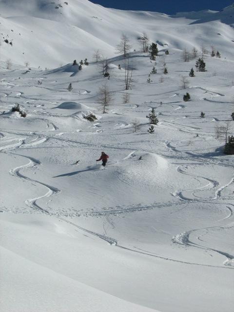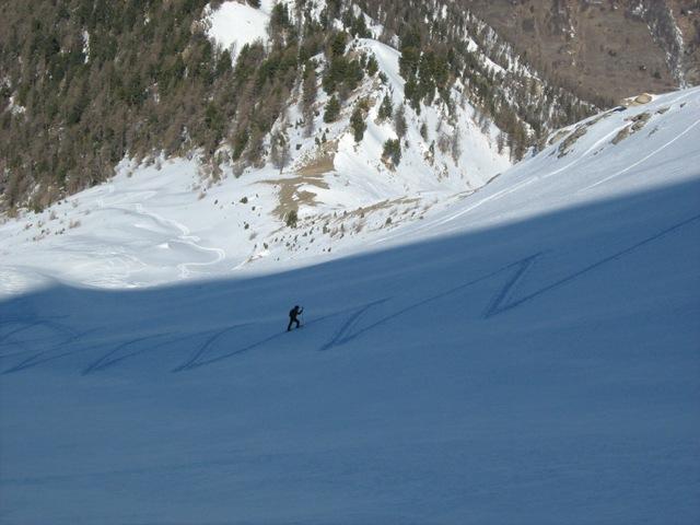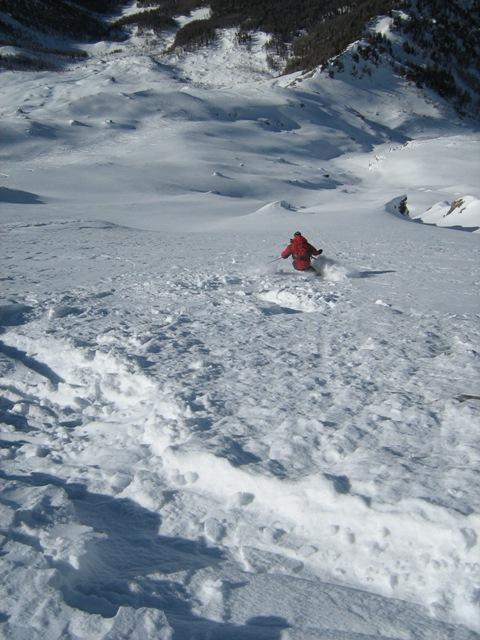 Sci ai piedi dal piccolo ripiano che si trova 10 metri sotto la vetta, di qui abbiamo tagliato leggermente a destra per imboccare il breve canalino. Qualche pietra insidiosa nei primi metri, poi il pendio si apre ma bisogna fare un po’ di attenzione ad alcuni accumuli, vista anche la pendenza abbastanza sostenuta! A quota 2.800 circa abbiamo poi tagliato sulla sinistra andando a ricongiungersi con la traccia di salita. Da qui scesi tutti a sinistra sfruttando il più possibile zone vergini…farina da 5 stelle fino all’ingresso del bosco, poi da lì in giù la neve aveva mollato parecchio in quanto durante la giornata si è alzato un venticello leggero ma molto caldo che in alcuni tratti ha ridotto la neve a polenta…tuttavia scegliendo le zone più riparate abbiamo ancora trovato diversi tratti divertenti e ben sciabili, fin quasi alle auto.
