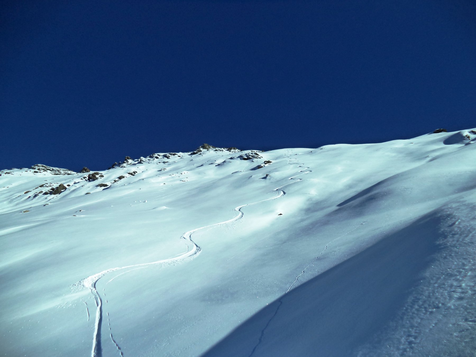 Tanta voglia di sciare e quindi via con il primo “biathlon” della stagione: fino a Pra d’Amont in mountain bike, a piedi di lì fino a sotto il cote de la saume (ca q.2350) e poi fino in cima con gli sci. Ovviamente non è un itinerario per scialpinisti classici “duri e puri”, ma solo un modo alternativo per farsi una bel giro in mtb (sono circa 6km di salita da Soucheres Basses), una breve passeggiata e infine una bella sciata nella stessa giornata. Stradina fino a pra d’amont con molti tratti innevati/ghiacciati ma fattibile quasi tutta in sella (solo un tornante e la parte finale hanno troppa neve). La neve inizia già dalla bergeria ma sono solo 20cm scarsi senza fondo, io ho provato a salire un tratto con gli sci ma è meglio a piedi. Da q.2350m sci ai piedi su 20cm di fresca in aumento con fondo discreto sottostante. Gli ultimi metri per la cima è meglio farli a piedi. In discesa ho messo gli sci sotto il castelletto della punta, prime curve controllate e un po’ sulle uova per qualche roccetta affiorante, poi semplicemente un lenzuolo splendido: 30cm abbondanti di fresca leggerissima con buon fondo, davvero spaziale per essere al primo novembre. Discesa davvero splendida su belle pendenze e neve ideale, sempre leggerissima e goduriosa, peccato finisca in fretta… A q.2350m di nuovo sci a spalle e veloce passeggiata fino a Pra d’Amont, di lì divertente discesa con la MTB sulla stradina tra chiazze di neve e tratti scorrevolissimi ricoperti da un tappetto di aghi di larice.