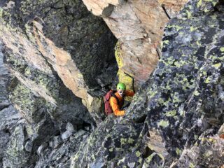 Trovato un passo impegnativo a fine via, una dulfer (cordino in loco) con passo faticoso.