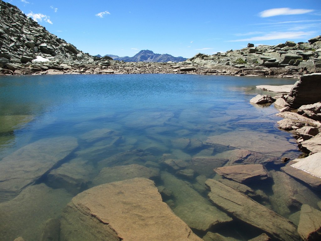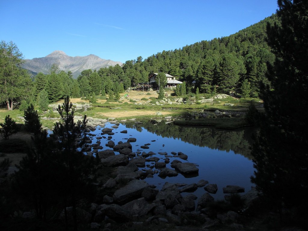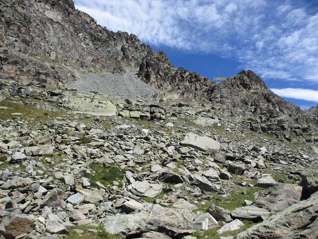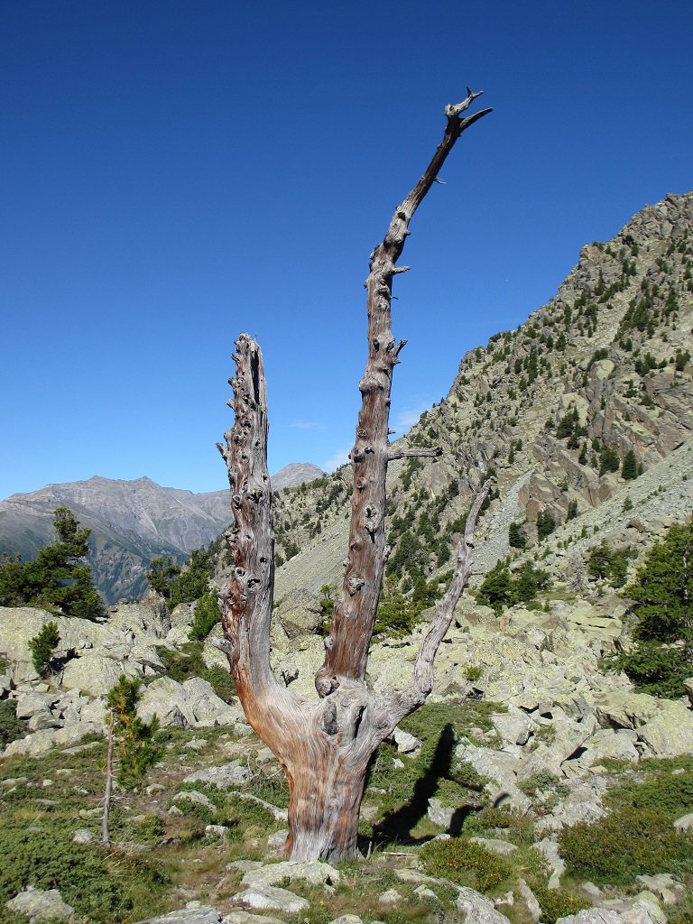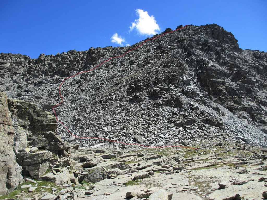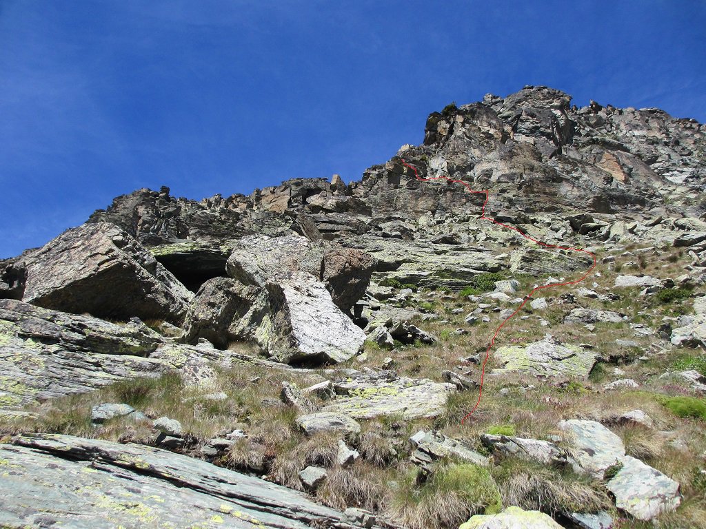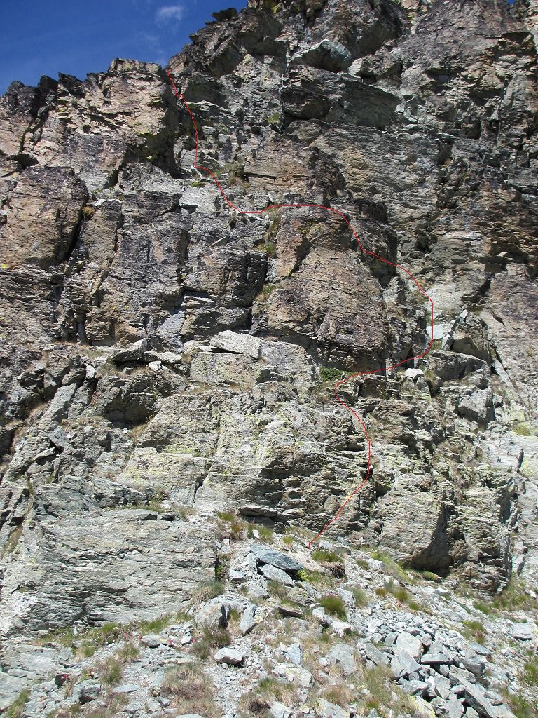 Dal posteggio tornare verso il rifugio Alevè dove una palina indica la via da seguire in direzione del rifugio Bagnour, si sale inizialmente su sentiero con buona pendenza in mezzo al bosco di larici, una volta arrivati al rifugio si prosegue superando il piccolo lago in direzione sud dove si trova un’altra palina che indica il passo dei Duc che bisogna seguire, si prosegue sempre su sentiero e segnavia B/R e passo passo che si sale il bosco diventa più rado, si supera un albero di larice che sembra fossilizzato, e si prosegue in mezzo a grossi massi e tracce di sentiero, quando si esce dalla pietraia di massi il sentiero diventa di terra continuo si supera la verticale della cima Orientale fino a notare in alto a sx quasi di fronte quello che sembra il termine della cresta est delle Ale Lunghe che finisce ad un colletto dove si può notare una pietraia di piccoli massi che si distingue perché del noto colore grigiastro. Salire in quella direzione, non è neppure troppo faticosa o franosa fino al colletto, poi girare a sx in direzione della evidente parete che si ha di fronte, puntare quasi al centro della stessa fino a notare un passaggio “passo di II”, salito il quale si prosegue in diagonale verso sx si supera un muretto di rocce, si continua per pochi metri sempre in diagonale poi si prosegue girando a dx su una parete ripida un po’ incassata di rocce e erba, si supera il successivo “passo di II” poi sembra di trovarsi di fronte una parete verticale difficile così non è (si fanno “passi di II e III-) nel contempo disarrampicando si arriva dove termina un canalino, si sale alla dx della paretina si percorre un tratto superiore di rocce e erba ci si indirizza a questo punto verso l’evidente cresta si sale alla meglio fino al culmine, si può proseguire stando sul filo o poco sotto in direzione ovest verso quella che sembra la cima ma che poi risulterà essere una quota quasi equivalente della cima Orientale posta pochi metri oltre con un ometto. Discesa si può ritornare indietro sul filo di cresta o poco sotto verso la Punta Malta si superano o aggirano piccoli torrioni e tanti “passi di II” fino al termine della cresta poi si scende al passo dei Duc e da lì si prende il sentiero del ritorno.