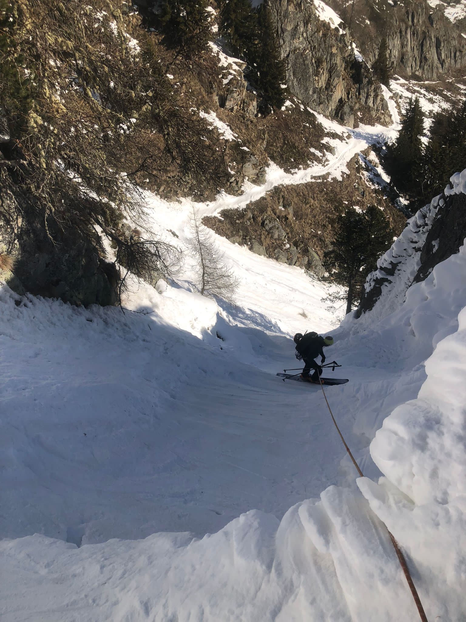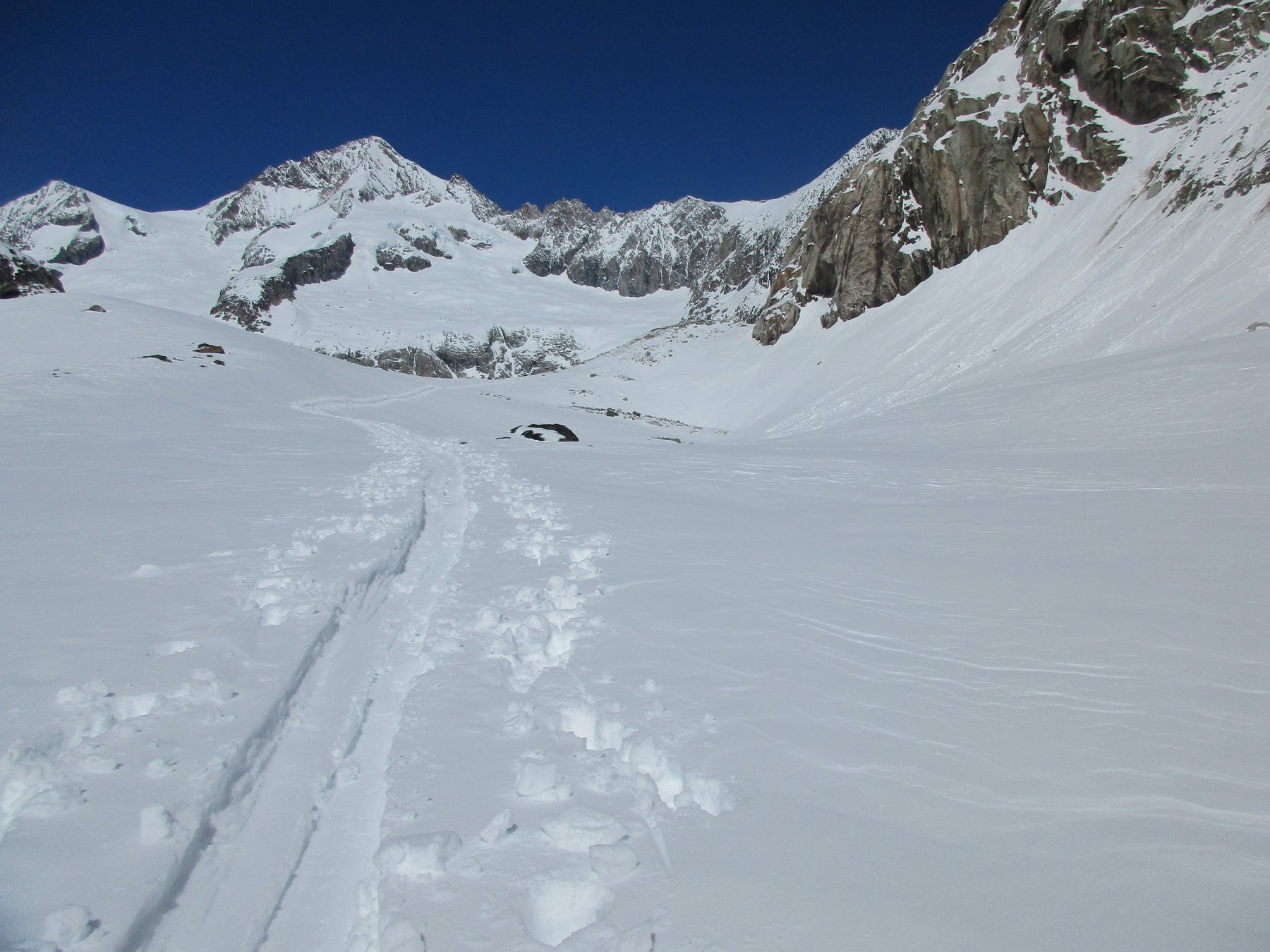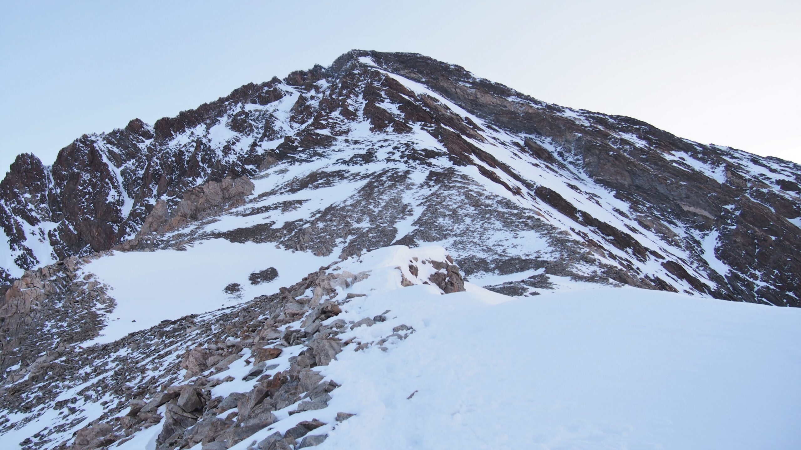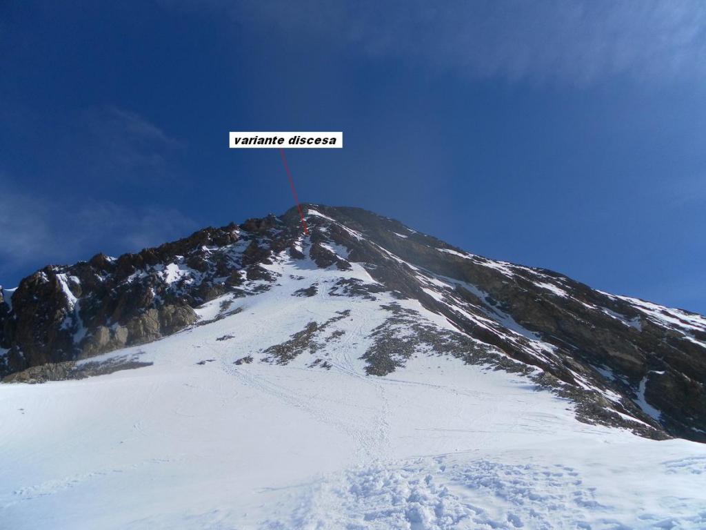 Lasciati gli sci, ci si segue la larga cresta prima per un corto passaggio di roccia, poi per un pendio di neve che si raddrizza per imboccare un canale. Ci si prosegue su roccia (passi di II) per trovare un altro pendio di neve, che ci si risale. Gli ultimi 50m su roccia portano in vetta.