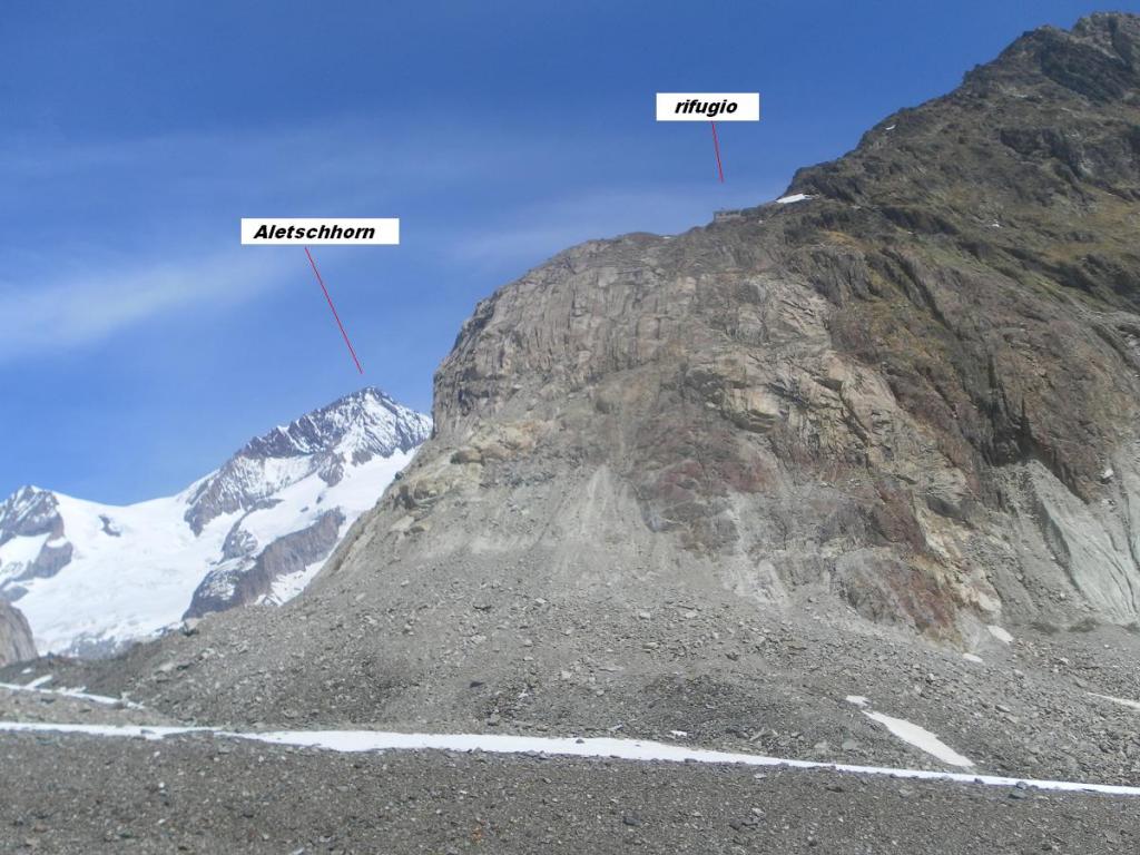 Da l’Hotel di Belalp ci si abbassa per una mulattiera fino a quota 2000m (sentiero esposto quando c’è ancora neve, ma attrezzato con corde fisse). Seguire il sentiero che porta direttamente alla quota 2086m (più presto in stagione conviene abbassarsi per prendere la morena più in basso). Risalire per la morena sino al suo termine (quota 2303m). Scendere una cinquantina di metri per prendere piedi sul ghiacciaio (pendio ripido e scomodo).