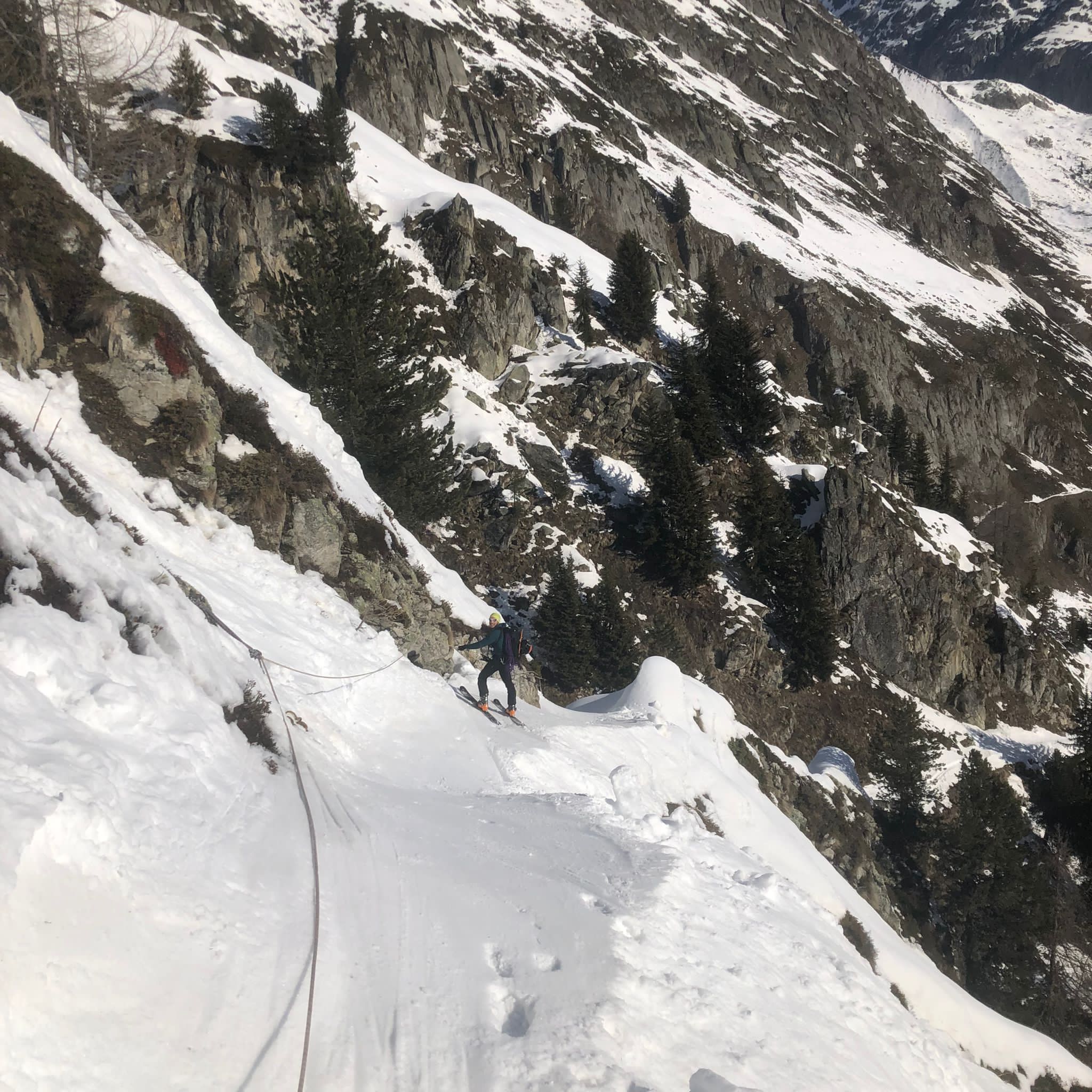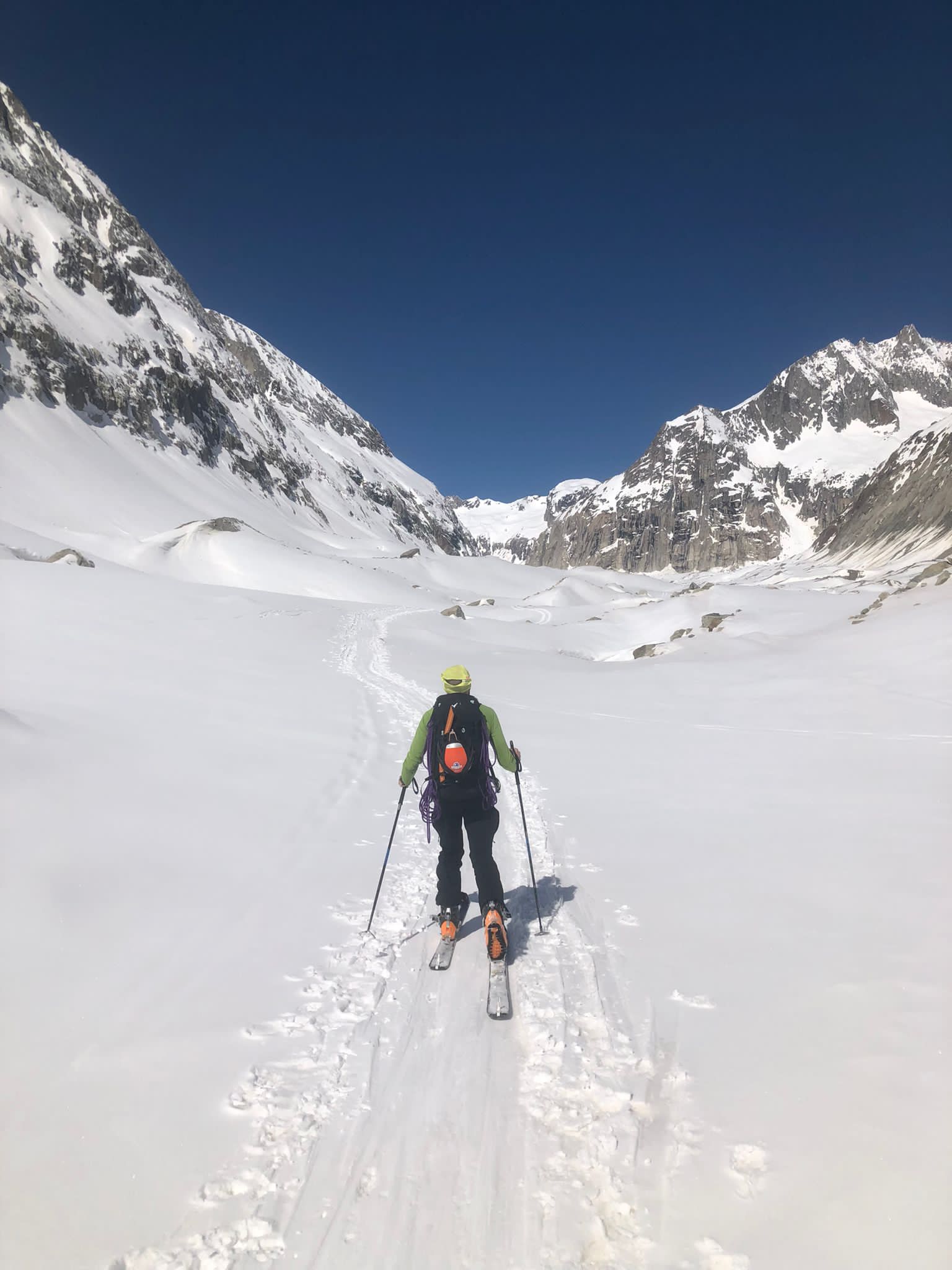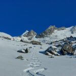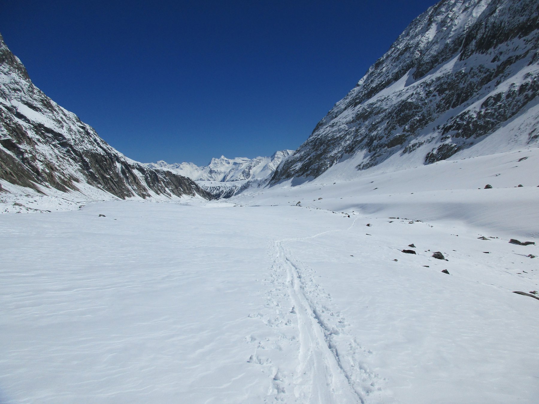 Seguire ometti e segni per risalire al meglio l’Oberalteschgletscher fino a sotto il rifugio (quota ca. 2500m). Lasciare gli sci e salire alla Oberalteschhutten per il sentiero attrezzato da cavi e scale.