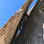 L1, L2, L3, L4: non si può sbagliare, basta seguire gli spit! Non si incrociano altre vie. C’è subito un passo duro in partenza a rimontare uno strapiombino su dei funghi di roccia, e poi un passo molto duro di aderenza dopo la s1, abbastanza lontano dalla protezione. Il resto è uniforme sul 6a, lungo runout alla fine della l3, dove occorre portarsi a sx e sfruttare unn alberello per proteggersi. Più facile l’ultima lunghezza, sul 5c.