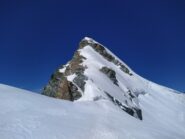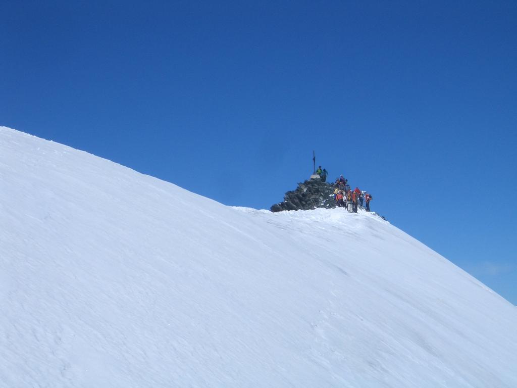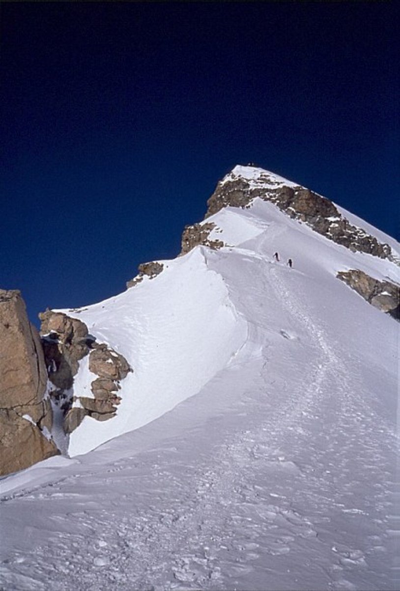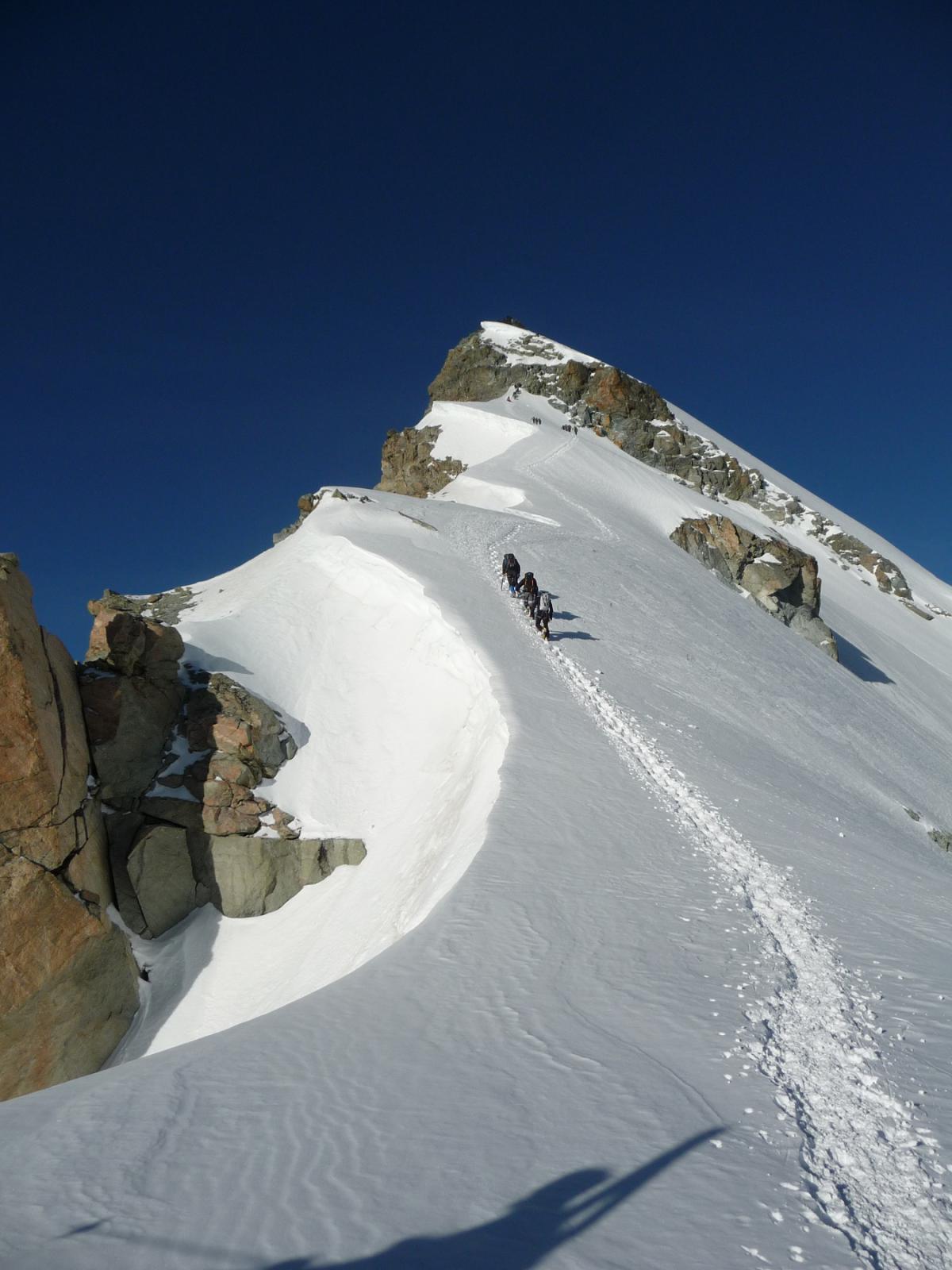 Da questo punto si segue fedelmente la cresta ora orizzontale ora più ripida fino alla fascia rocciosa sommitale, che si supera (in totale una cinquantina di metri passaggi di II+; presente a volte una corda fissa, dei fittoni e alcuni spits). Si esce a destra aggirando una piccola torre rocciosa poi brevemente per cresta fino alla croce di vetta. ore 4-5 dalla Britannia. 3-4 ore dalla fermata intermedia.