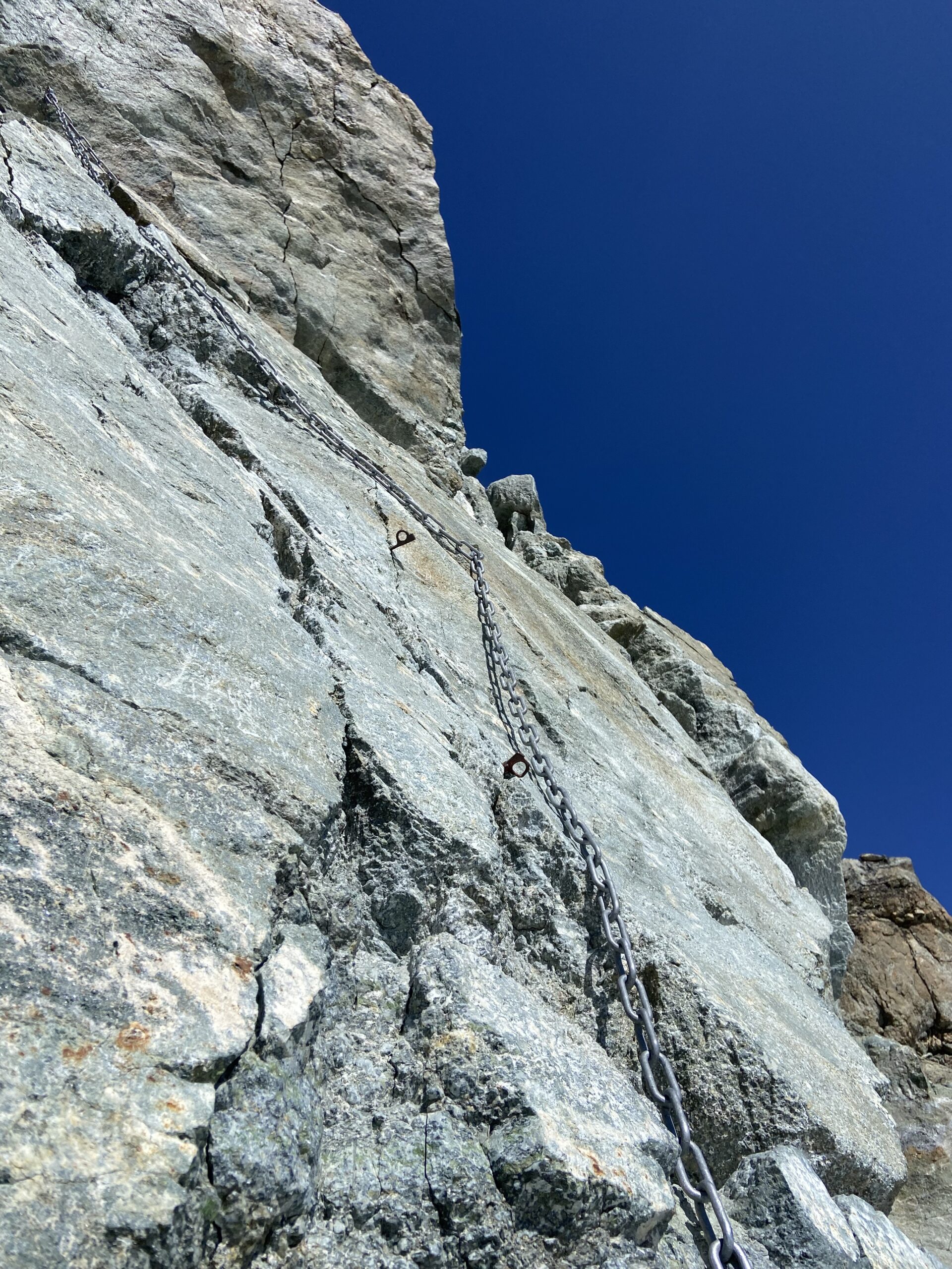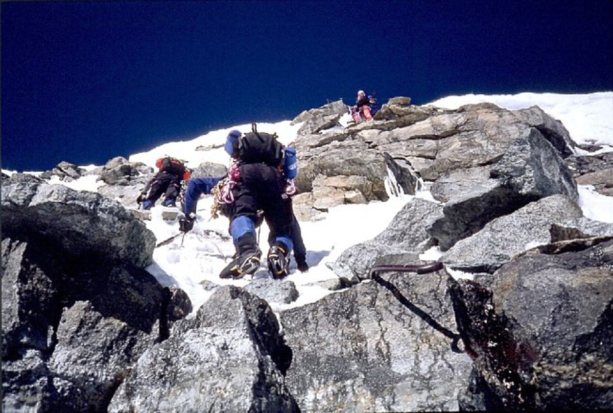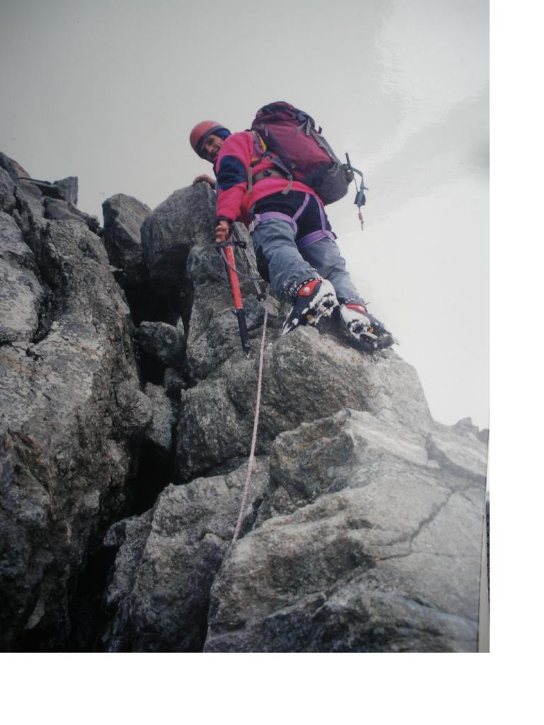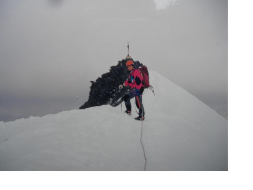 Da questo punto si segue fedelmente la cresta ora orizzontale ora più ripida fino alla fascia rocciosa sommitale, che si supera (in totale una cinquantina di metri passaggi di II+; presente a volte una corda fissa, dei fittoni e alcuni spits). Si esce a destra aggirando una piccola torre rocciosa poi brevemente per cresta fino alla croce di vetta. ore 4-5 dalla Britannia. 3-4 ore dalla fermata intermedia.