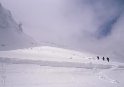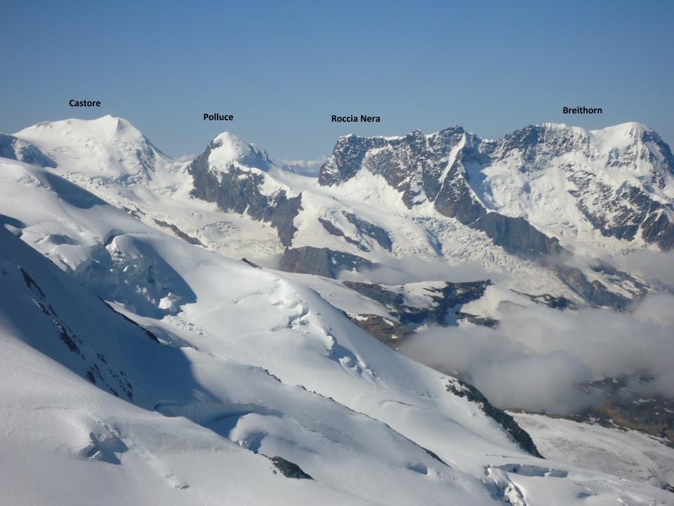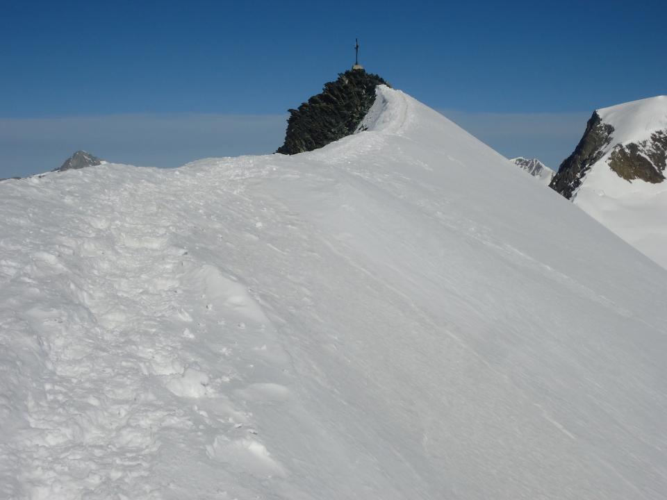 1- Da sass fee si predono gli impianti che raggiungono Felskinn e di lì in un’oretta alla Britannia Hutte (3030 mt). Dal rifugio il giorno dopo si scende sull’holaubgletscher raggiungendo poi la cresta dell’hohlaub a nord della quota 3100 ca. di li si continua sempre in cresta verso un altro piccolo rilievo a quota 3350 circa.