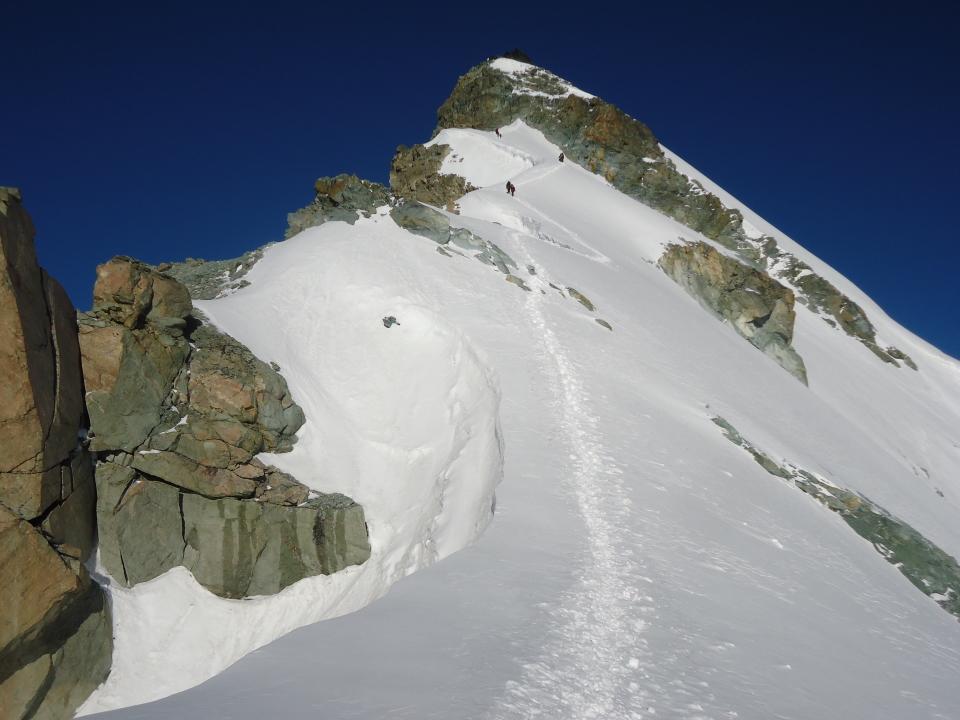 2- Da sass fee si prendono gli impianti del metro alpin per raggiungere la stazione del Mittellalin. Quando si prende il metro alpin esiste una fermata intermedia (bisogna avvisare e richiderla agli addetti degli impianti) a quota 3200 circa. Di lì un passaggio attraverso un tunnel consente di sbucare sul ghiaccaio. Si scende brevemente prendendo piede sul ghiacciaio che si attraversa quasi in piano e si punta ad un rilevo a quota 3350. In base alle condizioni si può raggiungere questo rilievo sulla cresta dal basso oppure evitarlo passando a nord. Questo in base alle condizoni del ghiacciaio abbastanza crepacciato. ( tale variante permette di realizzare la salita in giornata senza togliere nulla alla bellezza della cresta)