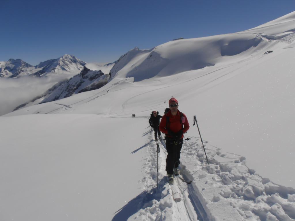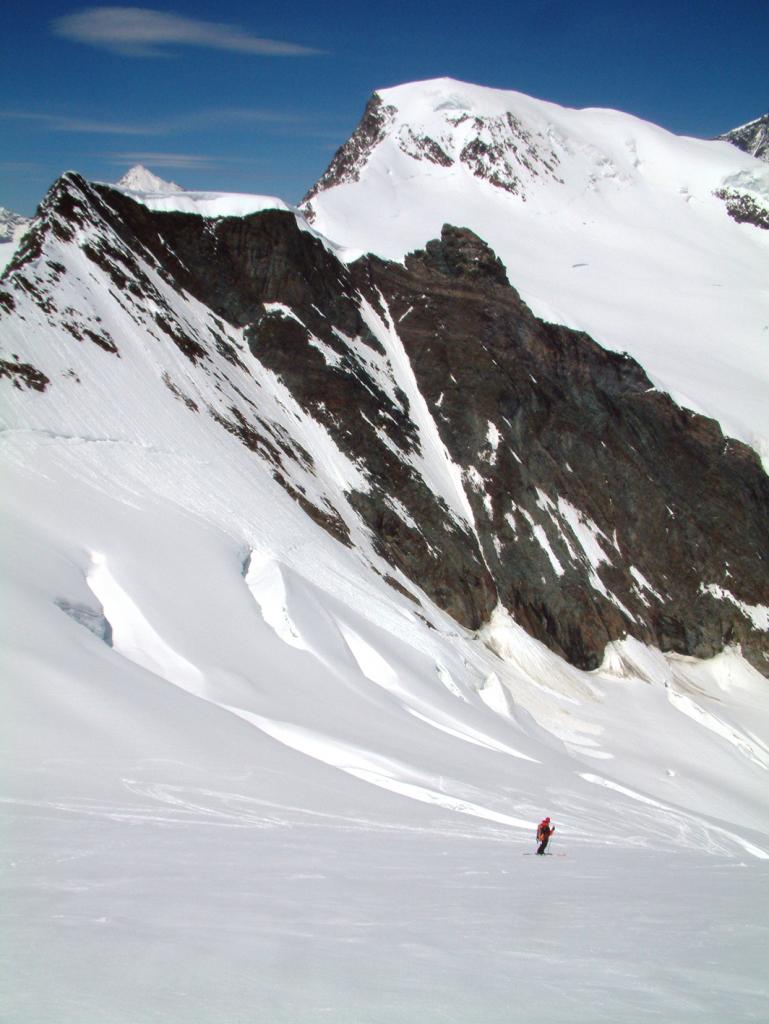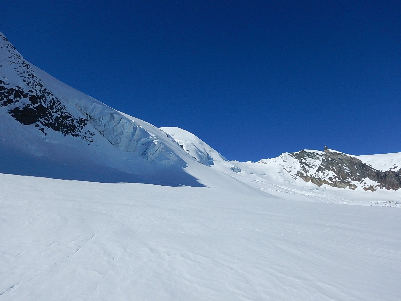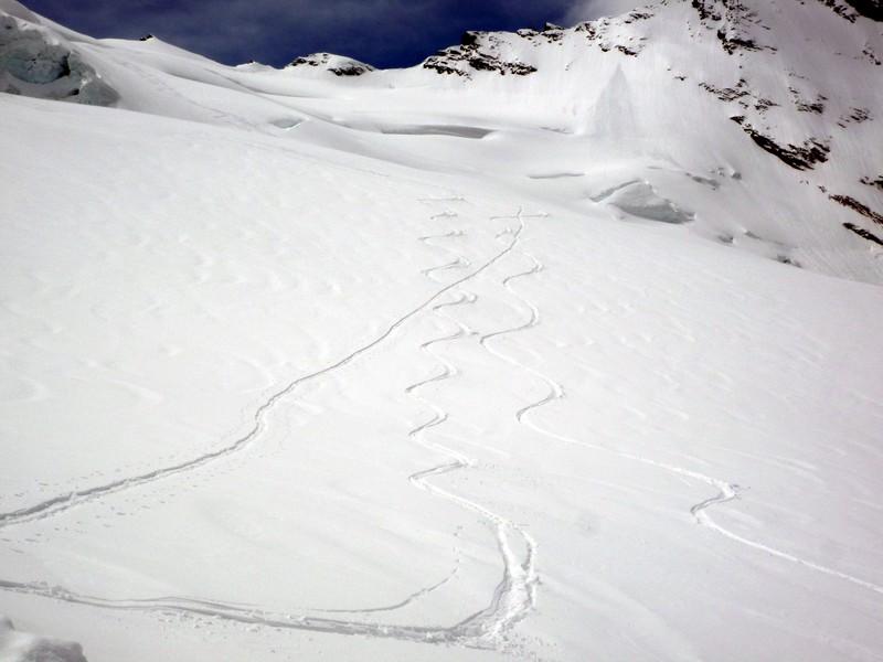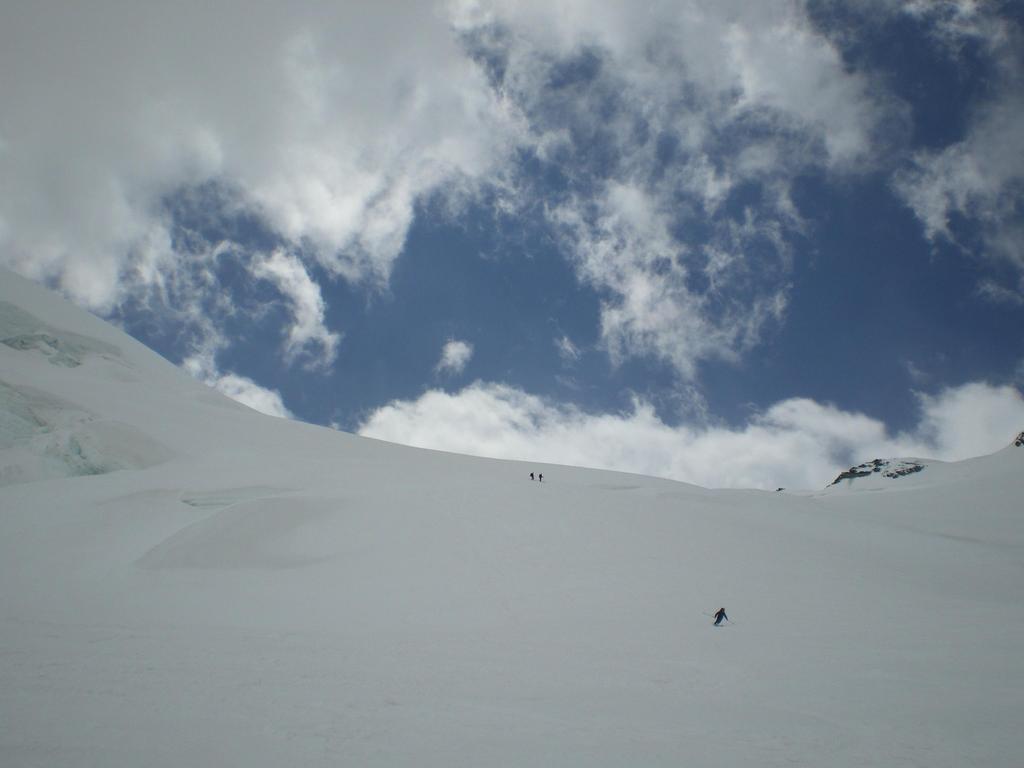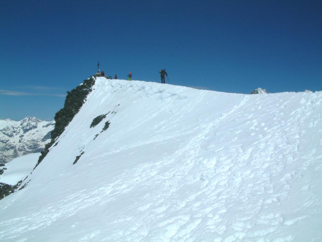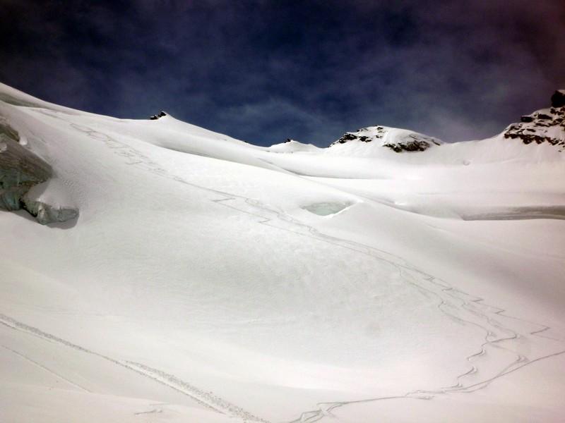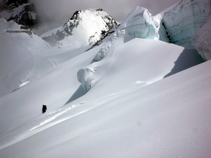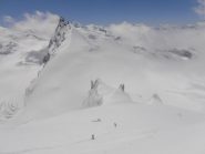 Risalire il ripido pendio in direzione ovest.Superato il pendio, con lungo traverso raggiungere la parte di ghiacciaio attraversato dagli skilift dello sci estivo ricongiungendosi così con l’itinerario di salita dalla Langfluehutte al quale si rimanda per la relazione di salita alla cima.