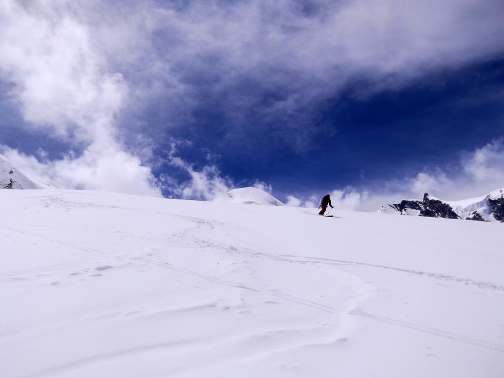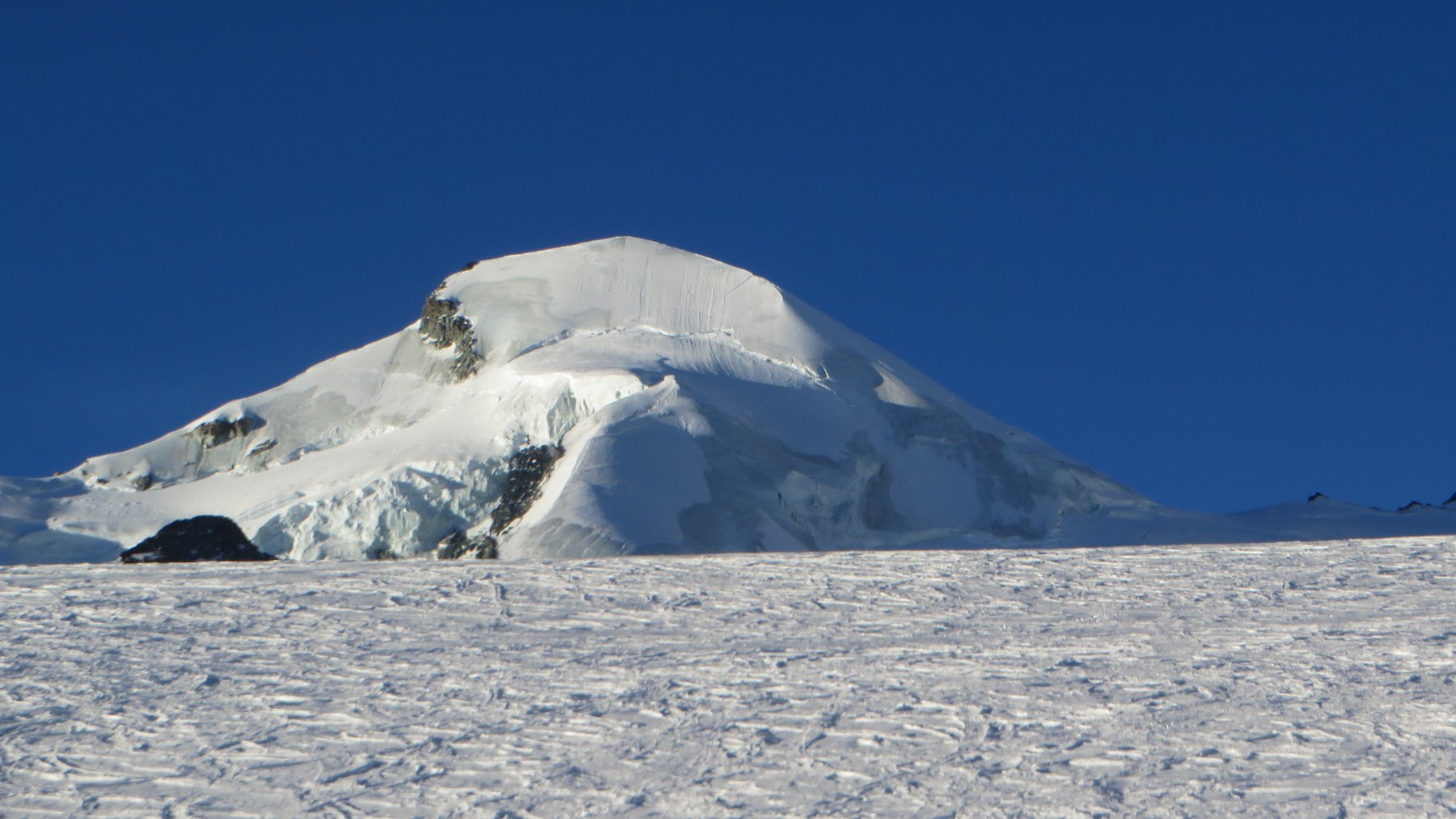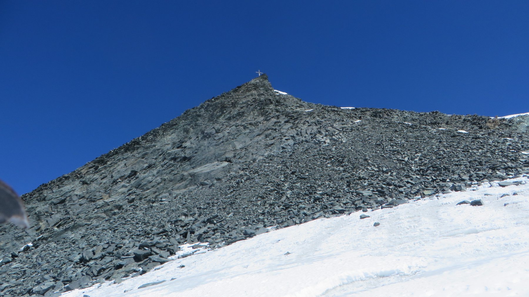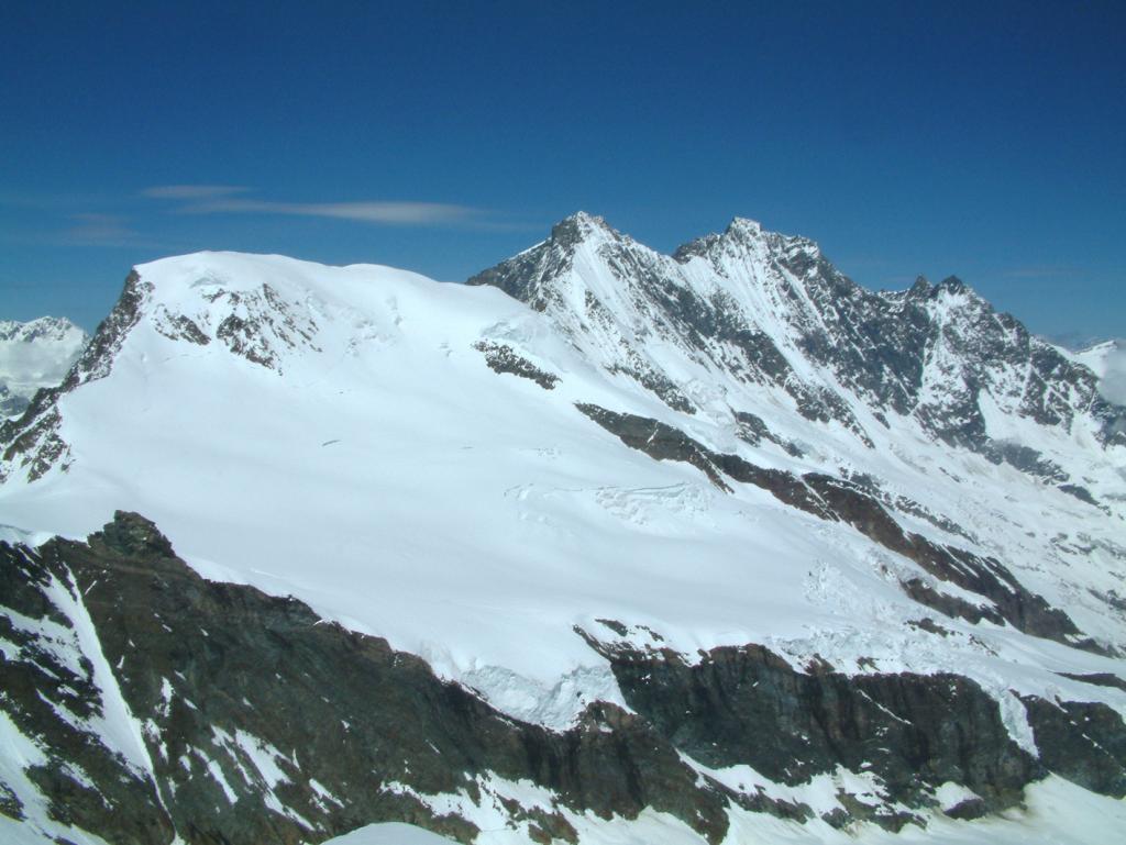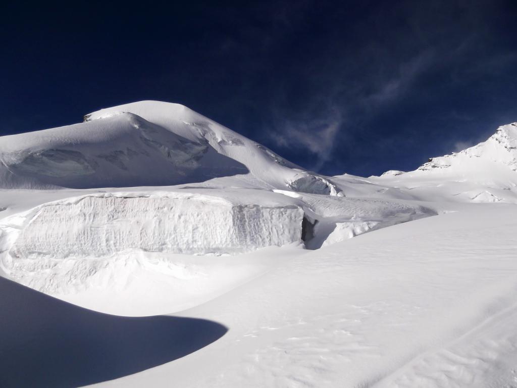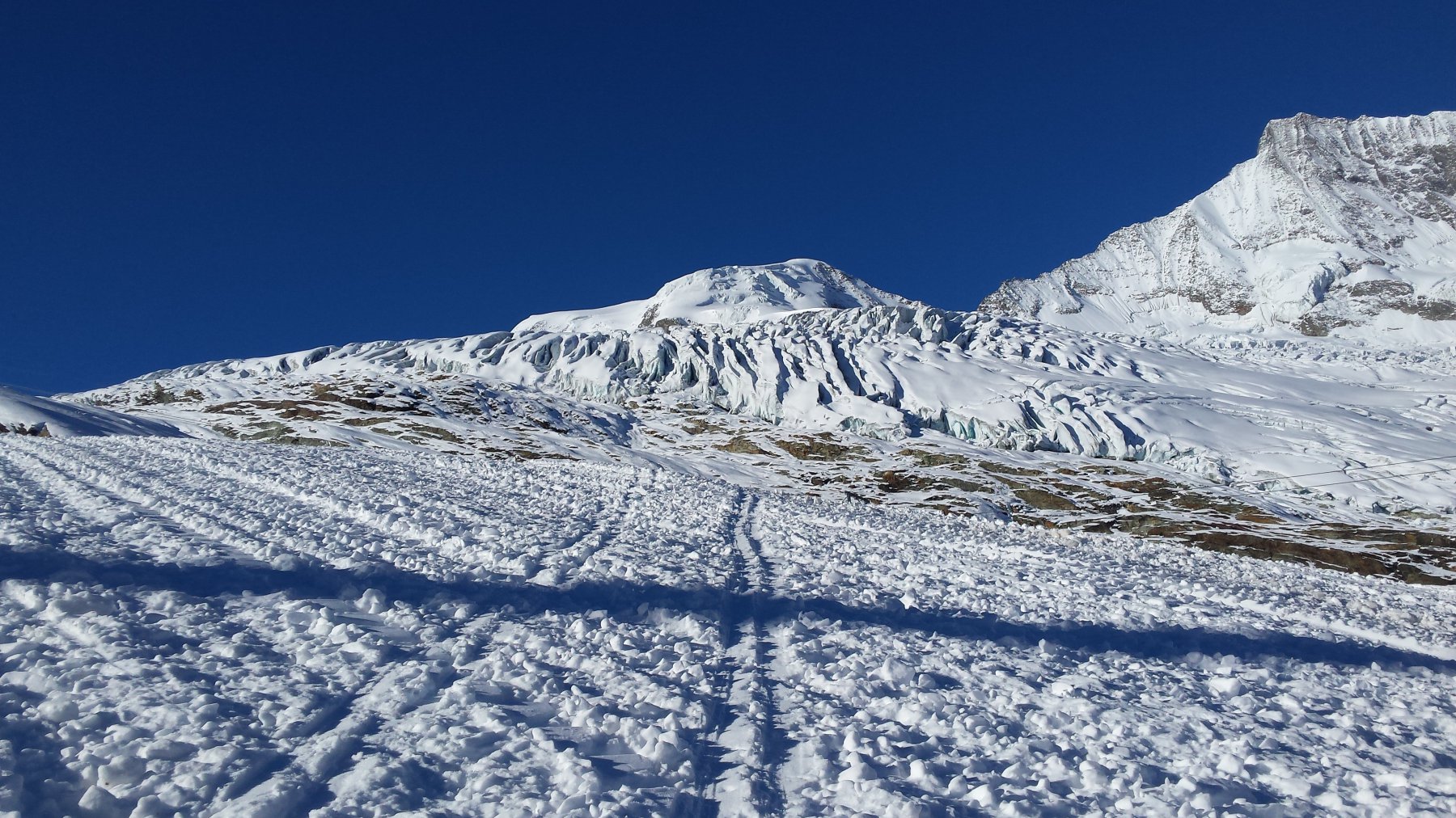 Risalire il ripido pendio in direzione ovest.Superato il pendio, con lungo traverso raggiungere la parte di ghiacciaio attraversato dagli skilift dello sci estivo ricongiungendosi così con l’itinerario di salita dalla Langfluehutte al quale si rimanda per la relazione di salita alla cima.