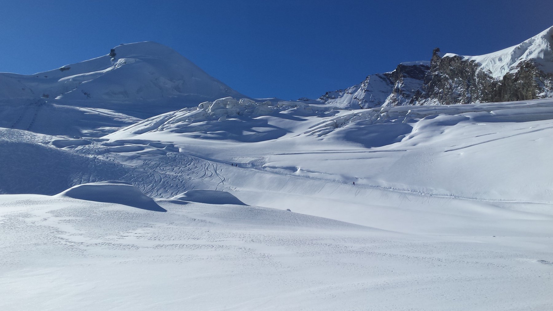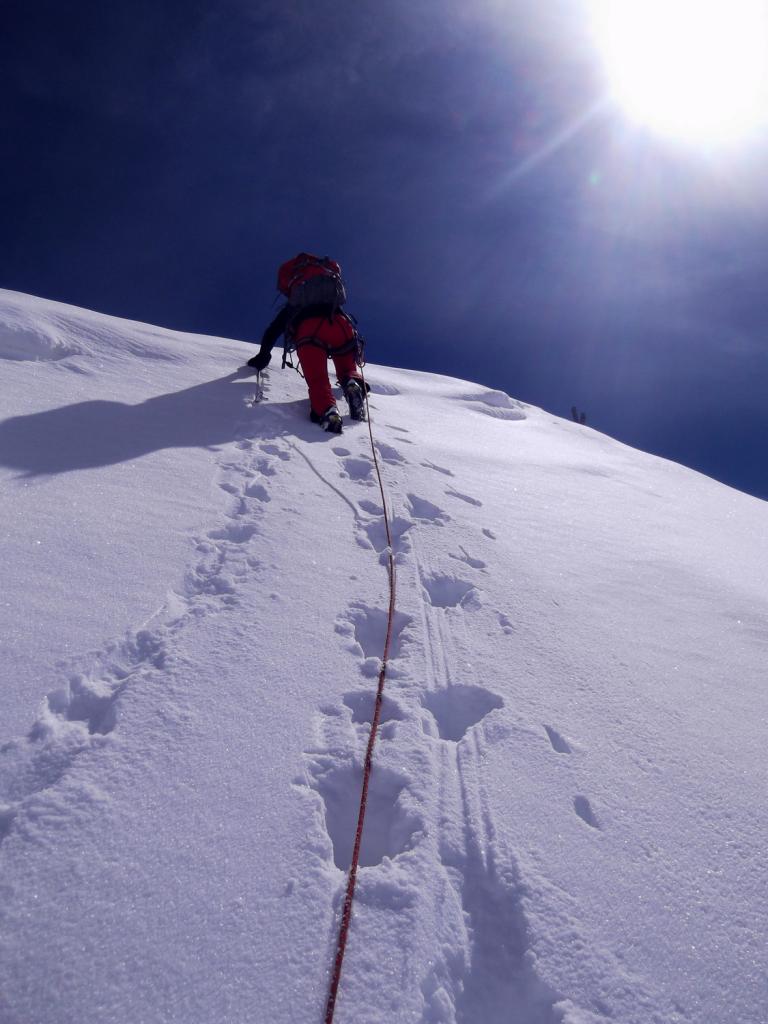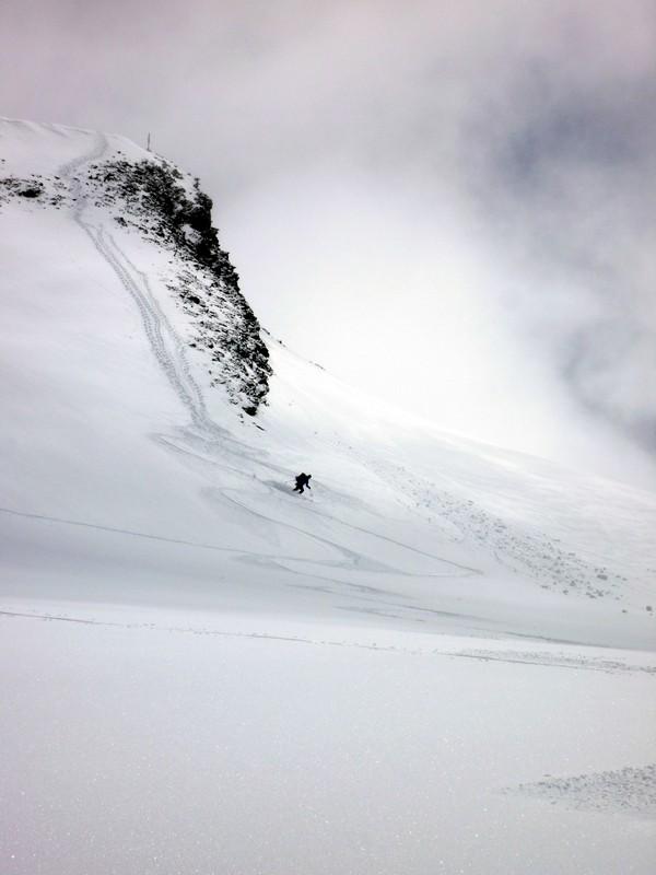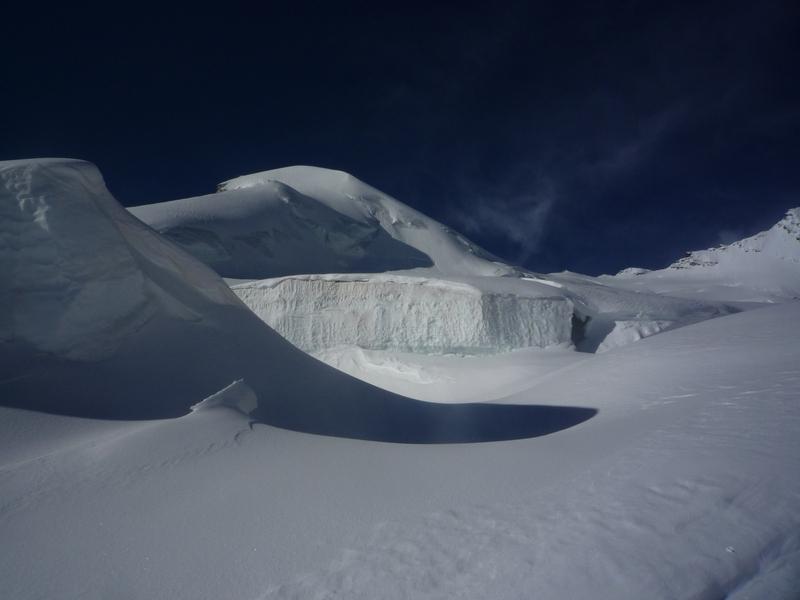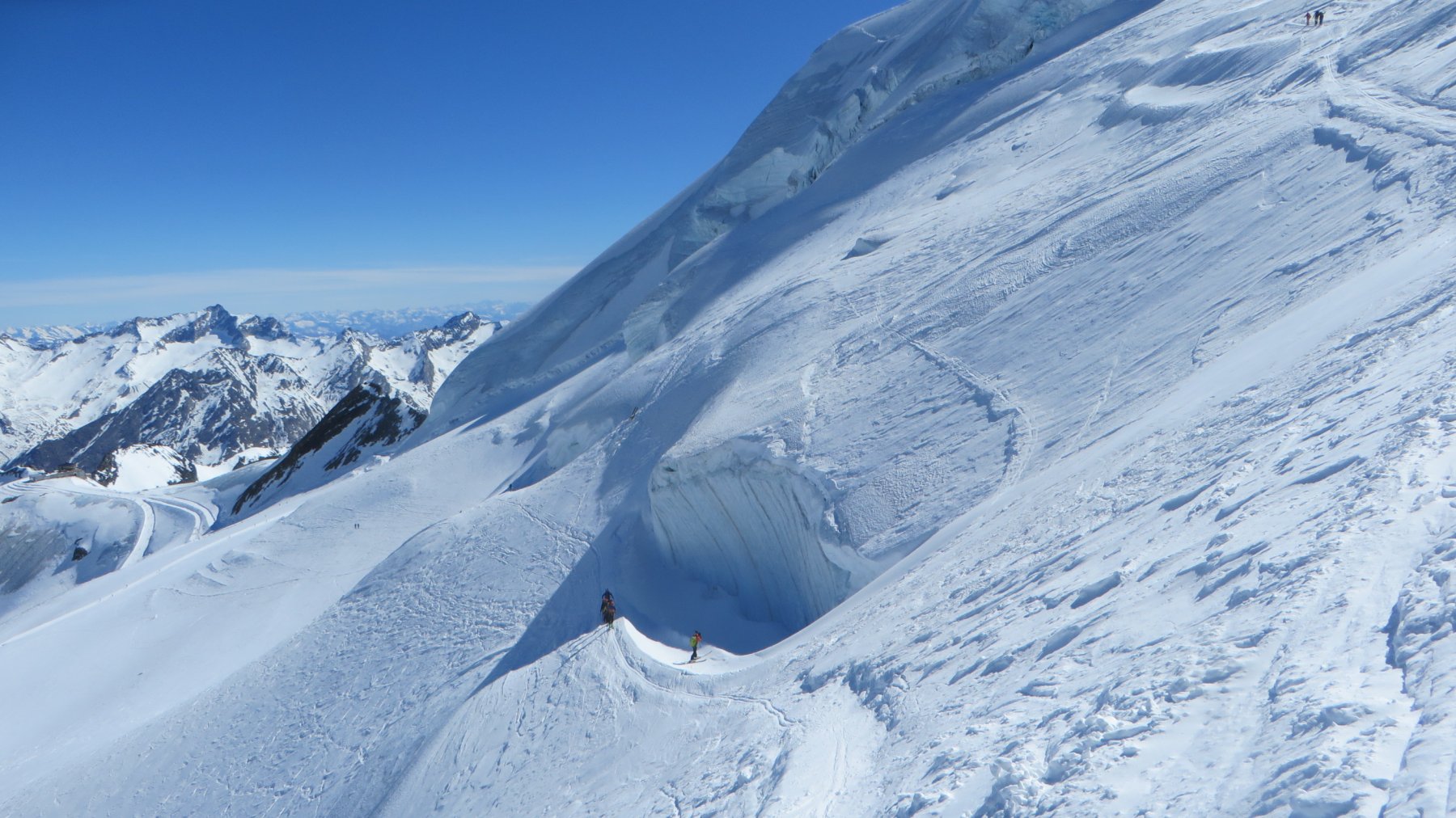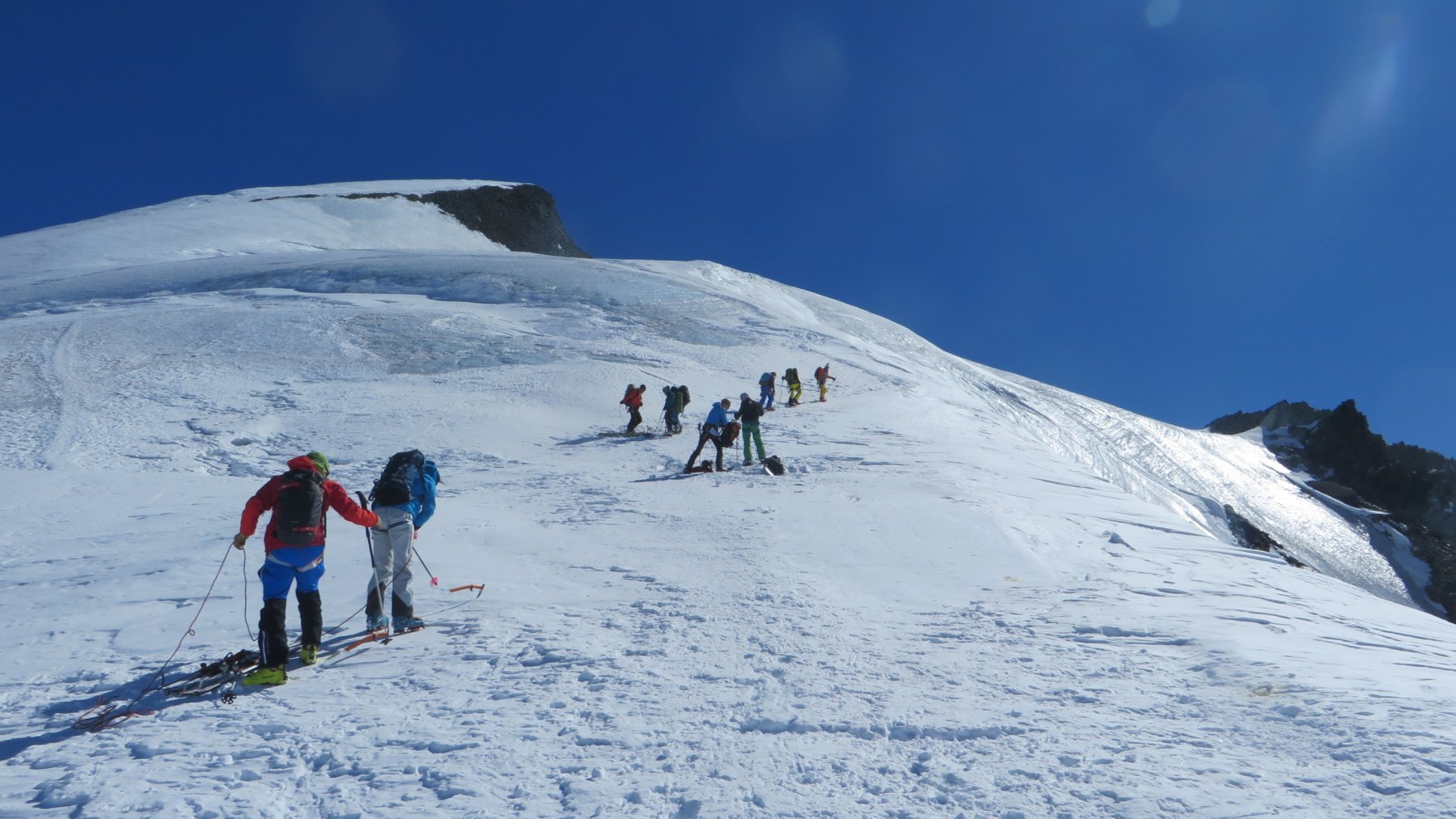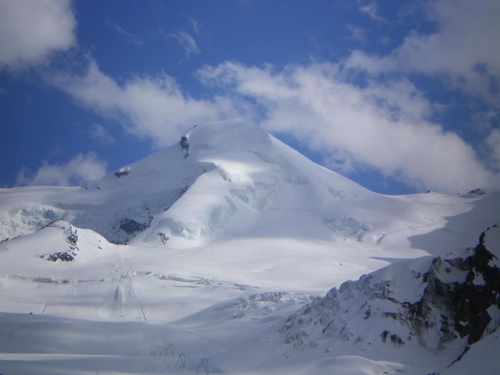Risalire il ripido pendio in direzione ovest.Superato il pendio, con lungo traverso raggiungere la parte di ghiacciaio attraversato dagli skilift dello sci estivo ricongiungendosi così con l’itinerario di salita dalla Langfluehutte al quale si rimanda per la relazione di salita alla cima.