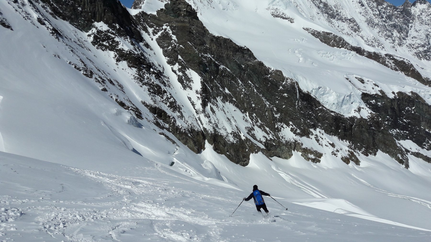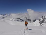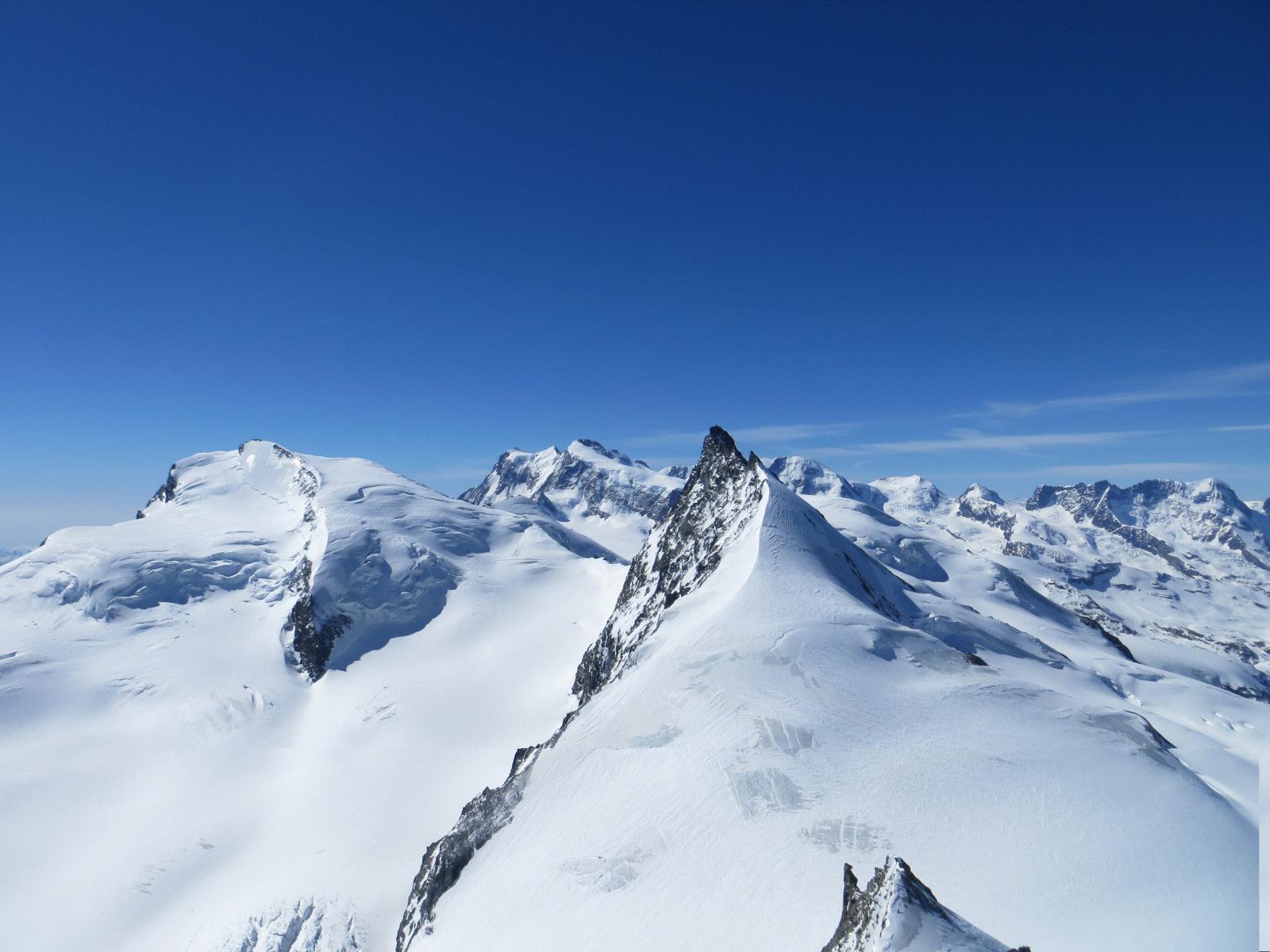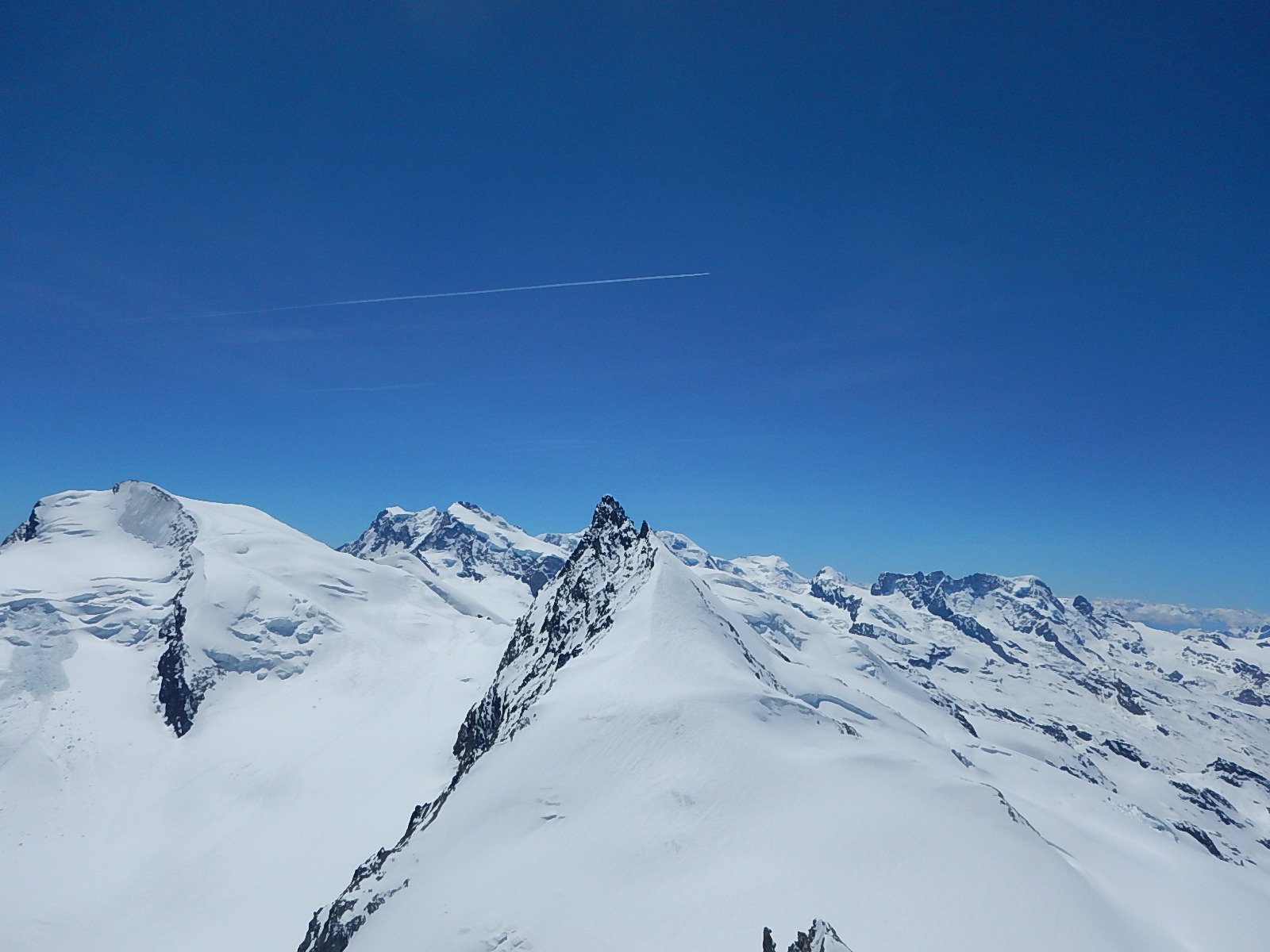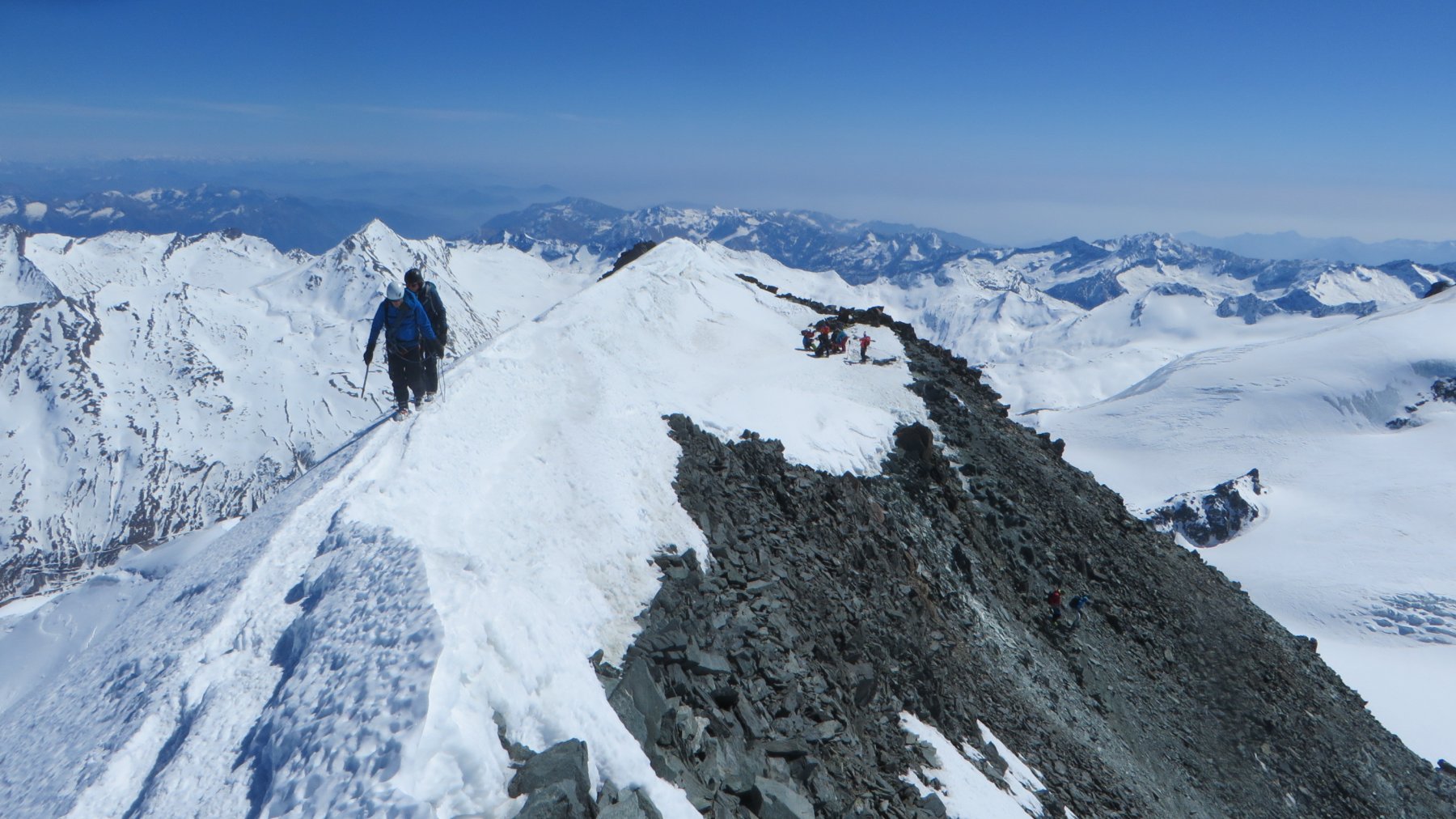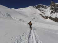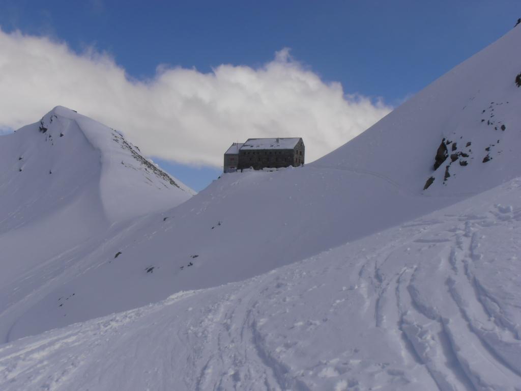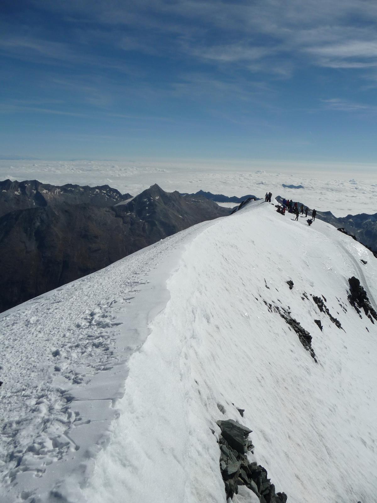 Risalire il ripido pendio in direzione ovest.Superato il pendio, con lungo traverso raggiungere la parte di ghiacciaio attraversato dagli skilift dello sci estivo ricongiungendosi così con l’itinerario di salita dalla Langfluehutte al quale si rimanda per la relazione di salita alla cima.