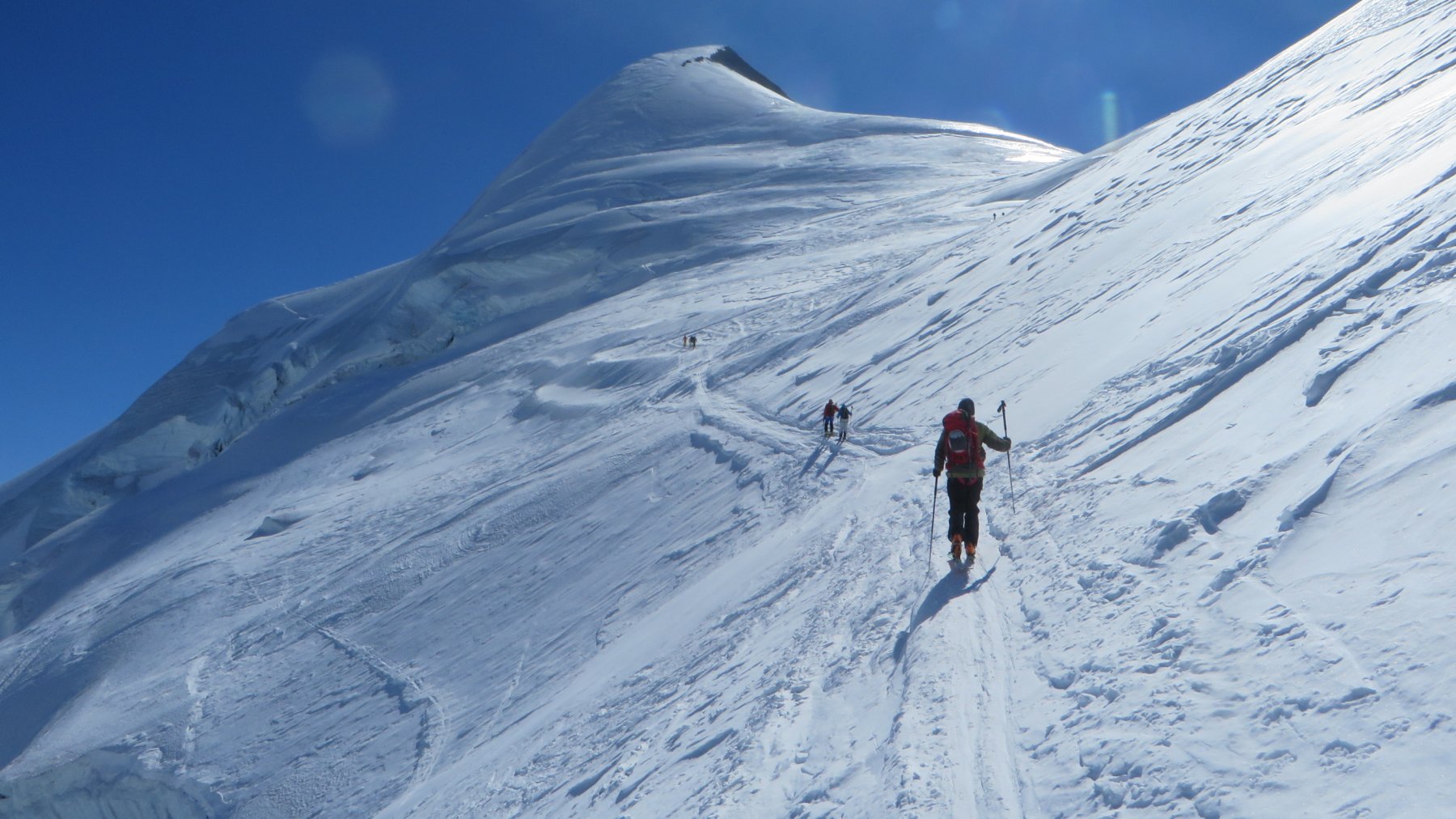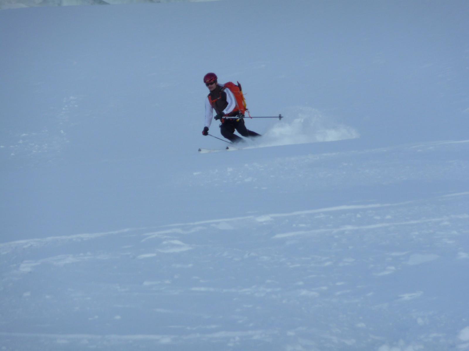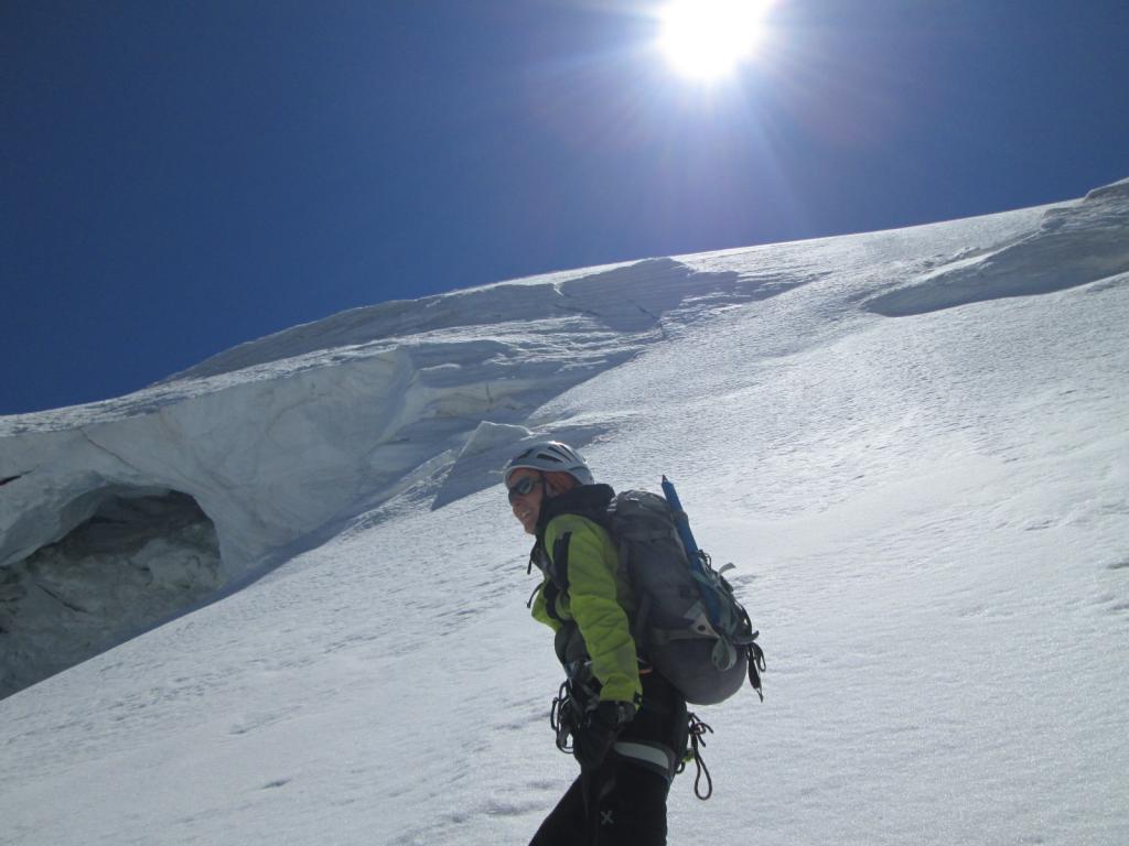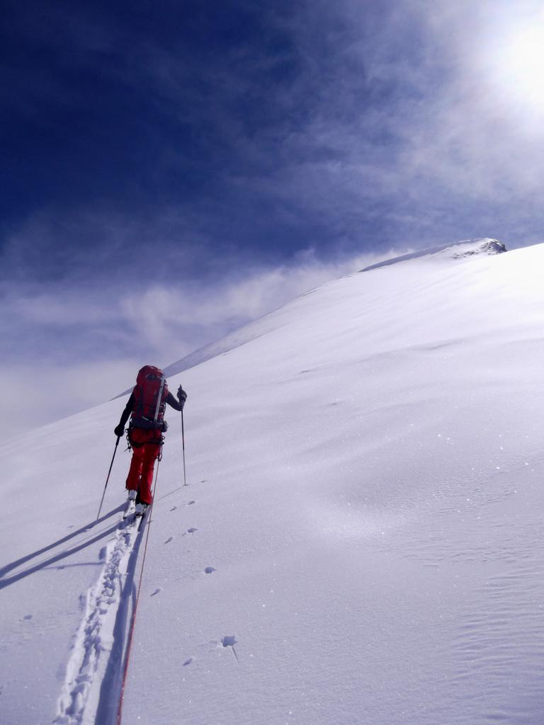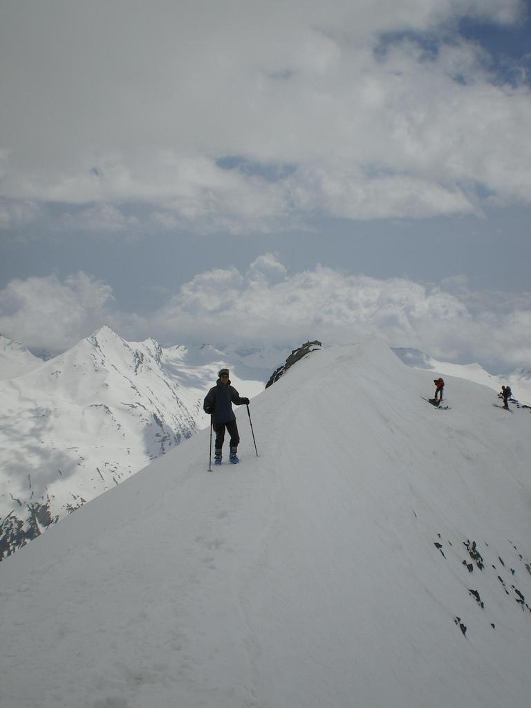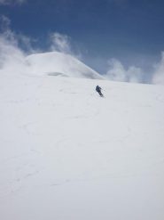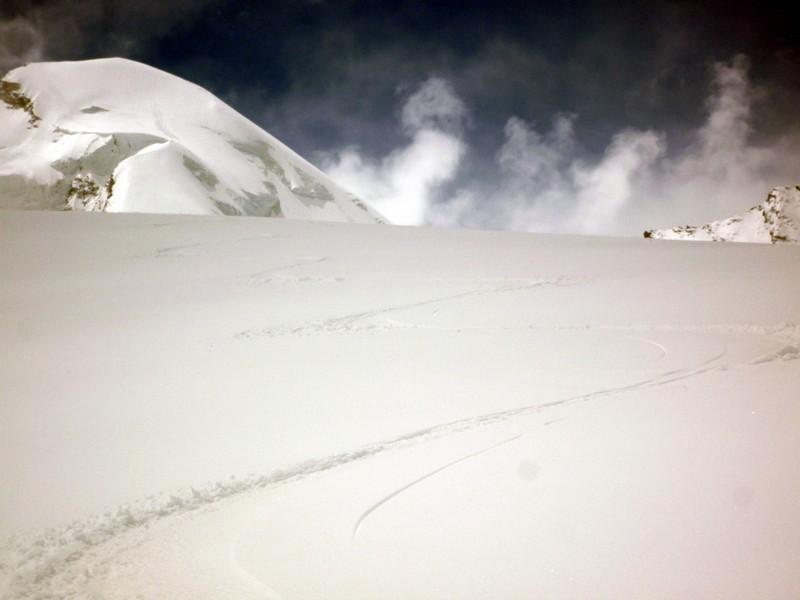 Risalire il ripido pendio in direzione ovest.Superato il pendio, con lungo traverso raggiungere la parte di ghiacciaio attraversato dagli skilift dello sci estivo ricongiungendosi così con l’itinerario di salita dalla Langfluehutte al quale si rimanda per la relazione di salita alla cima.