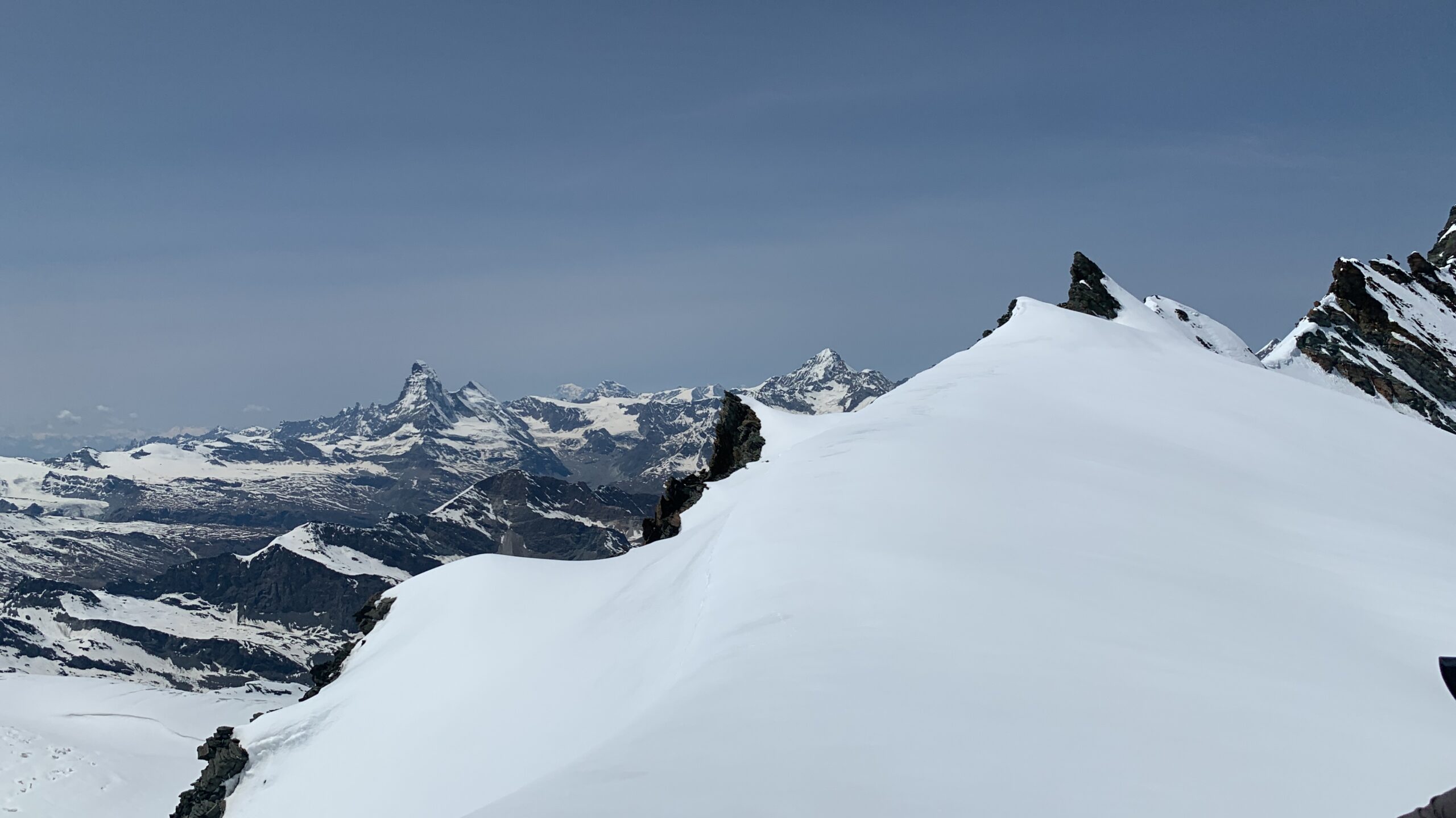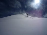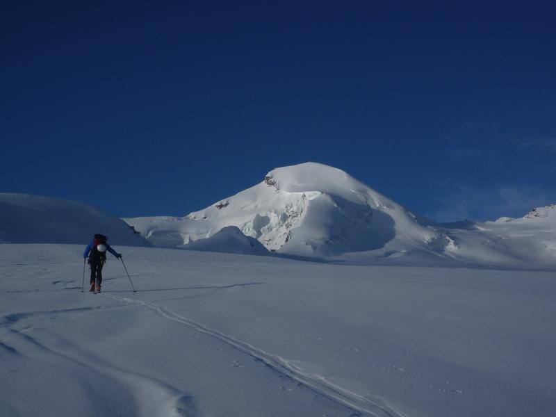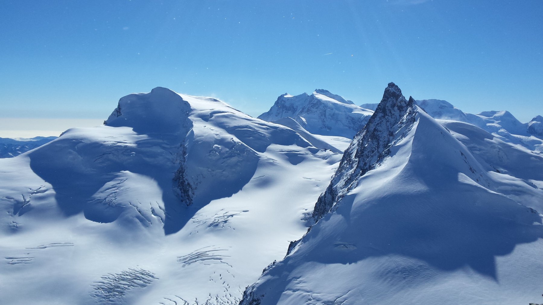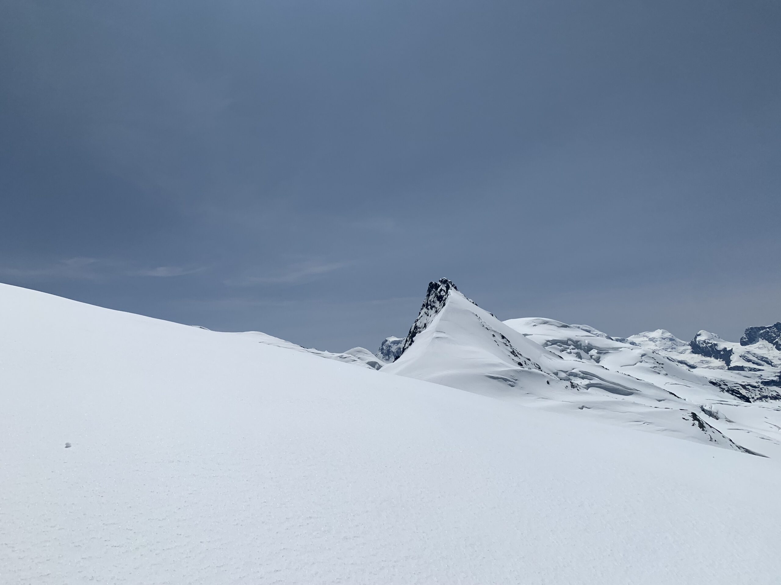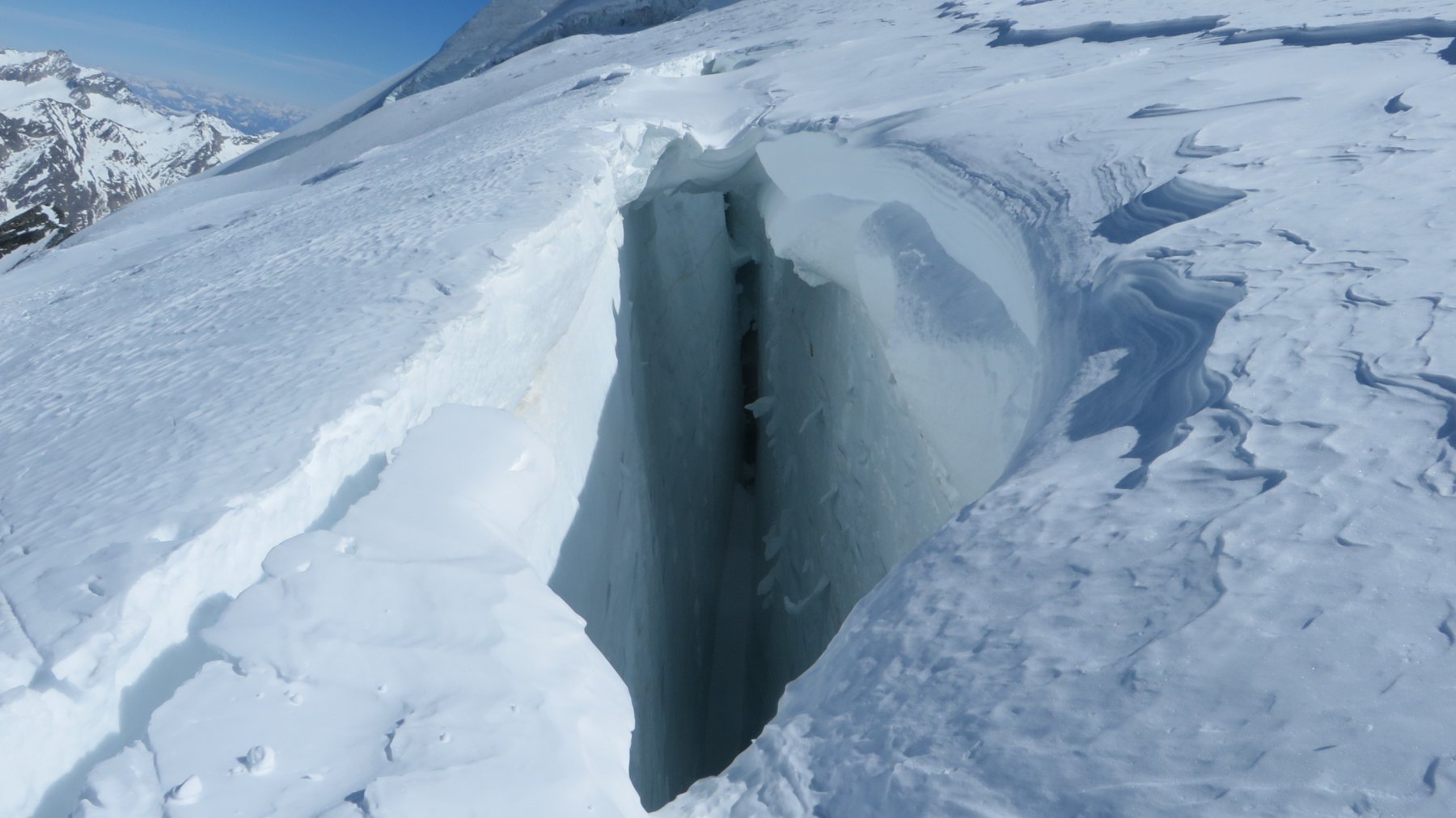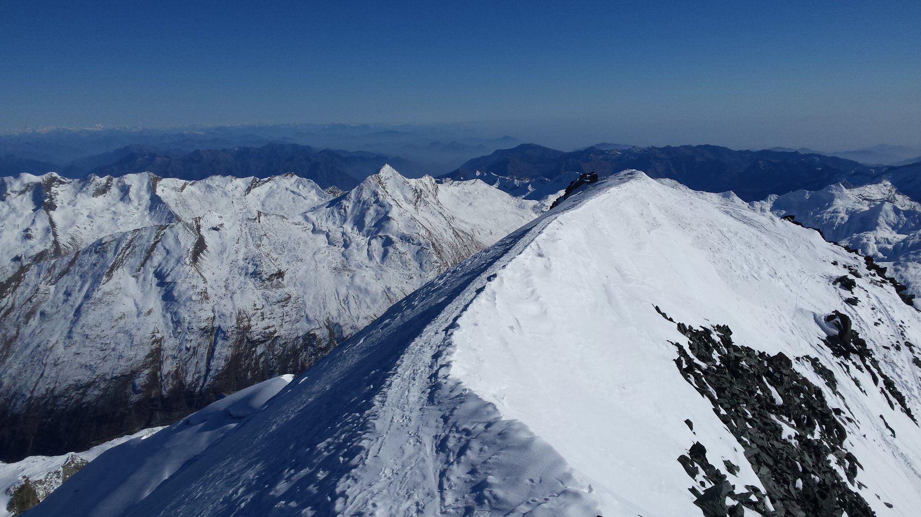Risalire il ripido pendio in direzione ovest.Superato il pendio, con lungo traverso raggiungere la parte di ghiacciaio attraversato dagli skilift dello sci estivo ricongiungendosi così con l’itinerario di salita dalla Langfluehutte al quale si rimanda per la relazione di salita alla cima.
