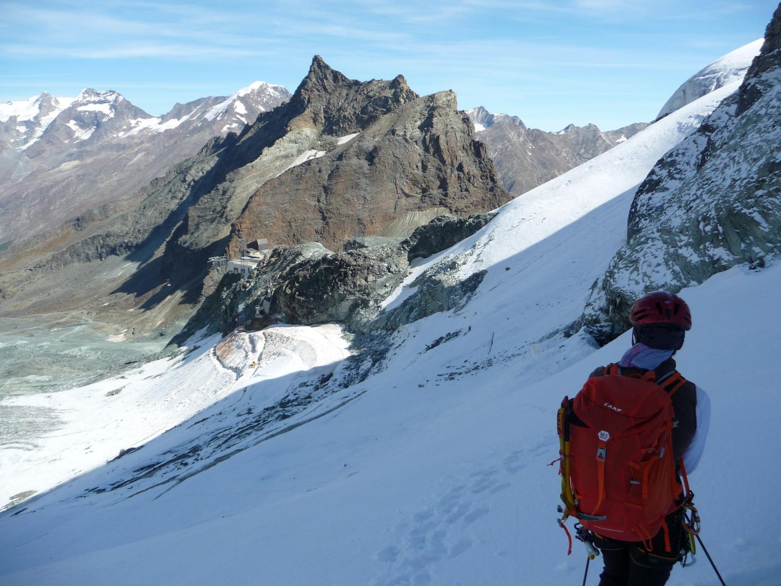 Salita la cresta est scendiamo fino a Felskinn per la via normale. Neve dura con una spalmata di neve fresca che in alcuni tratti arriva ai 10cm. Parte centrale sulle piste e poi di nuovo farina su fondo duro che consente di arrivare ancora a Felskinn sci ai piedi, occhio all’ultimo tratto che sotto 2cm di farinella c’è il ghiaccio.