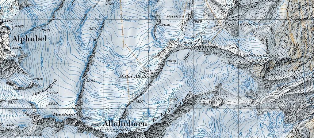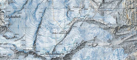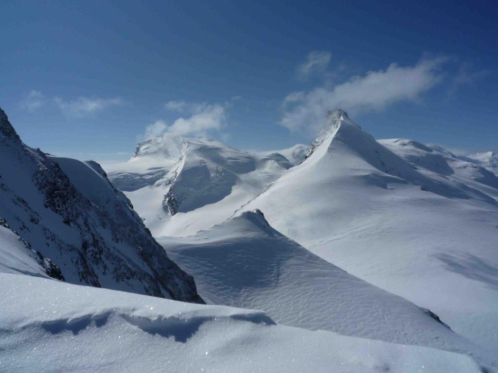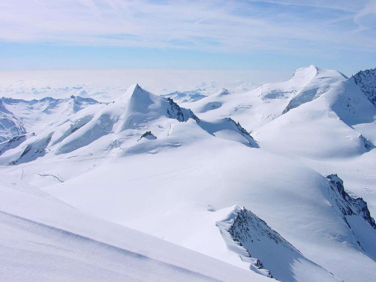 Dalla Langfluehutte si risale l’ampia conca glaciale seguendo il tracciato dello skilift. A partire da quota 3250 la pendenza si accentua e si incontrano i primi crepacci.