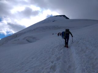 Saliti in giornata. Dormito nel parcheggio la sera prima. Preso la prima funivia alle 6.20. Alle 13 ritornati in paese. Salita veloce, condizioni ottime, la scala di legno non c’è ancora, poco ghiaccio, in cima qualche pietra fuori. Una salita molto semplice, ambiente bellissimo, tranne la prima parte sulle piste. Partiti dal ristorante girevole
