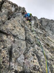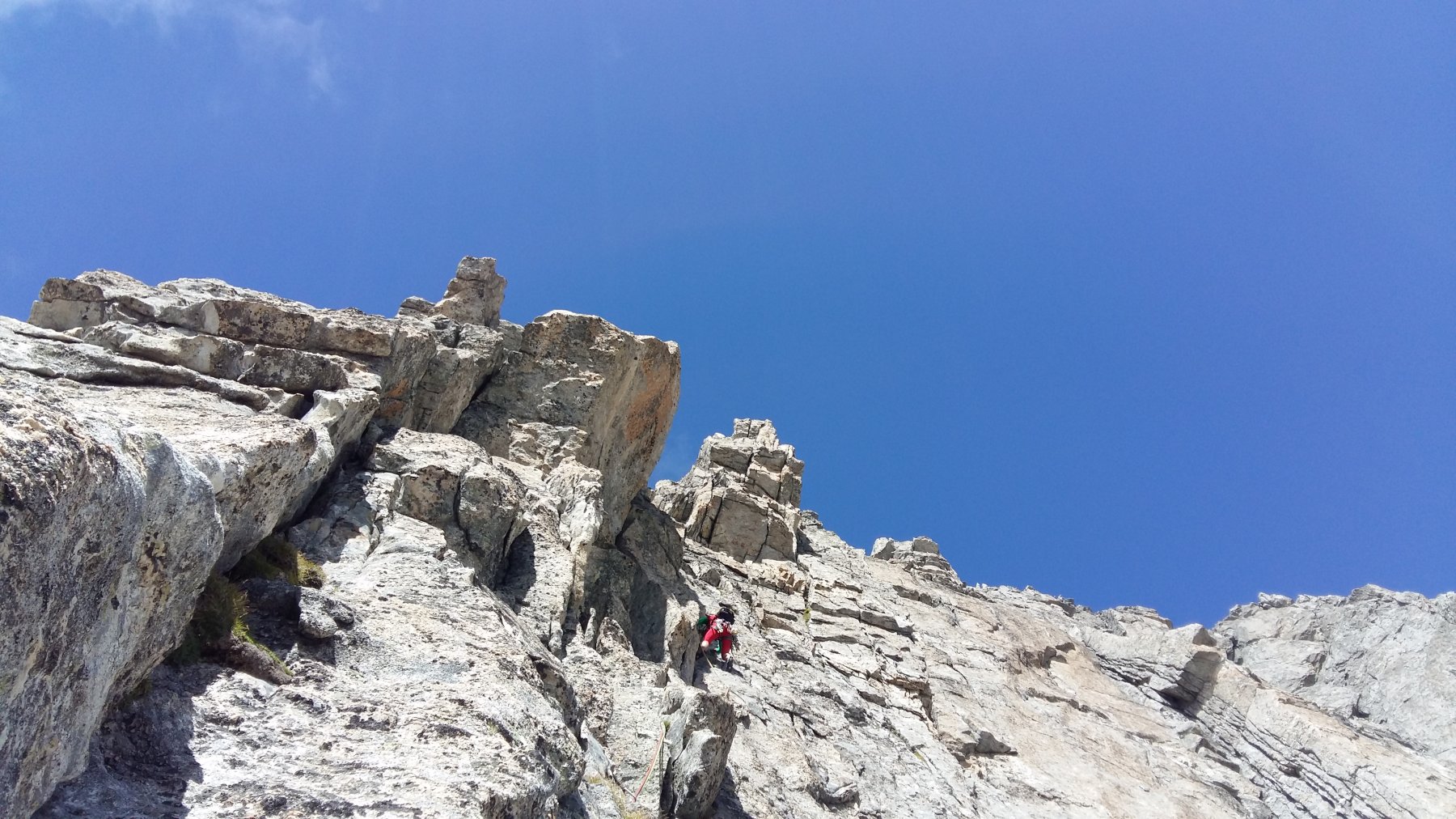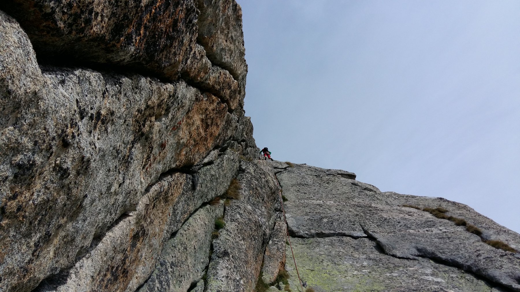 - L14: 40m. Proseguire per cresta fino ad una placca . sosta 2 chiodi. (IV)