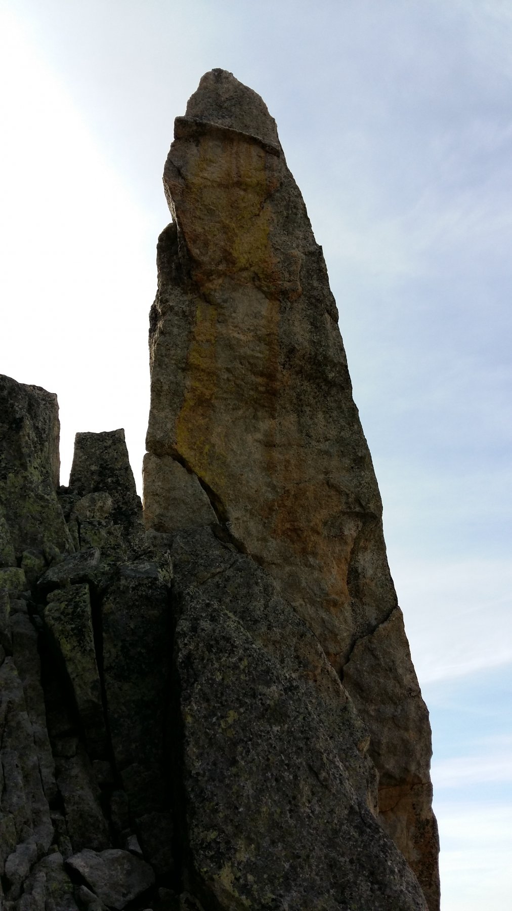 - L5: 40m. Dalla sosta si scende lungo la cengia ovest 10m. (sosta) e salire la parete sopra (belle lame ma alcune suonano vuote) fino a prendere di nuovo lo spigolo. Sosta a spit. (IV+/V)
