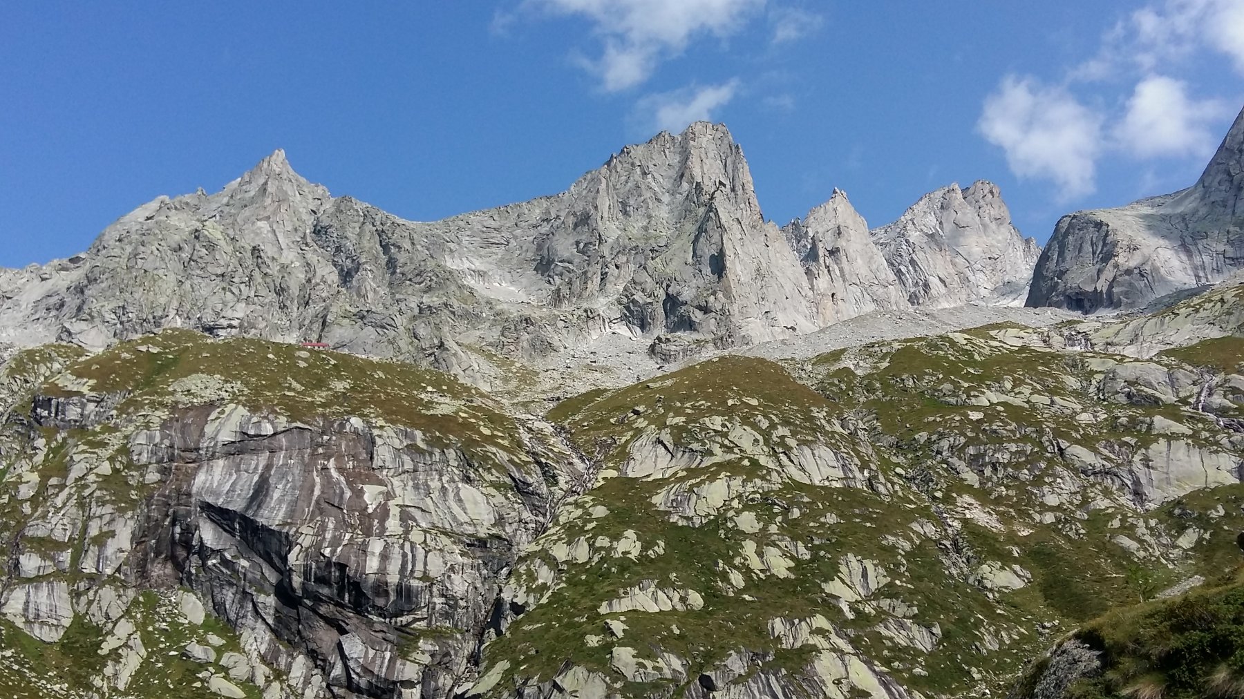 Sempre seguendo gli ometti si gira verso Sud e seguendo ora anche qualche vecchio segno rosso sbiadito, tra pendii pietrosi, saltini e cengie, si raggiunge l’ultimo pendio pietroso che porta alla base della parete sud-ovest. Facilmente ora si raggiunge il rifugio. ( circa 1,15 h.)