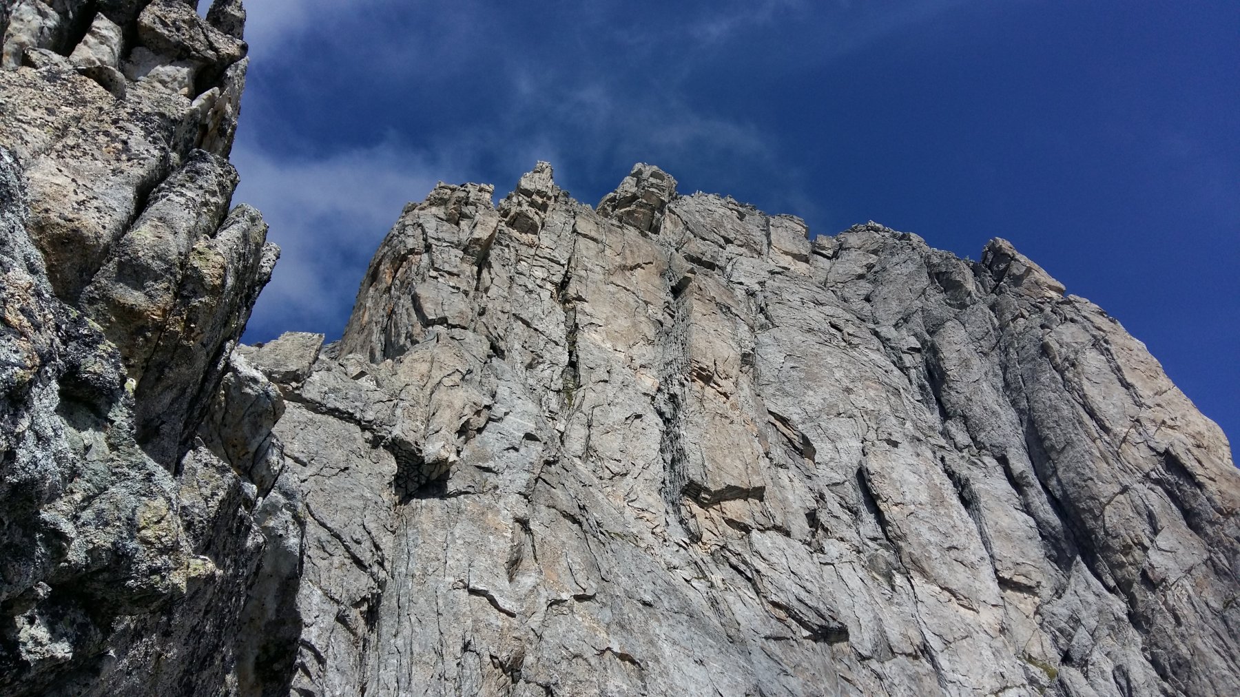 - L12: 45m. Salire e poi traversare un po’ a dx e proseguire in parete fino alla cresta un po’ a sx. Vari chiodi. sosta su 2 chiodi. (V+)