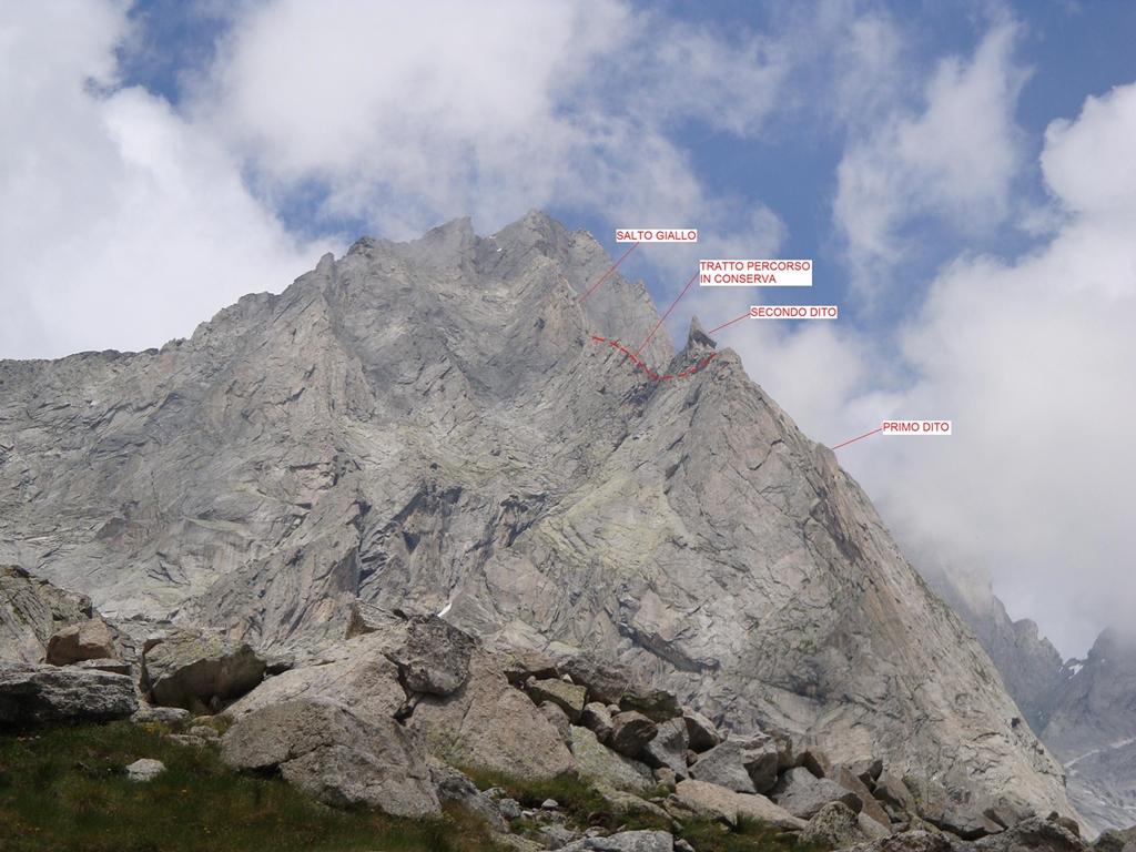 Si prosegue ora in conserva protetta per circa 120 m. sul versante ovest fino all’intaglio a monte del 2° dito sosta su chiodo, un chiodo piu’ in basso nascosto.(II)
