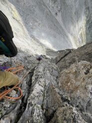 - L7: 50m. Proseguire lungo il diedro. Sosta su spit. (IV)