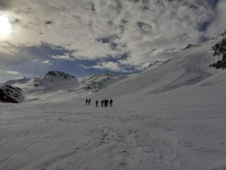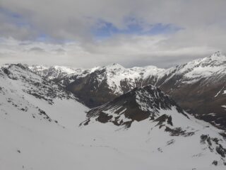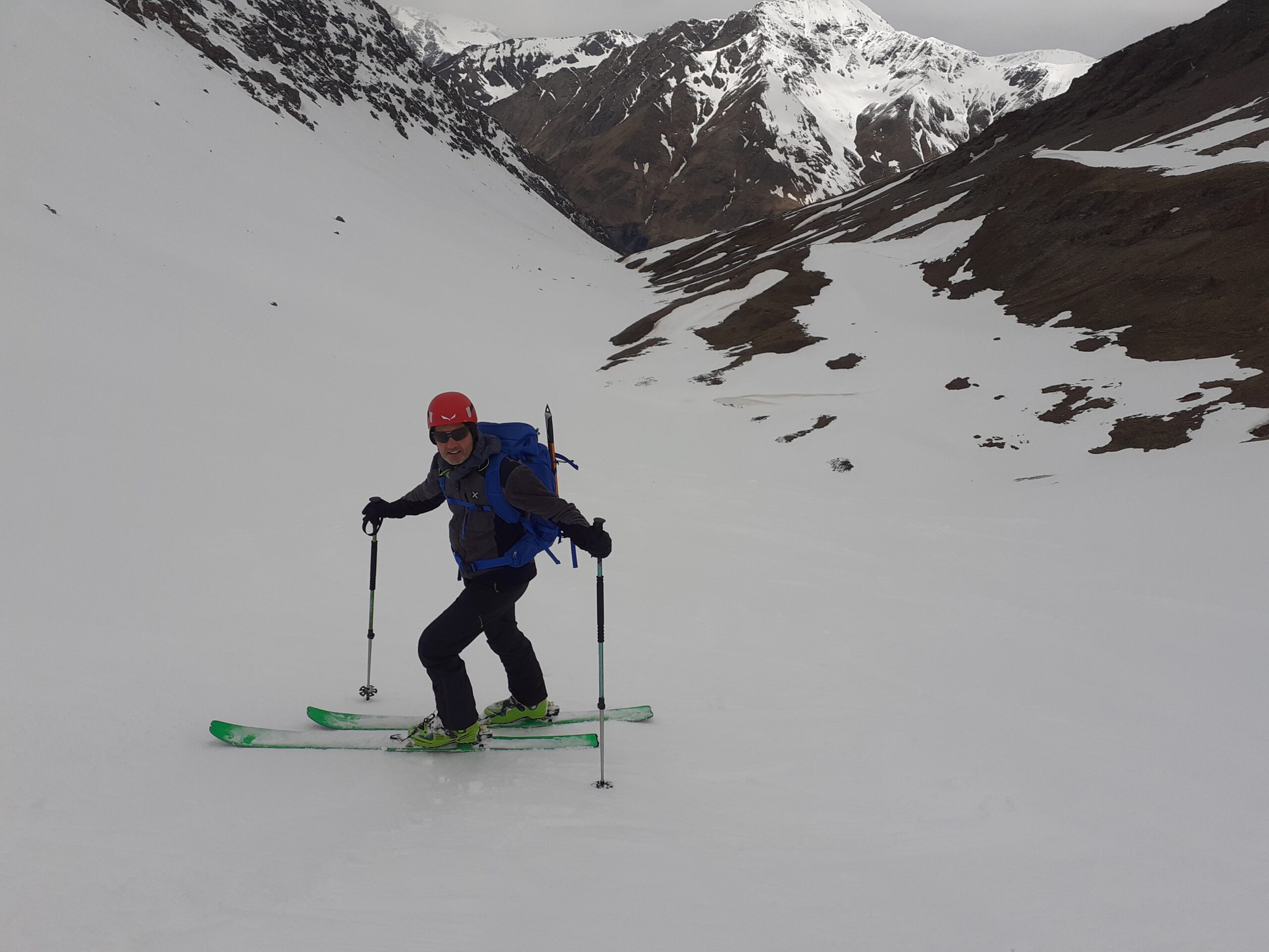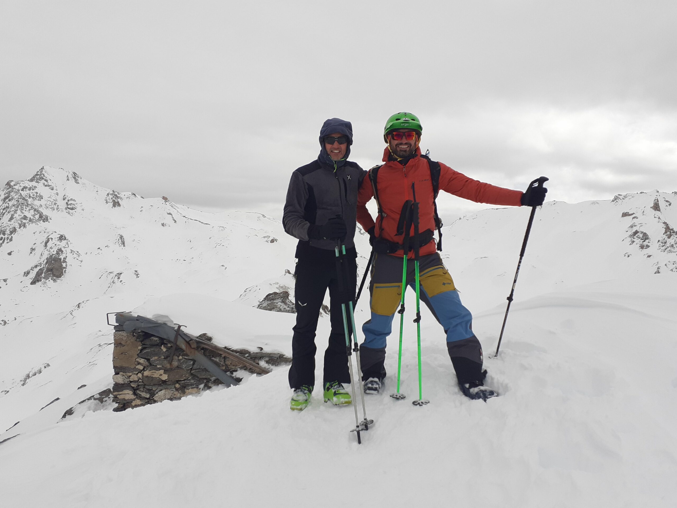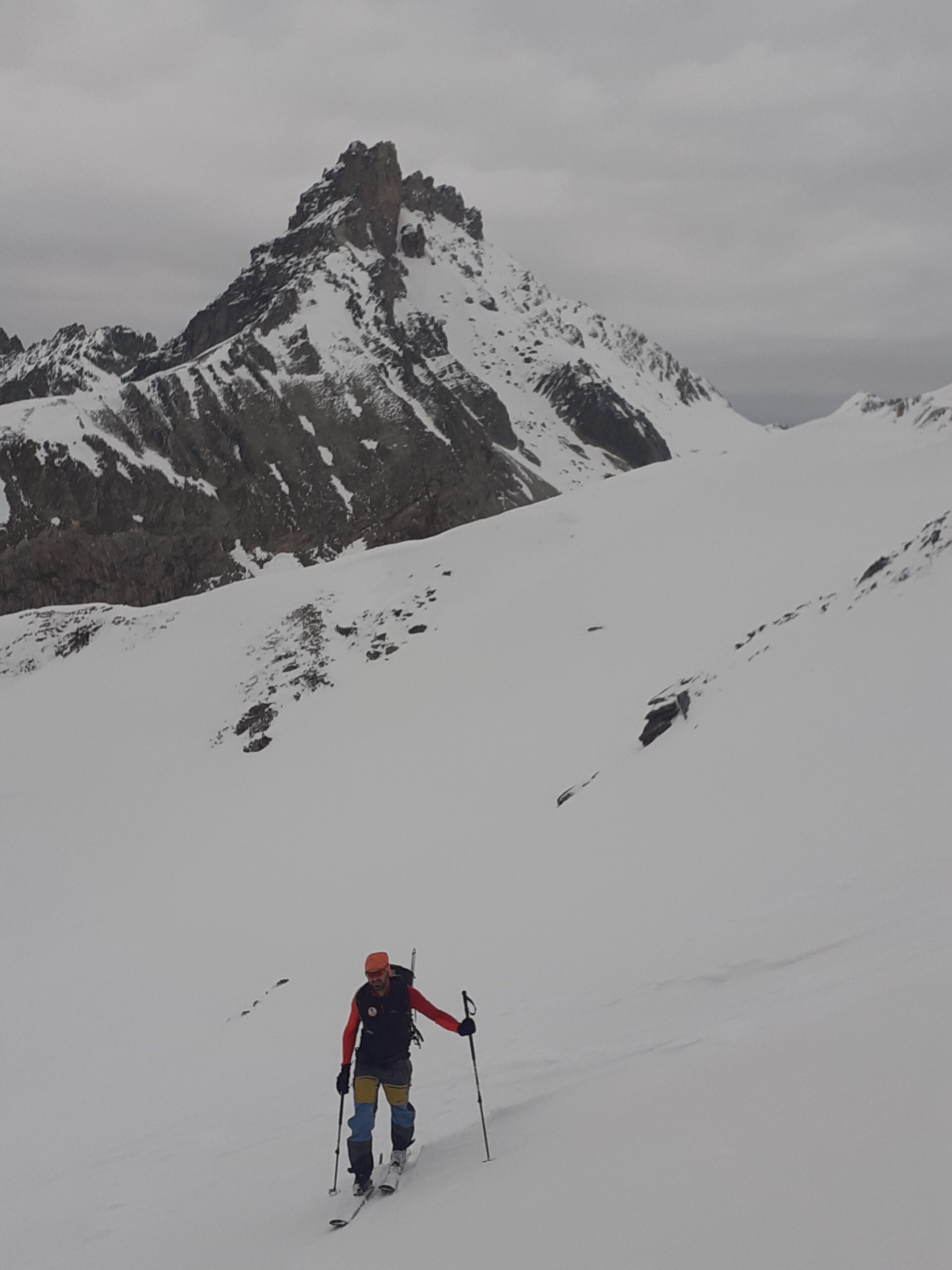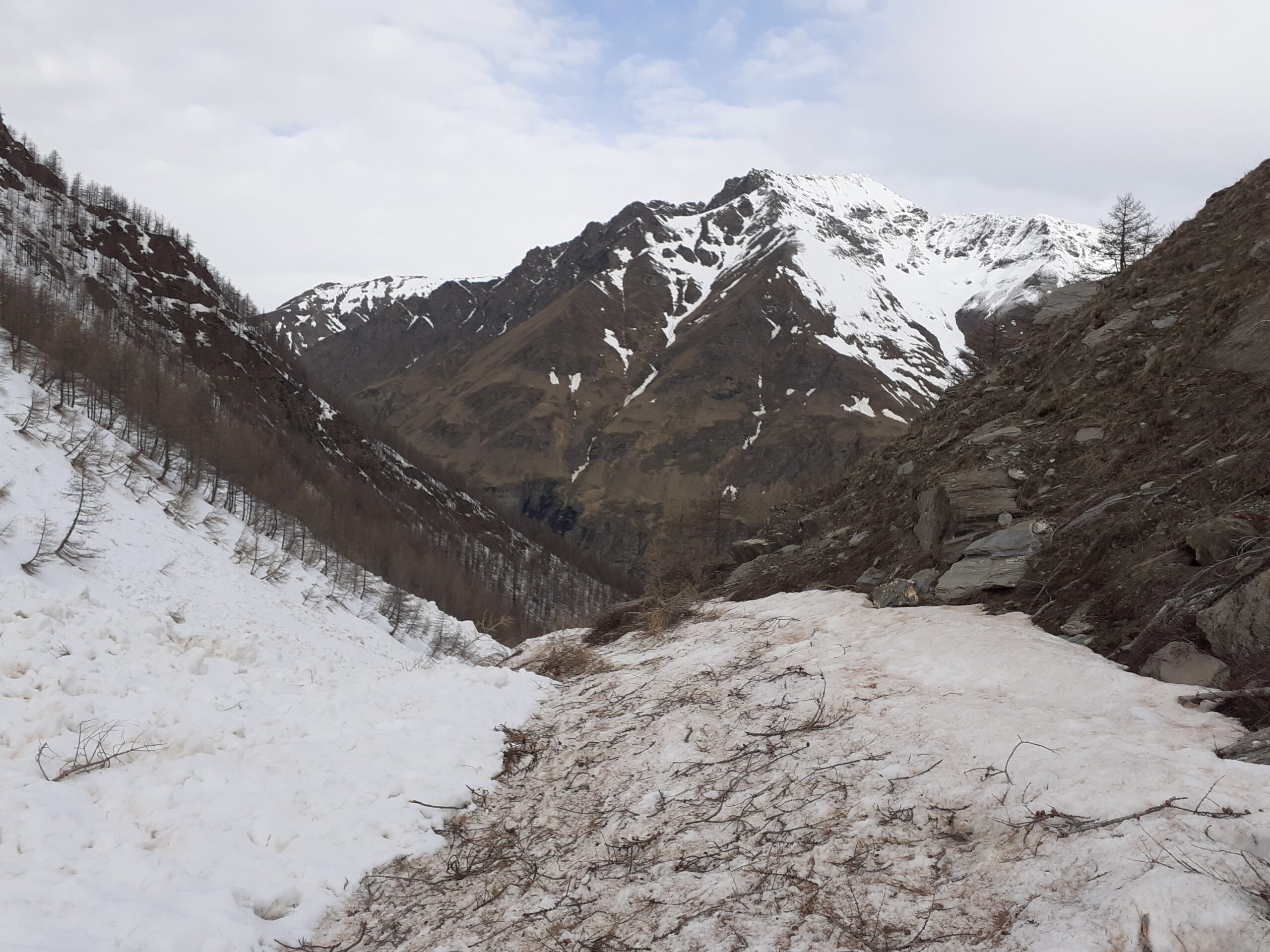 Si parte dal tornante del ponte sul torrente con gli sci ai piedi salendo sui residui di valanga. Per progredire in sicurezza è consigliabile utilizzare i rampant, come pure nel ripido pendio che conduce in vetta. Ampia visibilità ma cielo sempre coperto, con ventilazione quasi assente. Discesa condizionata dalla luce ingannevole e da un leggerissimo nevischio. Iniziata poco dopo le 11, con tratti di farina alternati a crosta portante e non nel pendio sommitale. Da quota 2.700 in giù manto nevoso ancora duro per il rigelo ma comunque ben sciabile e divertente. Nessun problema per attraversare i coni delle enormi valanghe presenti, già tracciati dai numerosi passaggi e ammorbidita. Per concludere la giornata un bel pic nic al parcheggio, oggi riservato alle sole Dacia. Con Fabio, Tiziano , Alfonso, Lelloz, Enrico, Roby e Alessandra. E’ stato perso nel torrente poco dopo la partenza della gita un casco Urge da mtb grigio e giallo. Si è infilato nell’acqua che scorre sotto la neve. Chi lo trovasse può contattare il mio amico al 393.990.30.66 e sicuramente sarà ricompensato con qualche birra!